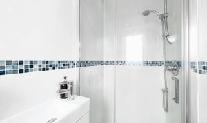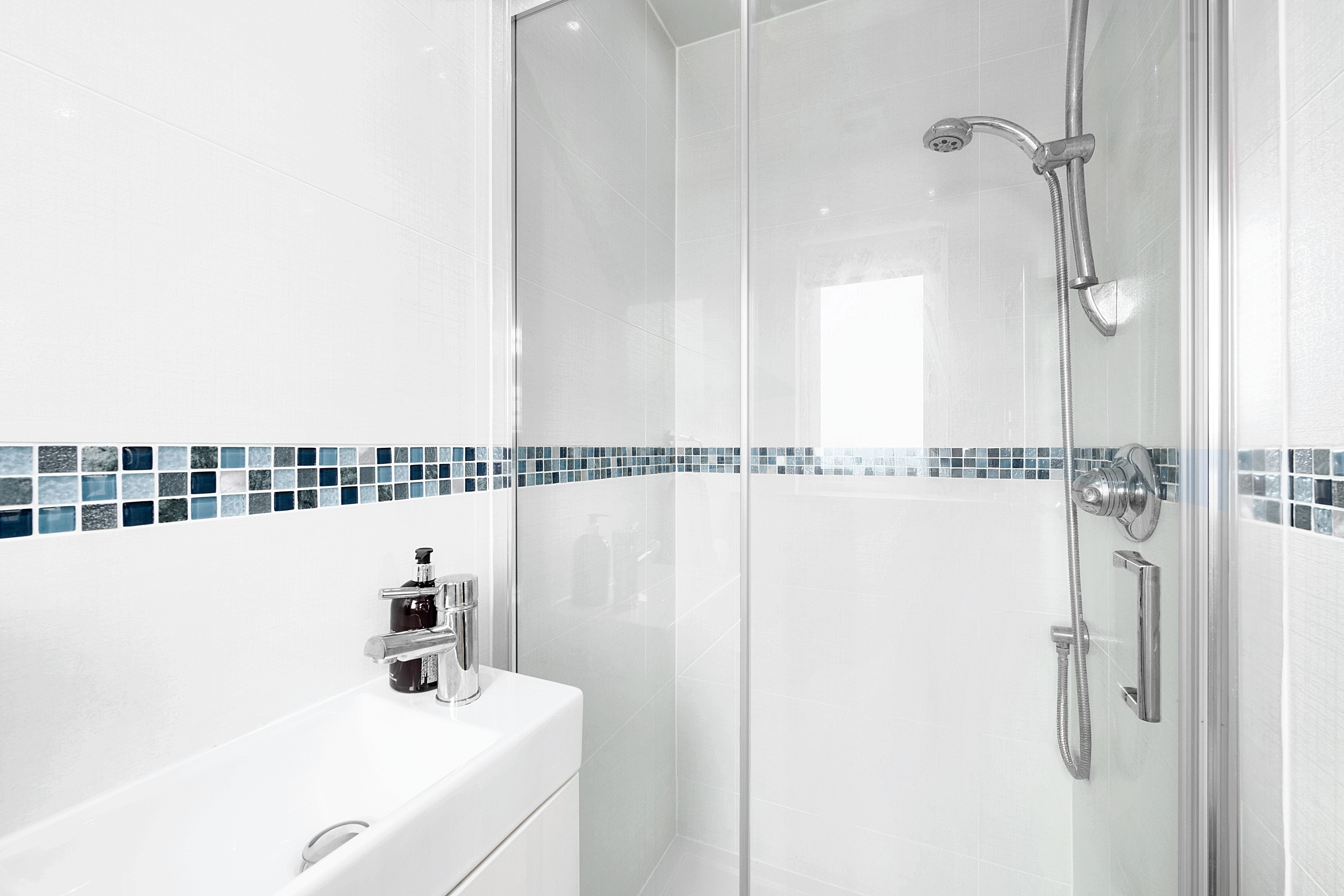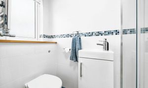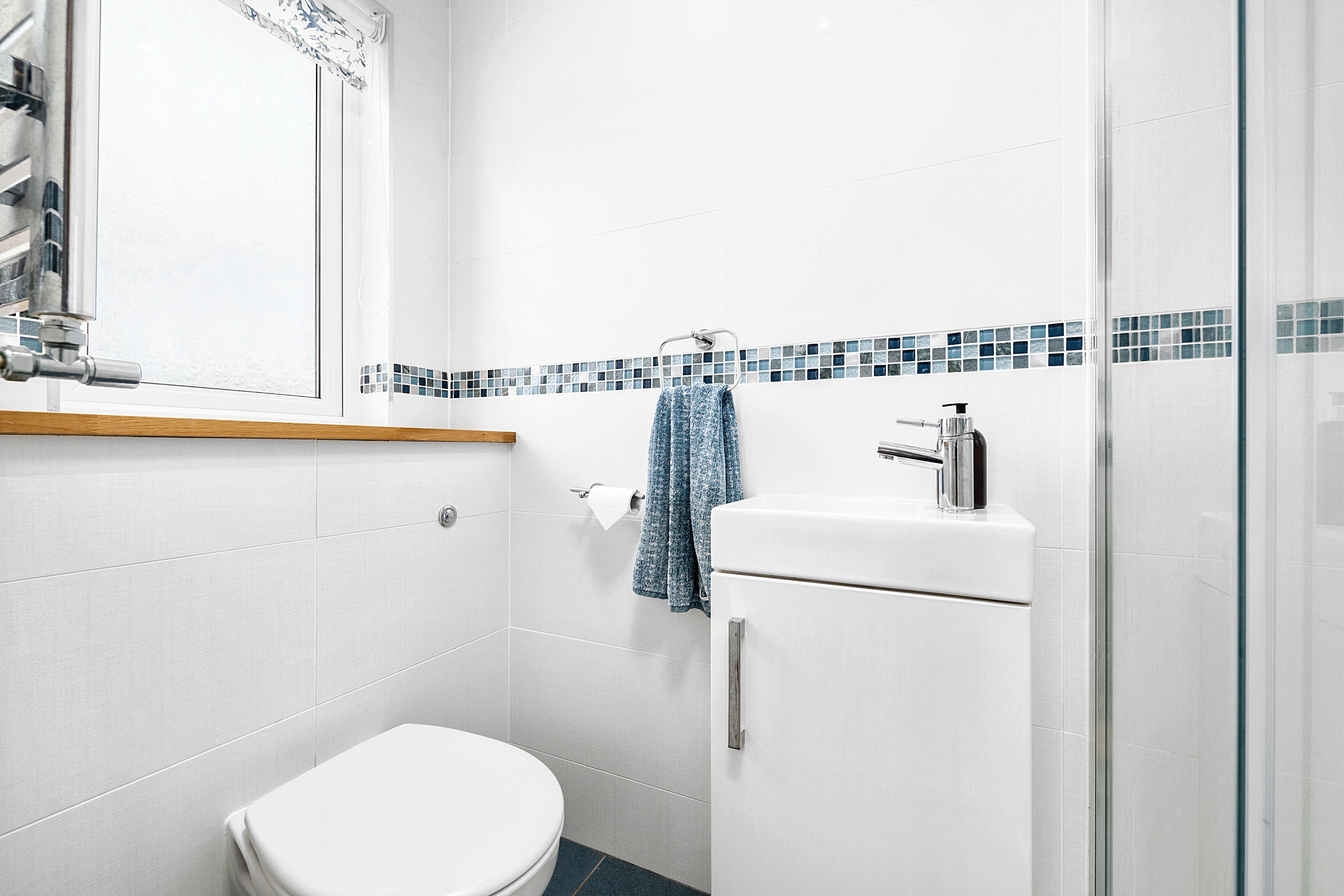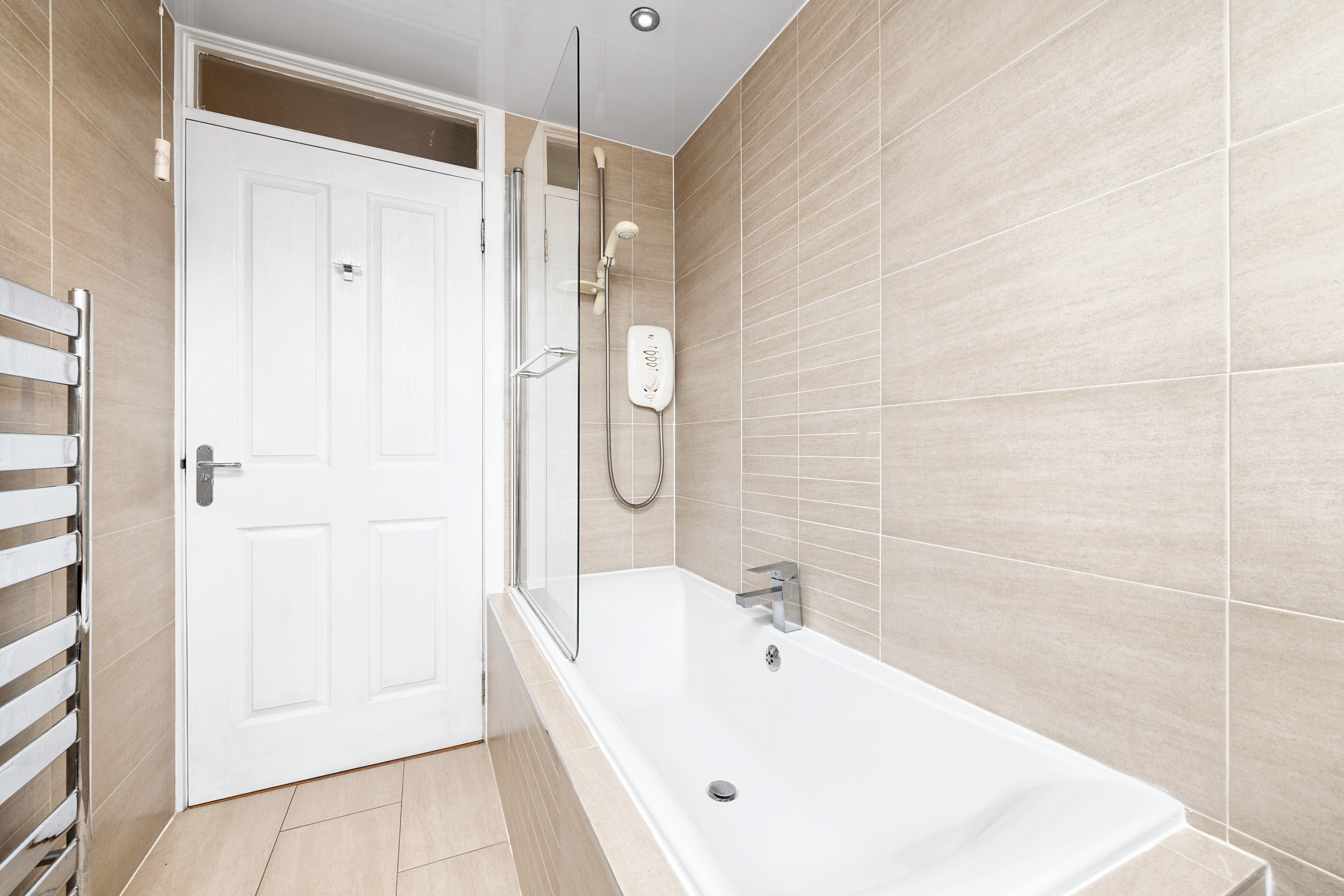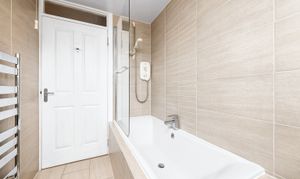 The family bathroom is stylishly finished with fully tiled walls and features a contemporary back-to-wall WC and a sink set into a practical vanity unit. A bath with an overhead electric shower and glass screen provides convenience, while a chrome heated towel rail adds a touch of modern comfort.