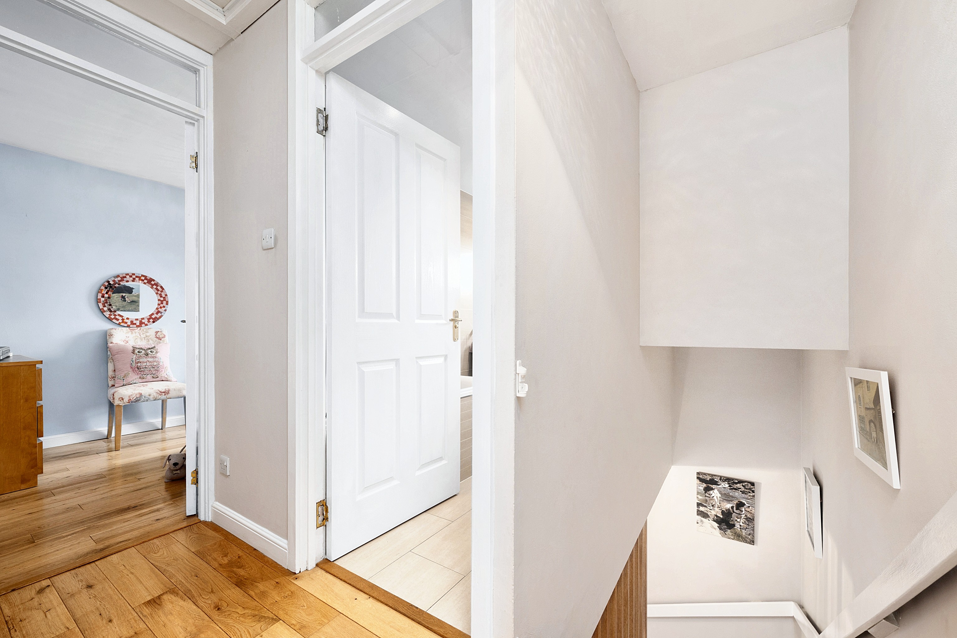 The upper hallway provides access to three well-proportioned bedrooms and the family bathroom, along with a hatch to the loft space for additional storage.