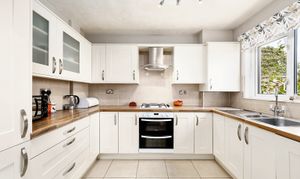 The kitchen is well-appointed with a front-facing window that allows natural light to fill the space. Offering excellent functionality, it benefits from extensive worktop space and a range of integrated appliances, including a double oven with gas hob, dishwasher, and fridge freezer.