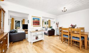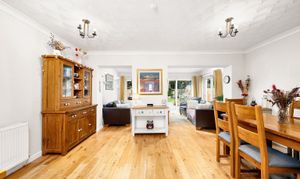 The generously proportioned dining and family room offers a fantastic open-plan space, finished with beautiful wooden flooring that adds warmth and character. This impressive area flows seamlessly into the lounge, set within the extended part of the home, creating a superb layout for both everyday living and entertaining. The sense of space and openness makes this a truly versatile room, ideal for family gatherings or more formal occasions.