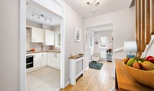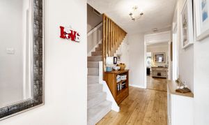 The entrance hallway sets a welcoming tone for the home, filled with natural light from a front-facing window. From here, you have access to the kitchen, the convenient downstairs shower room, and onward to the spacious dining/family area and lounge. A handy storage cupboard provides practical space for everyday essentials, while a carpeted staircase leads to the upper level.