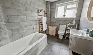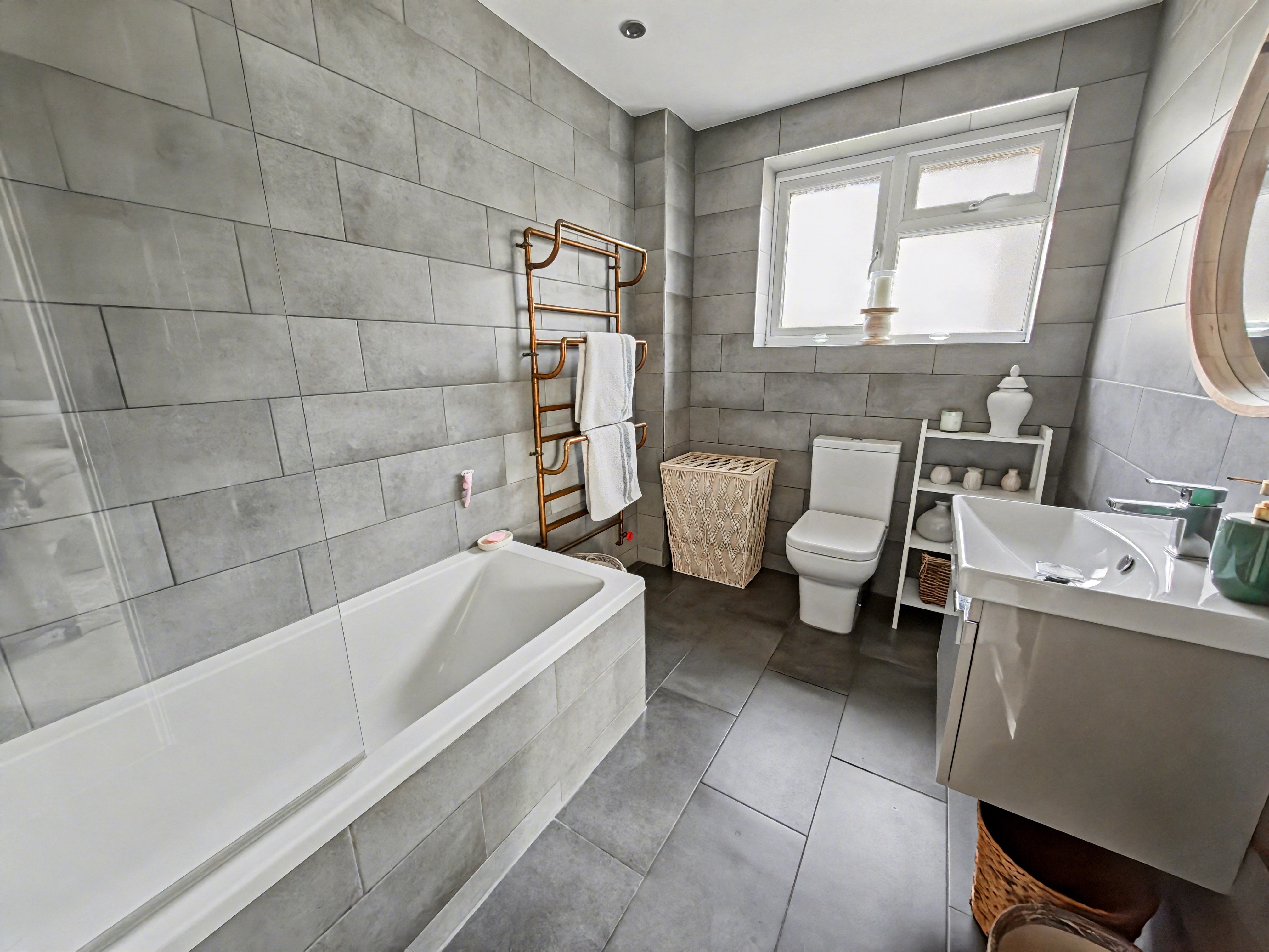 Double glazed window to rear, panel bath with shower over, low level WC and wash hand basin, tiled flooring and walls
