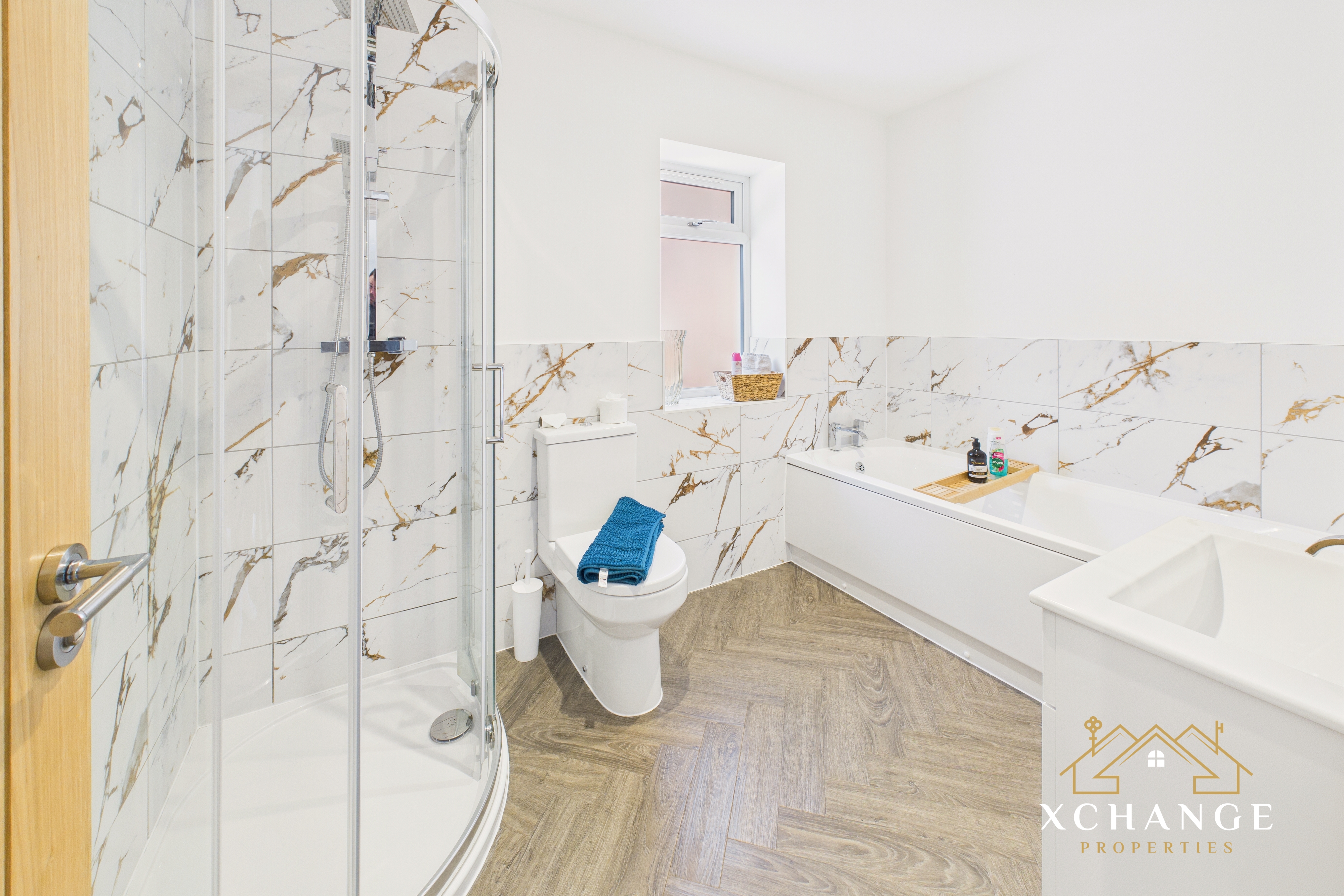 A contemporary family bathroom, finished with sleek tiling and a modern suite including bath, shower cubicle, vanity sink and WC, serves the remaining bedrooms.