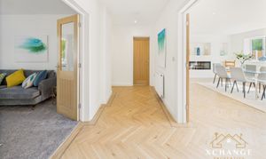 From the moment you step inside the grand entrance porch and into the central hallway, the home immediately impresses with its generous proportions and carefully considered layout. High-quality herringbone LVT flooring flows seamlessly through the hallway into the heart of the home, setting a warm and stylish tone.