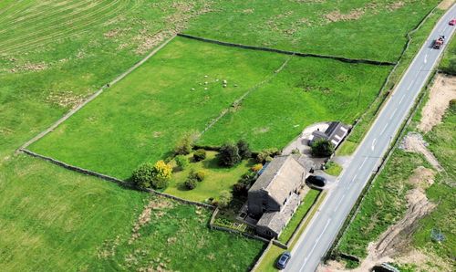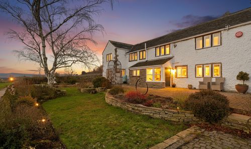The property stands in 1/4 of an acre, to the front there is a level lawned garden with paved flagged pathway giving access to the courtesy door for the double garage and shrubs providing privacy from Huddersfield road. To the left hand side of the house there is a continuation of the lawn, stone pathway, planted trees, shrubs and timber garden shed with glazed window. To the rear there is a shaped lawned garden with large ornamental pond, crazy paved stone pathway and patio area, planted trees and shrubs. to the right hand side of the property there is a timber hand gate giving access to the side entrance as well as providing access to the rear garden.