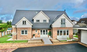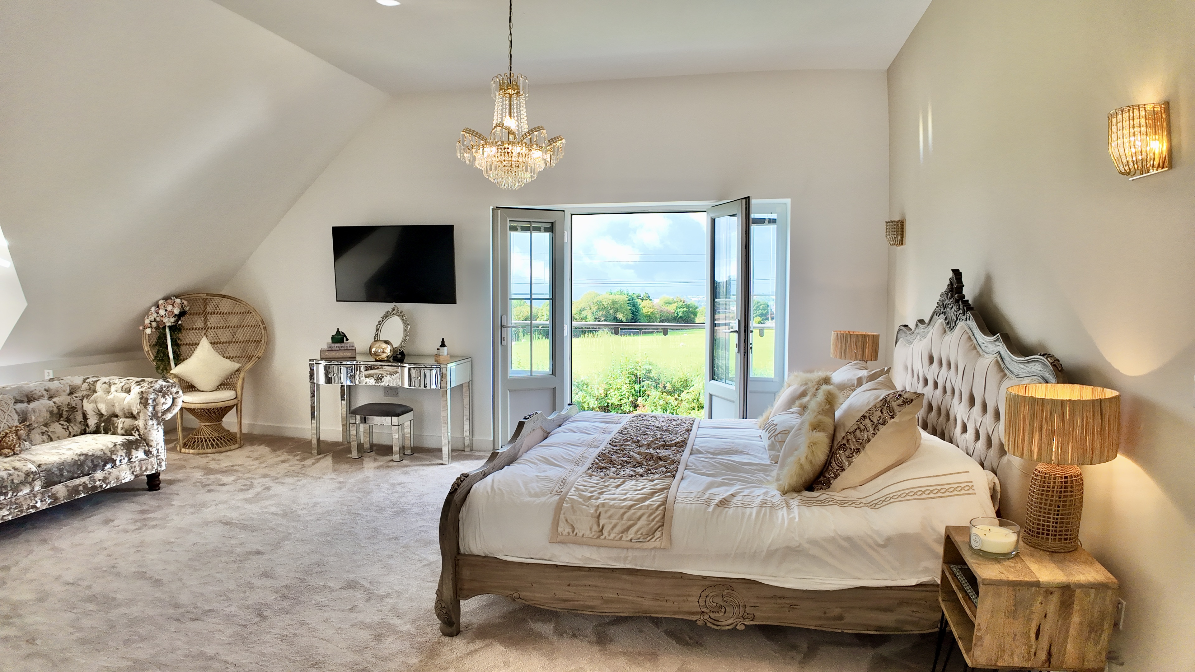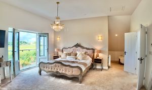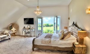 The master suite is a true sanctuary, offering a wardrobe area, dressing room, ensuite bathroom, and a Juliette balcony that overlooks the picturesque surroundings. The two additional double bedrooms are equally luxurious, each boasting built-in storage and ensuite bathrooms for added comfort and convenience.
