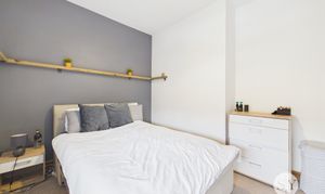 Double bedroom with carpet flooring, double glazed uPVC window, panel radiator.