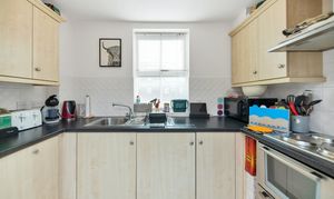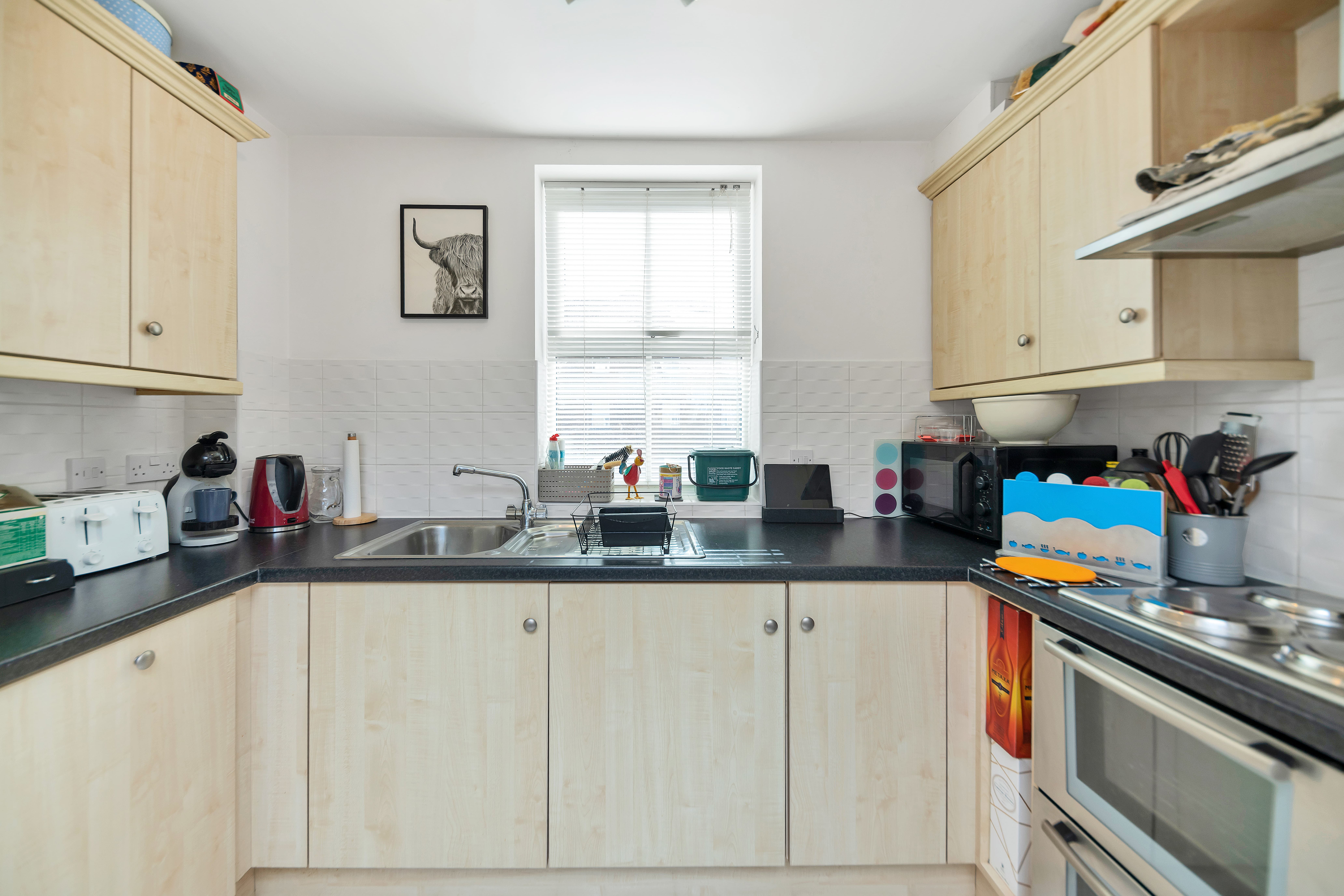 The kitchen/dining/living room is wonderfully open-plan and airy, benefiting from windows to a dual aspect, thick carpets, spot lighting, neutral decor and ample space for a variety of lounge, dining and storage furniture. In the kitchen area, there is a range of base and wall units, laminate worktops, tiled flooring and splashbacks, an integrated oven, hob and fridge/freezer and space for smaller kitchen appliances.