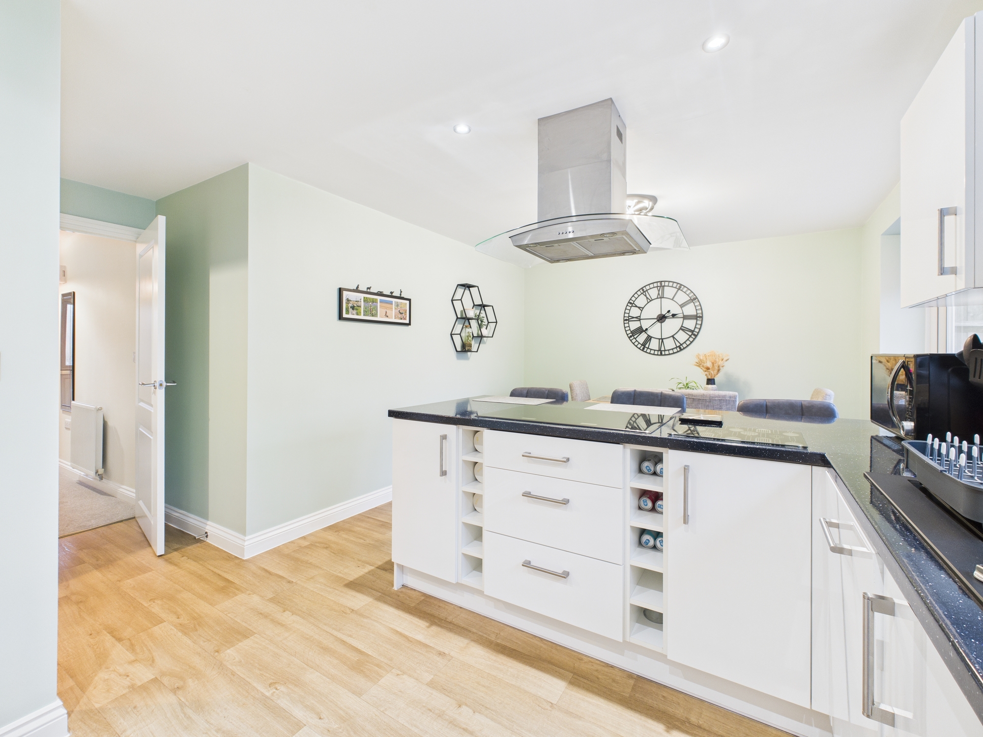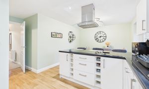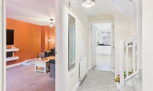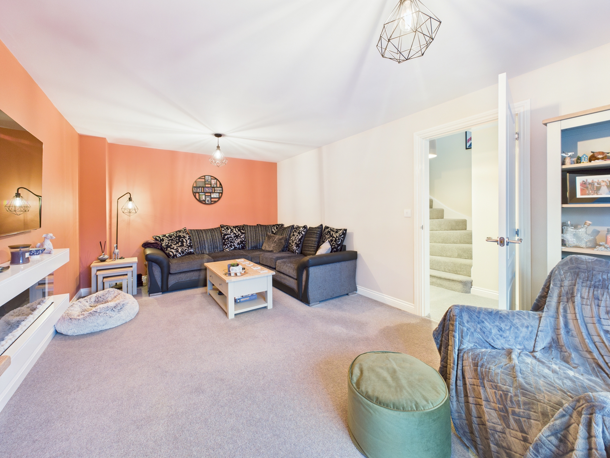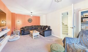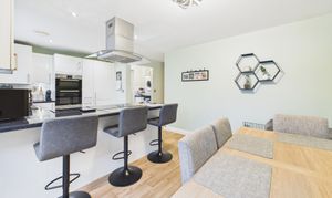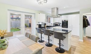 Entered under a storm porch the entrance hall has stairs to the first floor with storage underneath as well as a cloakroom. The sitting room at the front of the property with the kitchen/dining room at the rear. The kitchen is equipped with a range of units including an integrated fridge/freezer, dishwasher, eye level double oven and a separate induction hob. The worktop extends into the dining area creating a breakfast bar and the dining area also has a set of French doors in to the rear garden. Adjacent to the kitchen, the utility room offers space for a washing machine and tumble dryer as well as a side door onto the driveway.