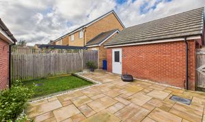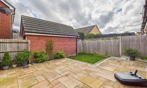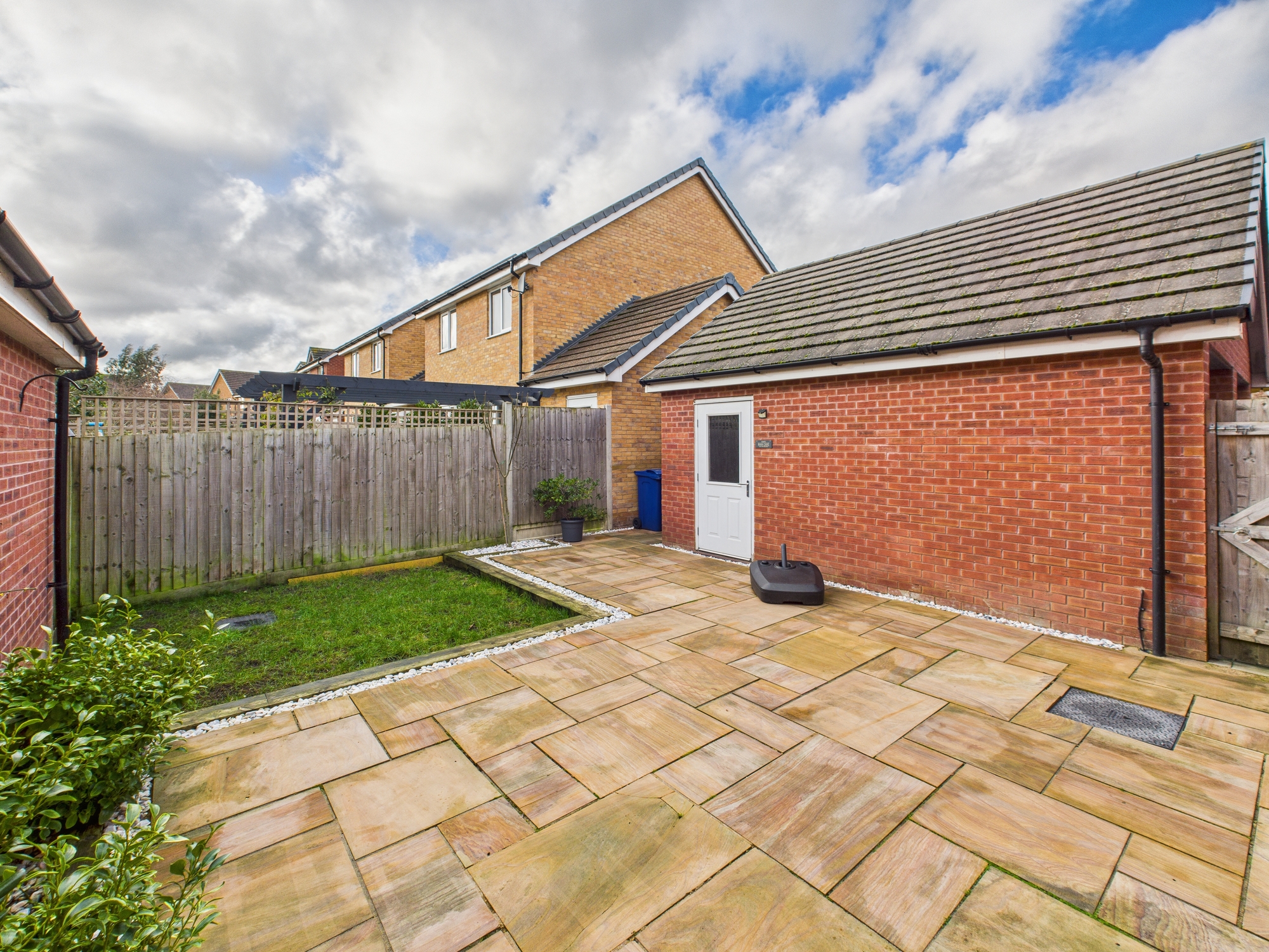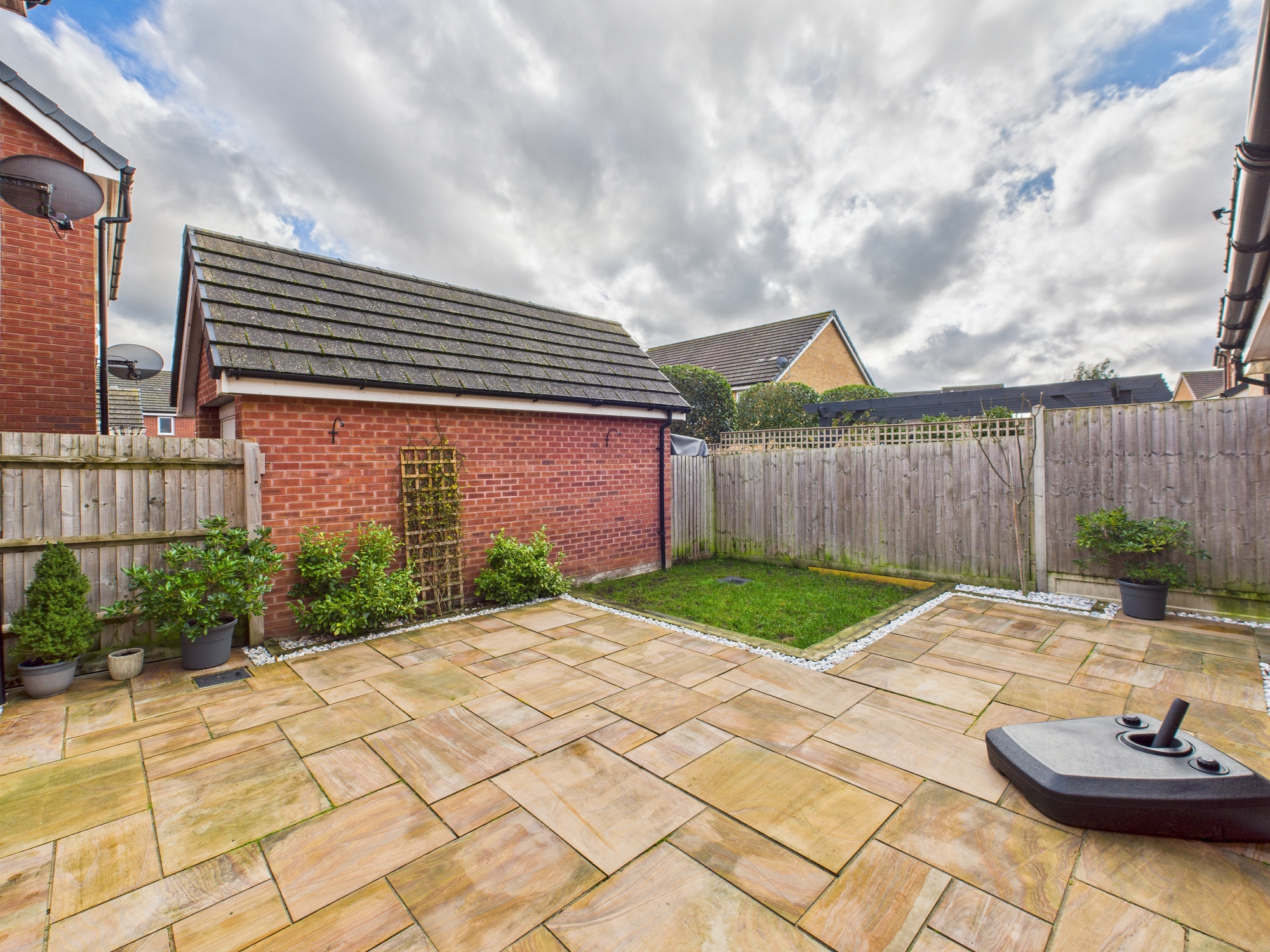 The south westerly facing rear garden is primarily laid with lawn and patio with a pedestrian gate for side access onto the driveway.