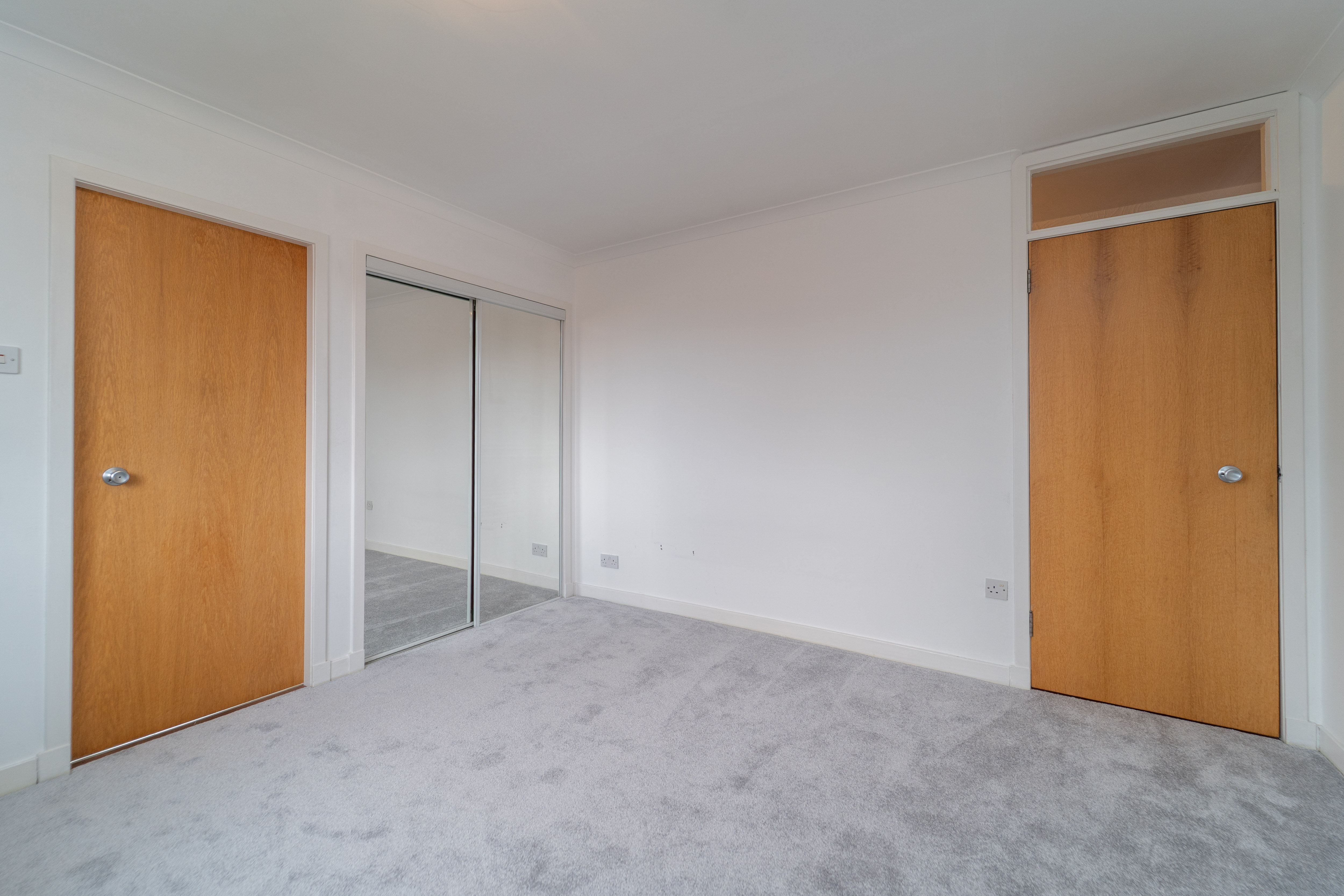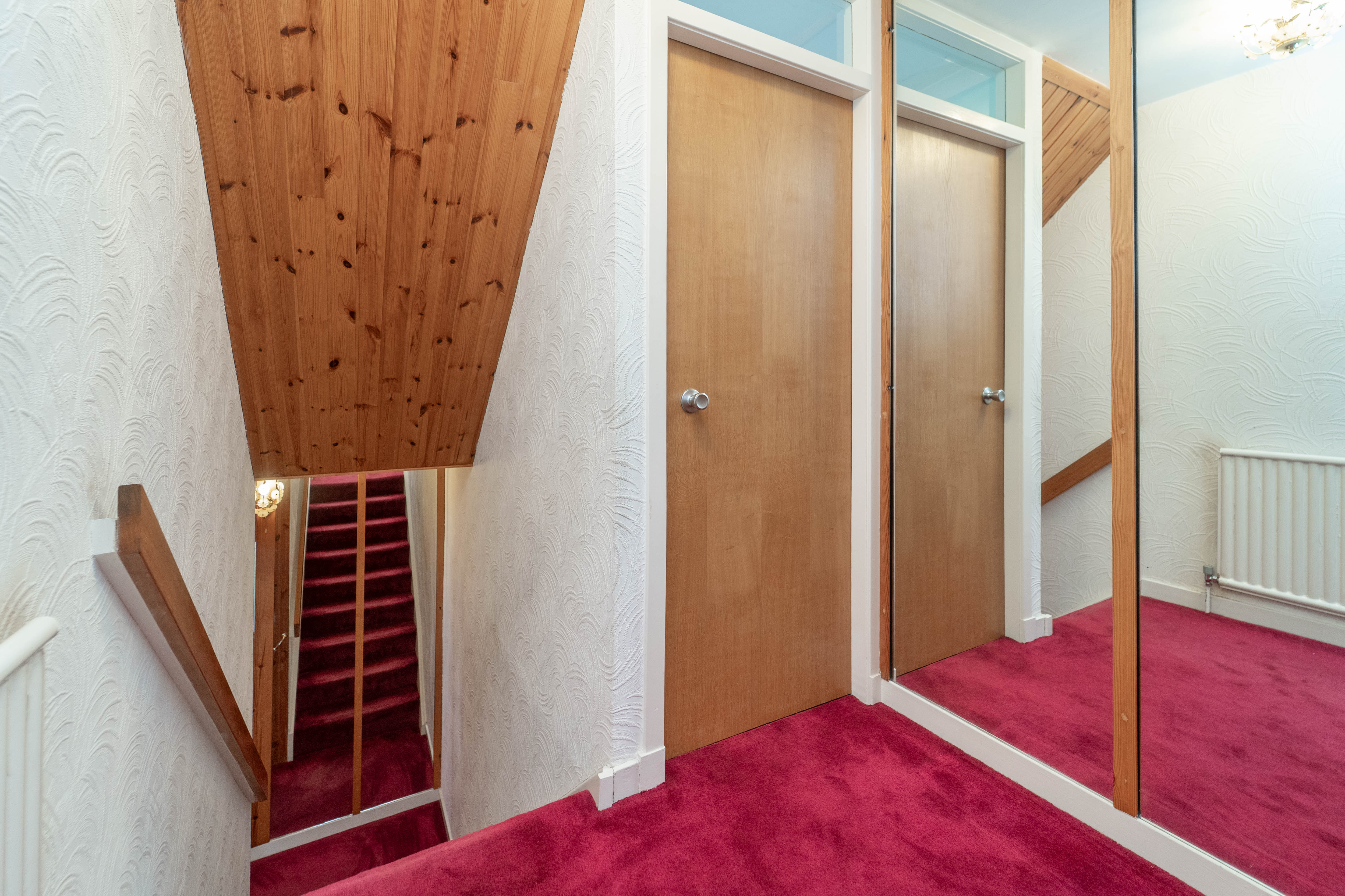 The décor seamlessly extends up the staircase, where carpeted stairs and landing meet white walls with integrated mirrors. An integrated cupboard offers ample storage. The area is well lit by ceiling light. Additional features include a smoke detector, a radiator, an attic hatch and conveniently placed power points.