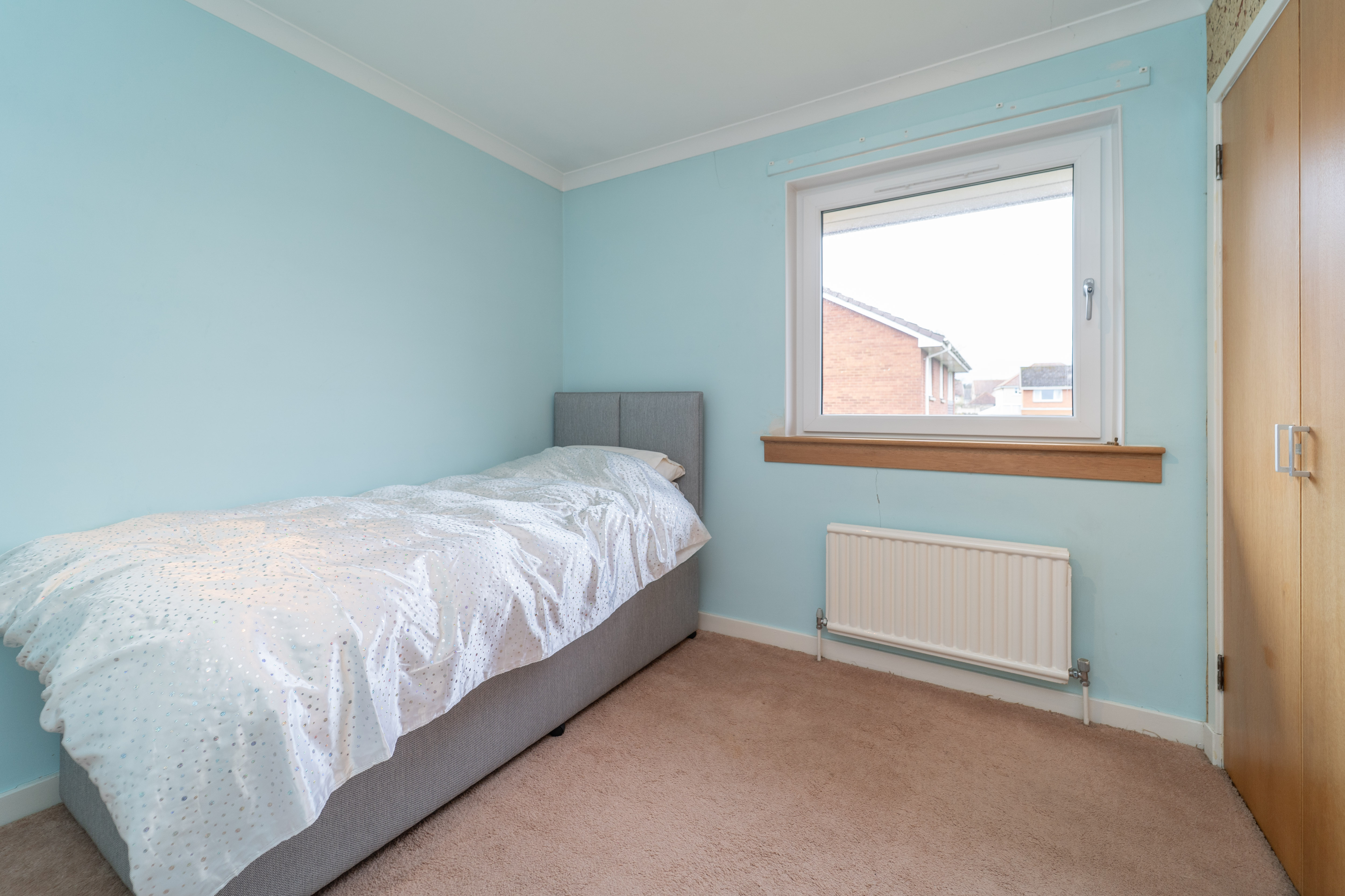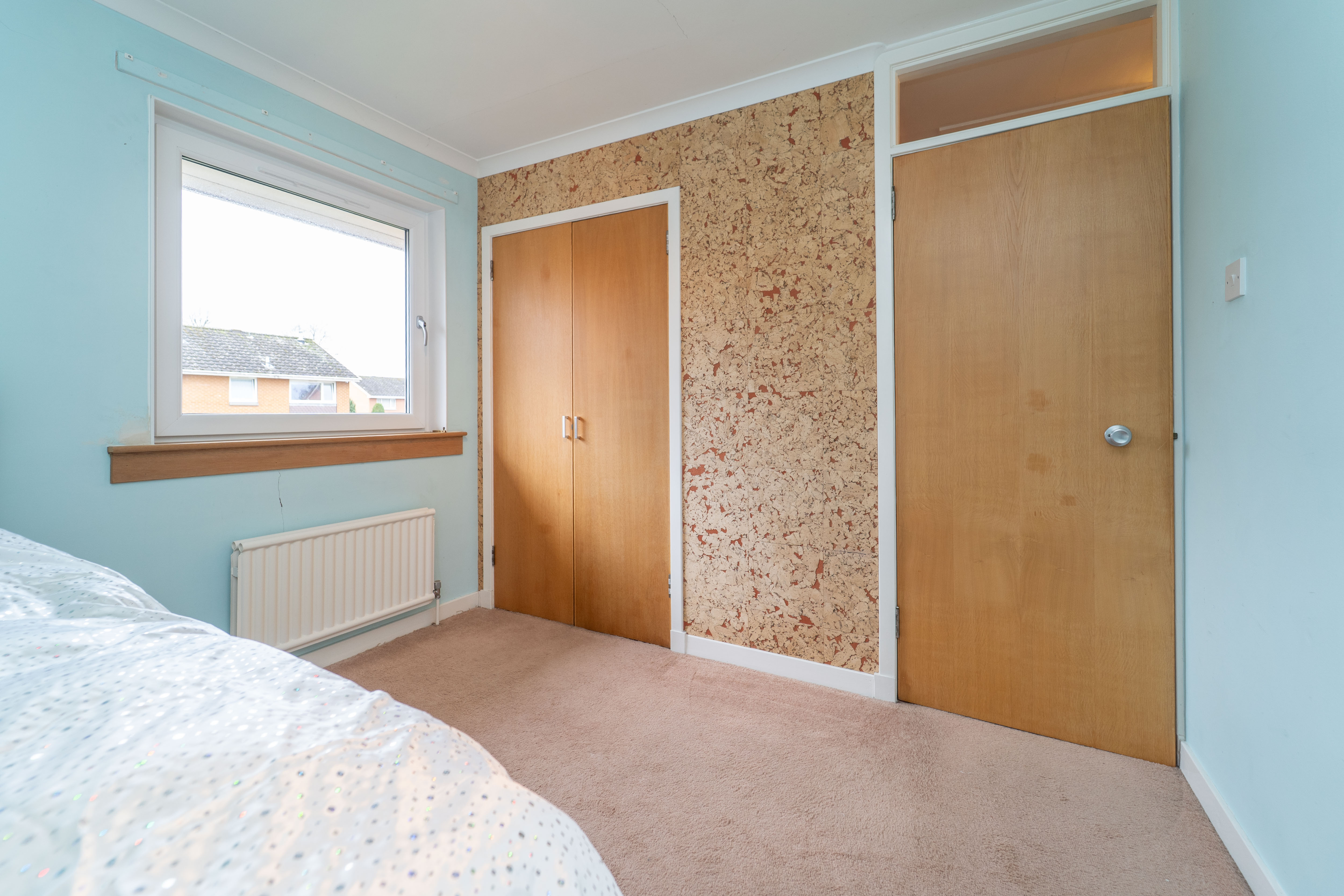 The fourth bedroom features light turquoise painted walls, a feature cork wall, and cosy carpeted flooring, creating a warm and inviting atmosphere. An integrated wardrobe offers ample hanging and shelving space. A further spacious cupboard provides storage space. A large window at the rear of the property allows plenty of natural light to fill the room. The space is further complemented by a ceiling light, a radiator, and power points, ensuring both comfort and functionality.