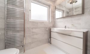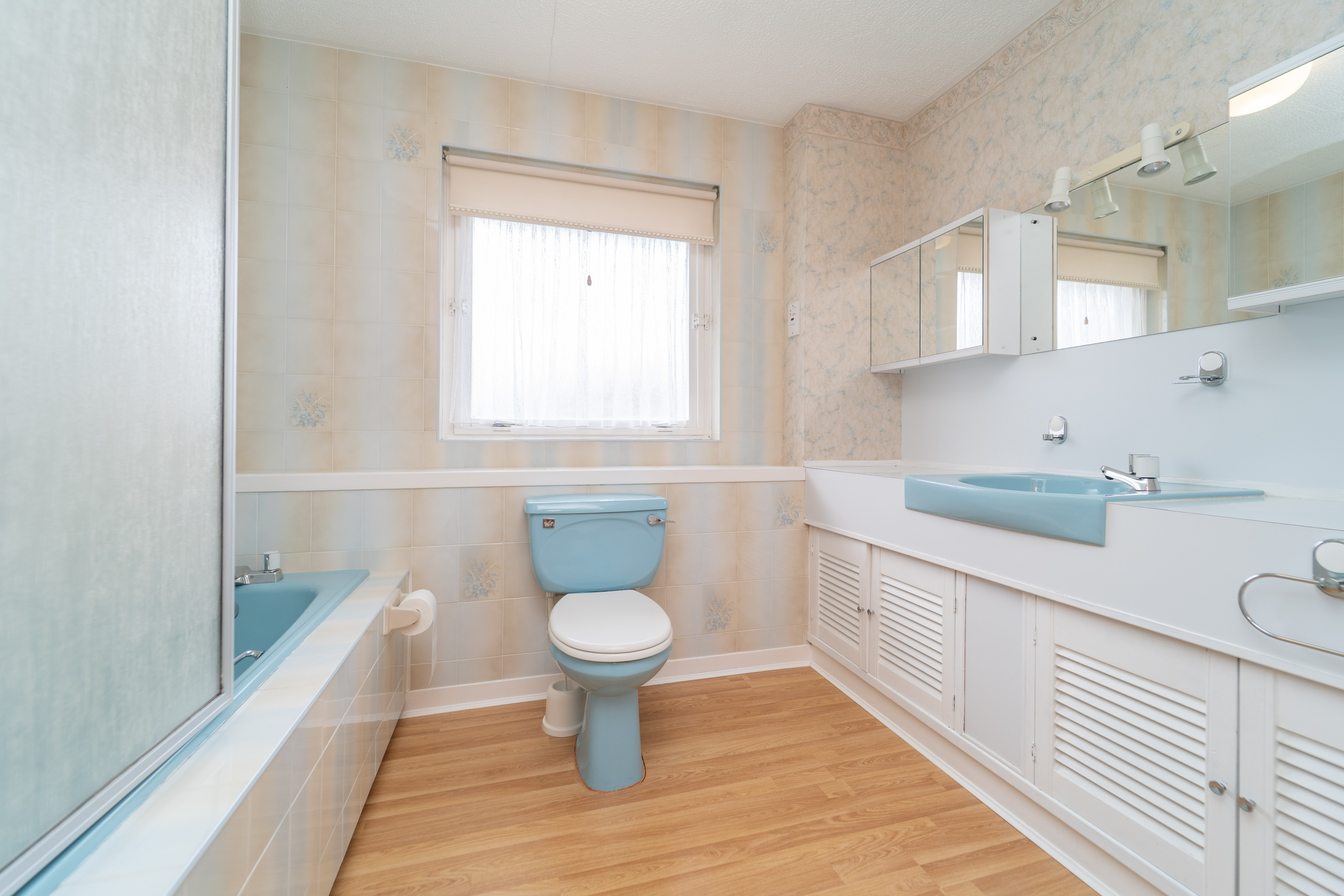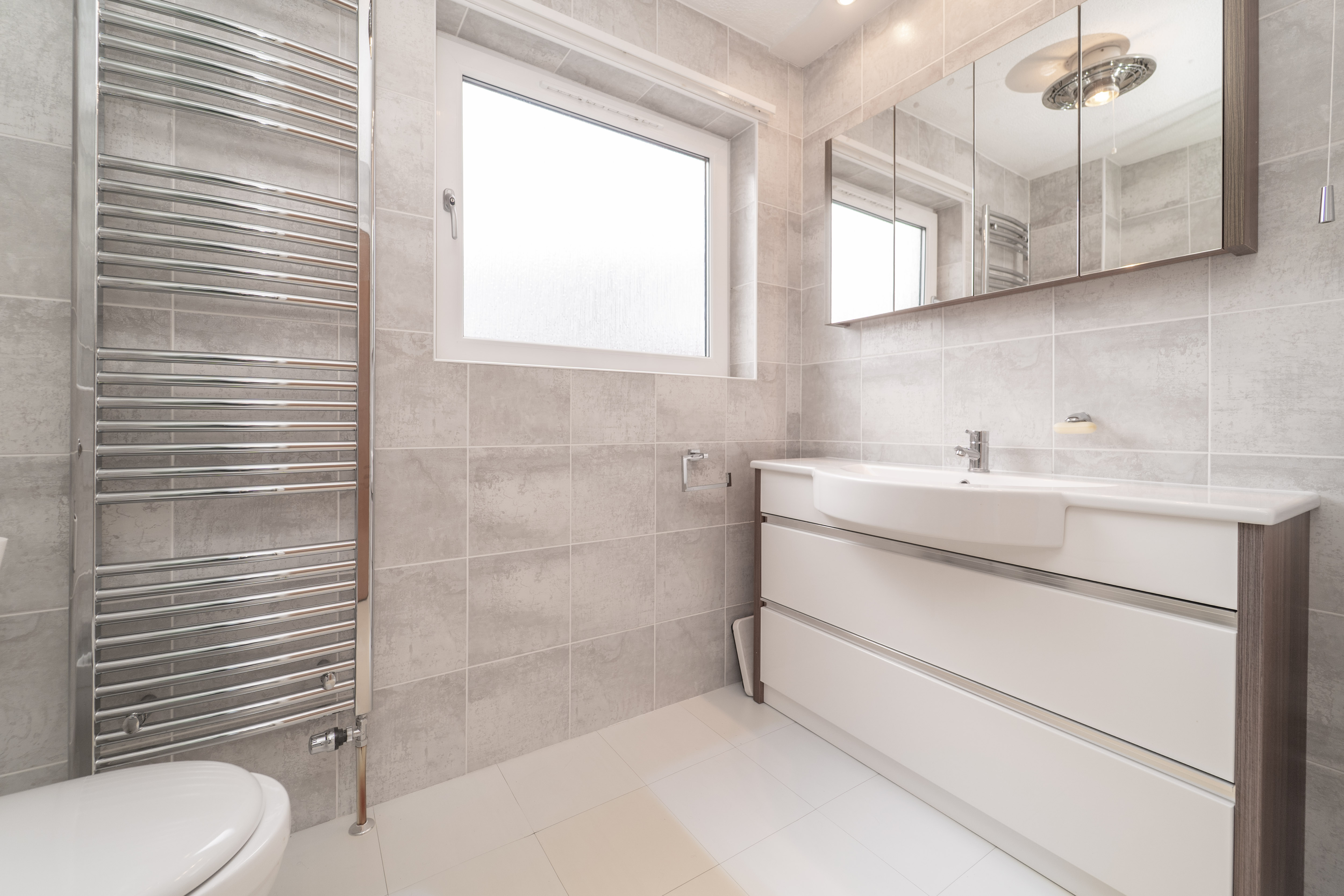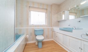 This spacious bathroom is finished with tiled and papered walls and laminate flooring. A rear facing window fills the space with natural light, further enhanced by ceiling light. The suite includes an electric powered shower over a bathtub, a built-in vanity unit with an integrated sink and close coupled toilet, offering a functional space. A radiator, a shaver socket and a mirrored medicine cabinet complete this well-appointed space.