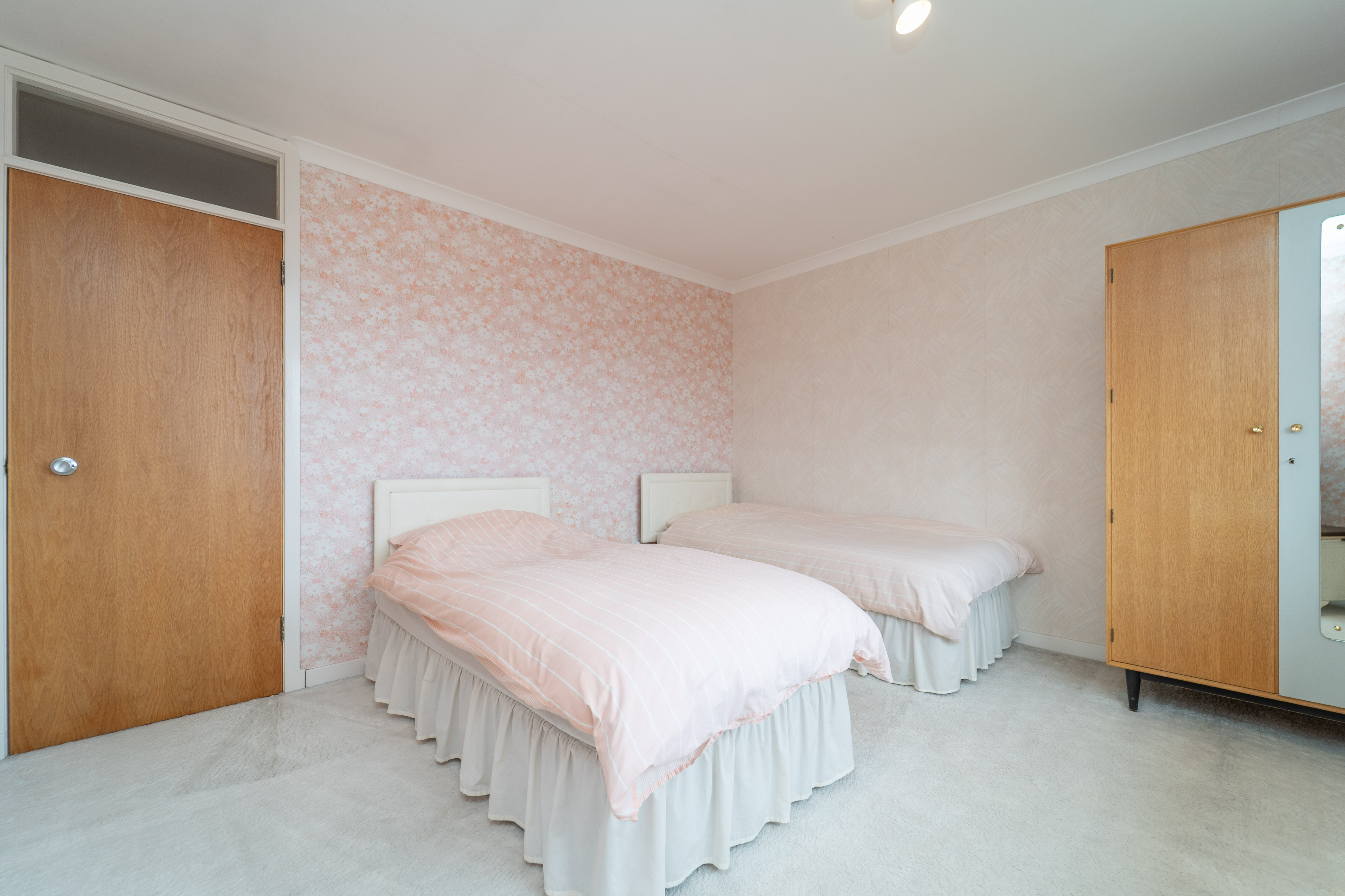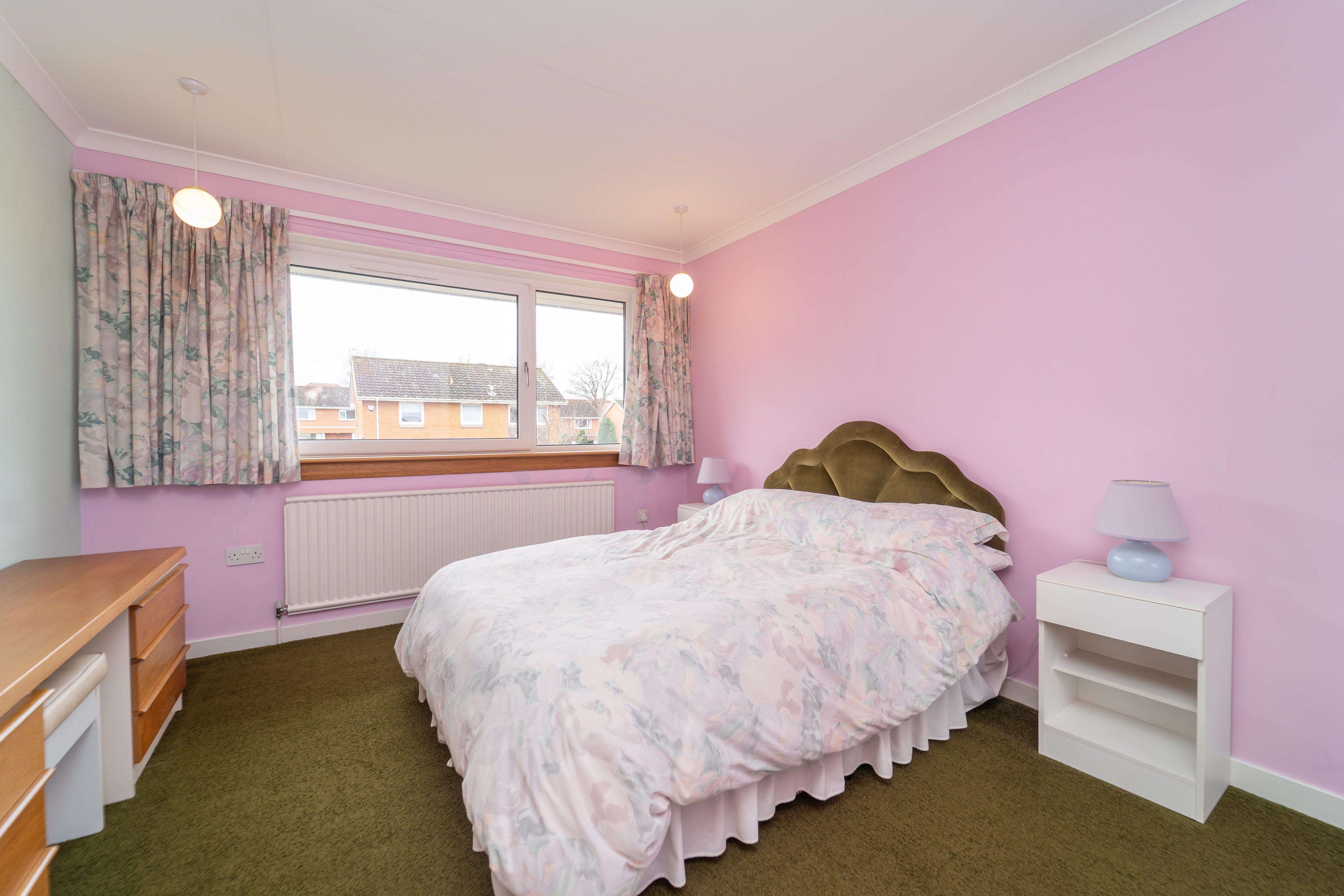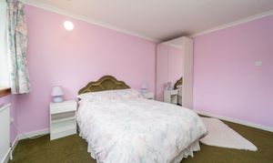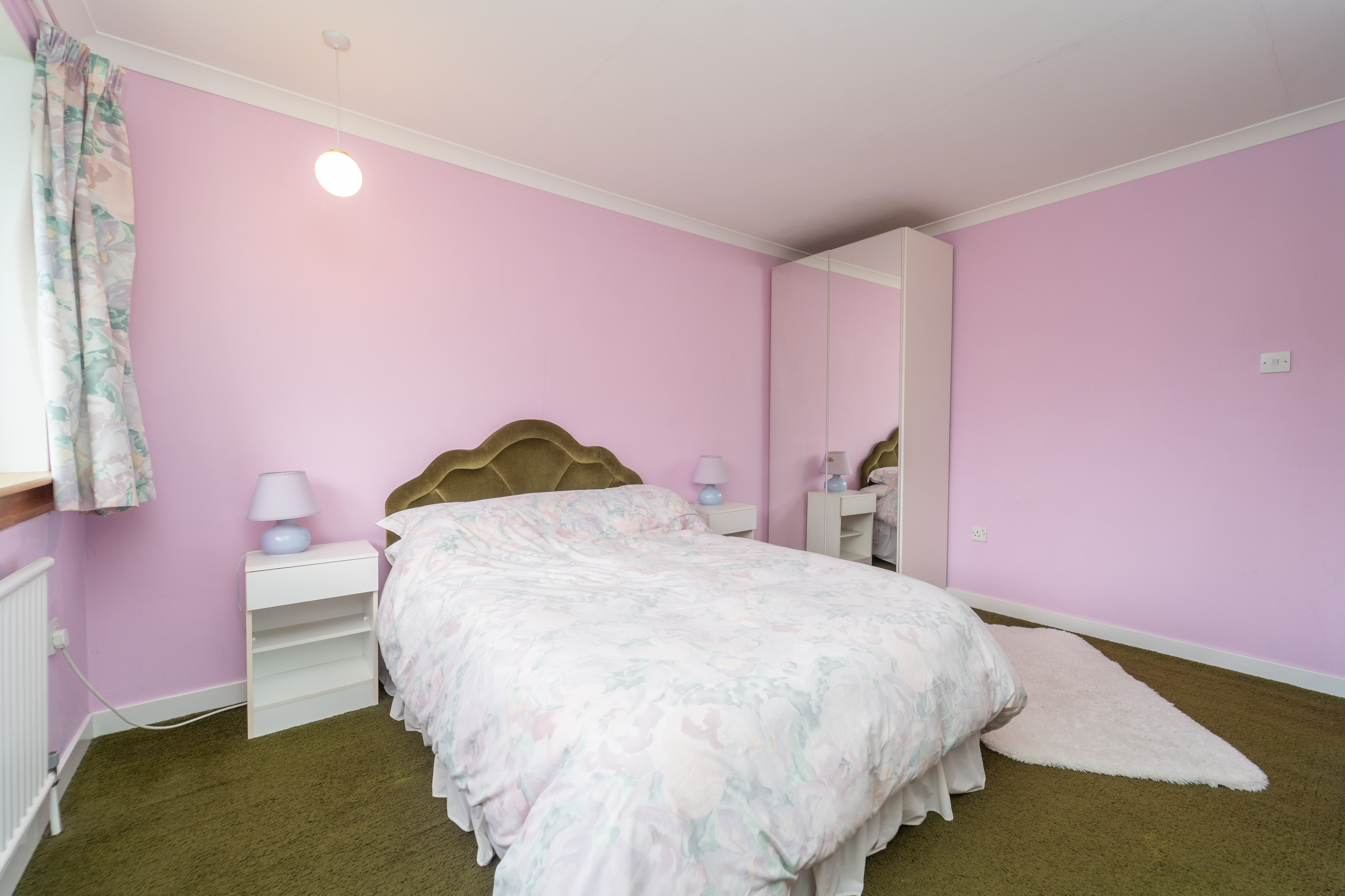 Another great double bedroom, finished with pink and light turquoise painted walls, and carpet to the floor. A window to the rear of the property allows in natural light. Power points, a ceiling light and a radiator are included.