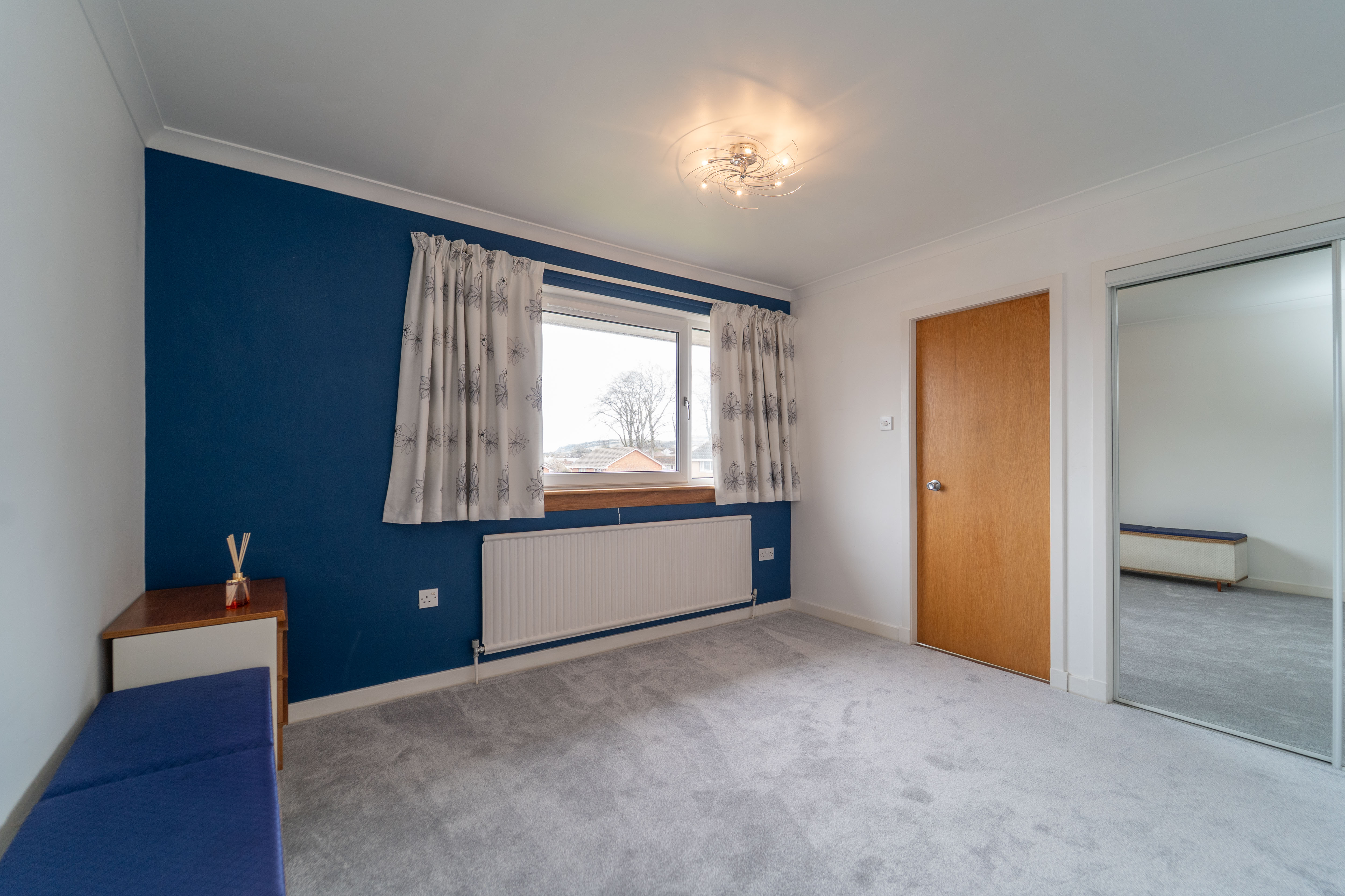 This delightful room features white painted walls, a feature blue painted wall and carpeted flooring. It boasts an integrated wardrobe, offering generous hanging and shelving space. The room is bathed in natural light from the window to the front of the property, further enhanced by a ceiling light. The space provides a radiator and power points.