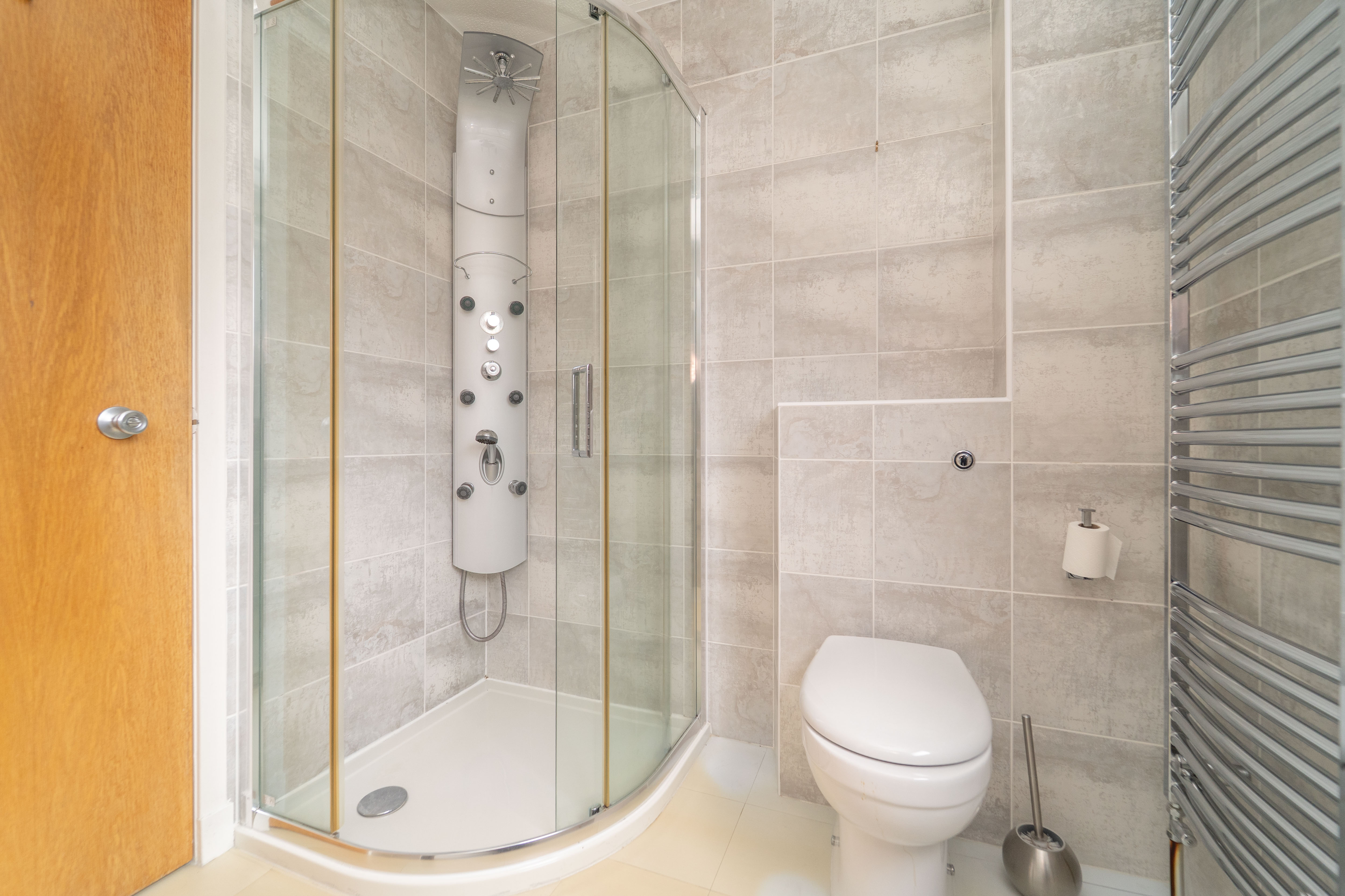 The shower room is neutrally decorated with grey tiled walls, complemented by vinyl tile flooring. The suite features a corner shower unit with a mains powered shower and hand held shower, a sleek vanity sink unit and a back-to-wall toilet, offering both elegance and functionality. A side facing window, a ceiling light and downlights provide excellent lighting. The chrome towel radiator, shaver socket and mirrored medicine cabinet complete the room.