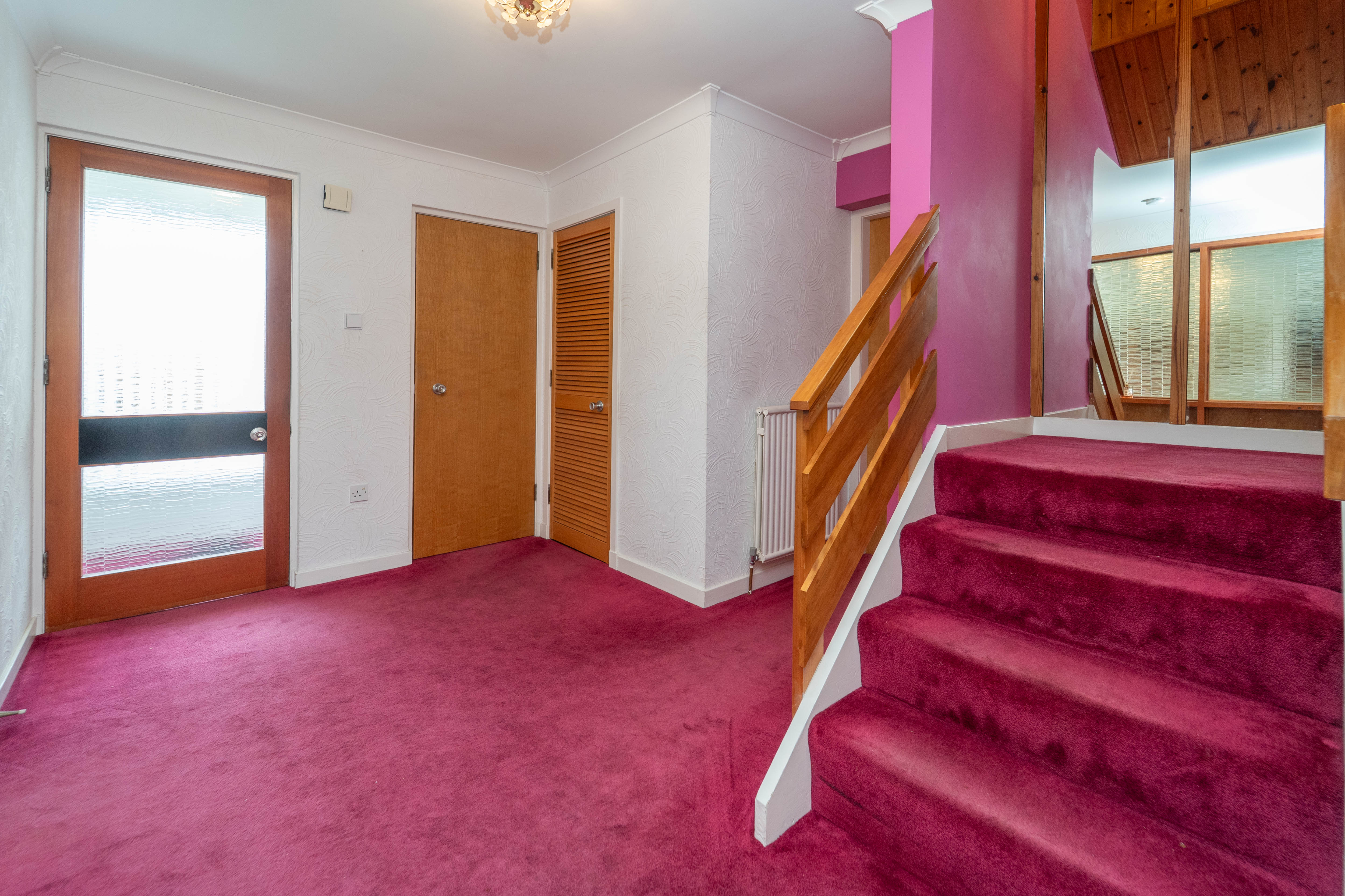 Entry to this inviting vestibule is through a part glazed upvc door which, alongside the adjacent window, allows natural light to enter. The décor begins with neutral walls, a feature pink wall and carpet flooring. There is a built in cupboard providing storage space. Two ceiling lights, power points, a smoke detector and a radiator are included.