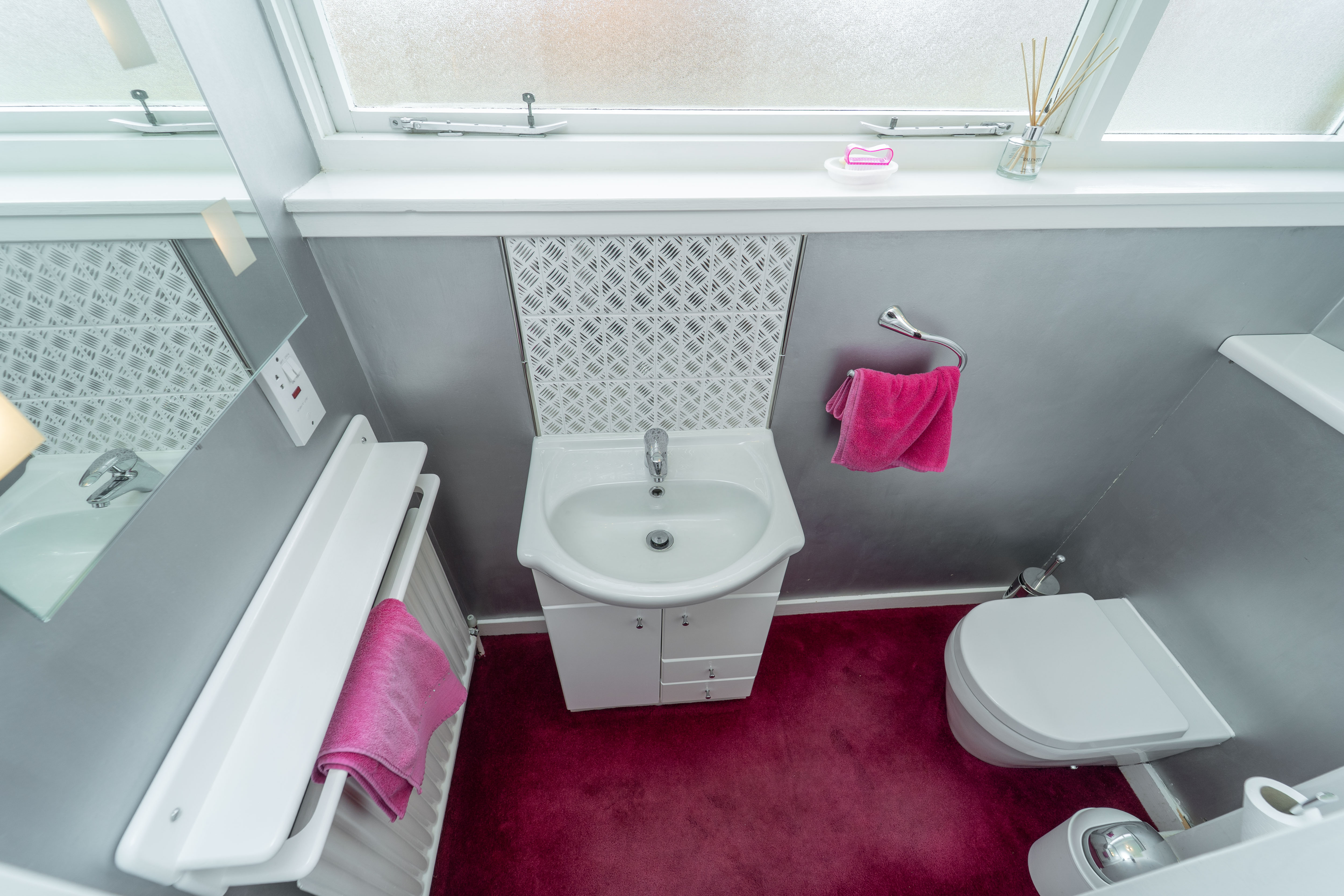 This essential modern living space is finished with white and silver walls and carpet flooring. The suite features a back to wall toilet and a vanity sink. Natural light streams in through the large front window, complemented by a ceiling light and an illuminated mirror, creating a bright and welcoming atmosphere. A radiator and a shaver socket add the final touches.