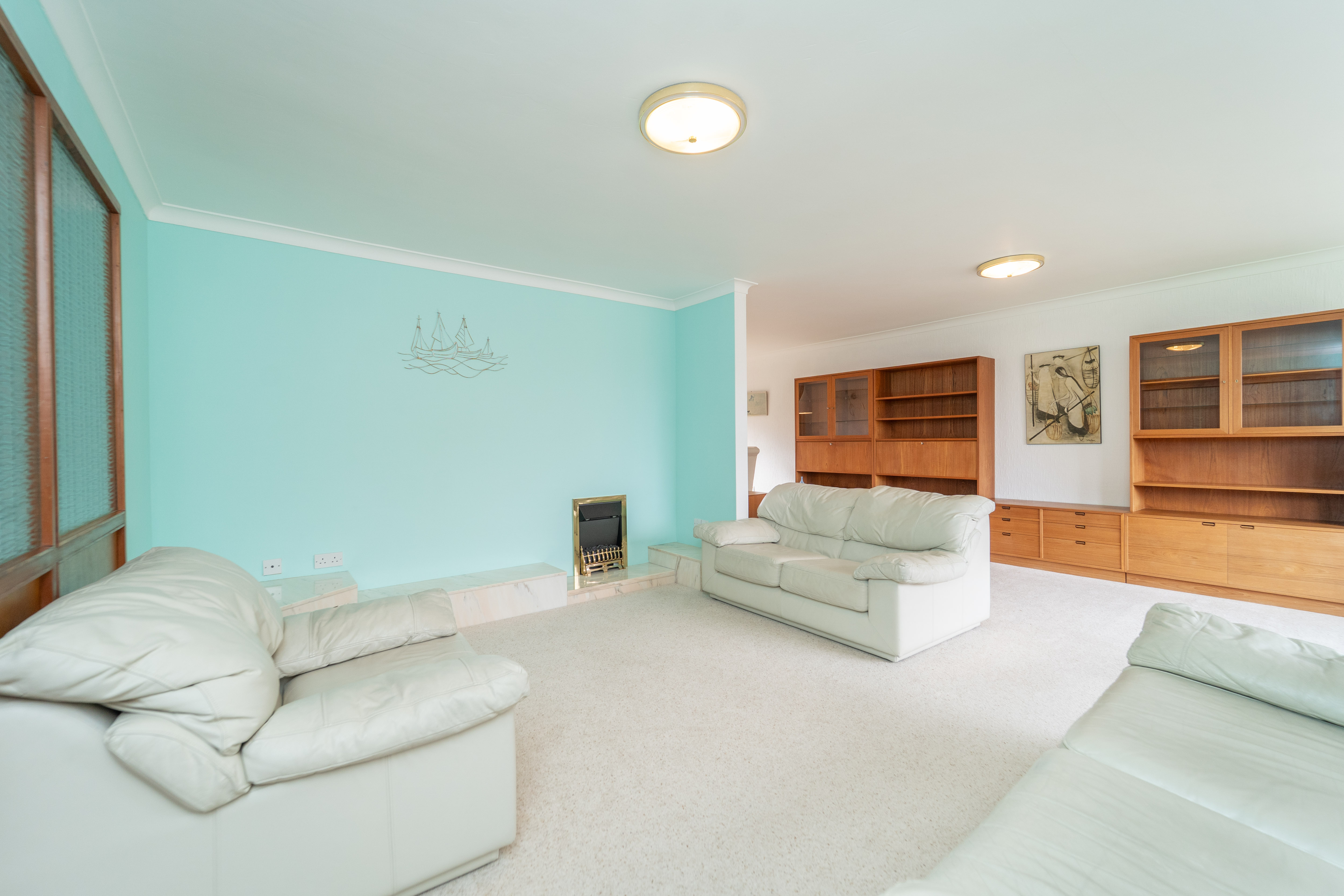 This space has light turquoise and white tones to the walls and carpet to the floor. A large, dual aspect, bay window to the front allows lots of natural light into the room, being further enhanced by two ceiling lights. An electric fire with a marble stone hearth creates a focal point in the room. A radiator, power points and a smoke detector are also provided.