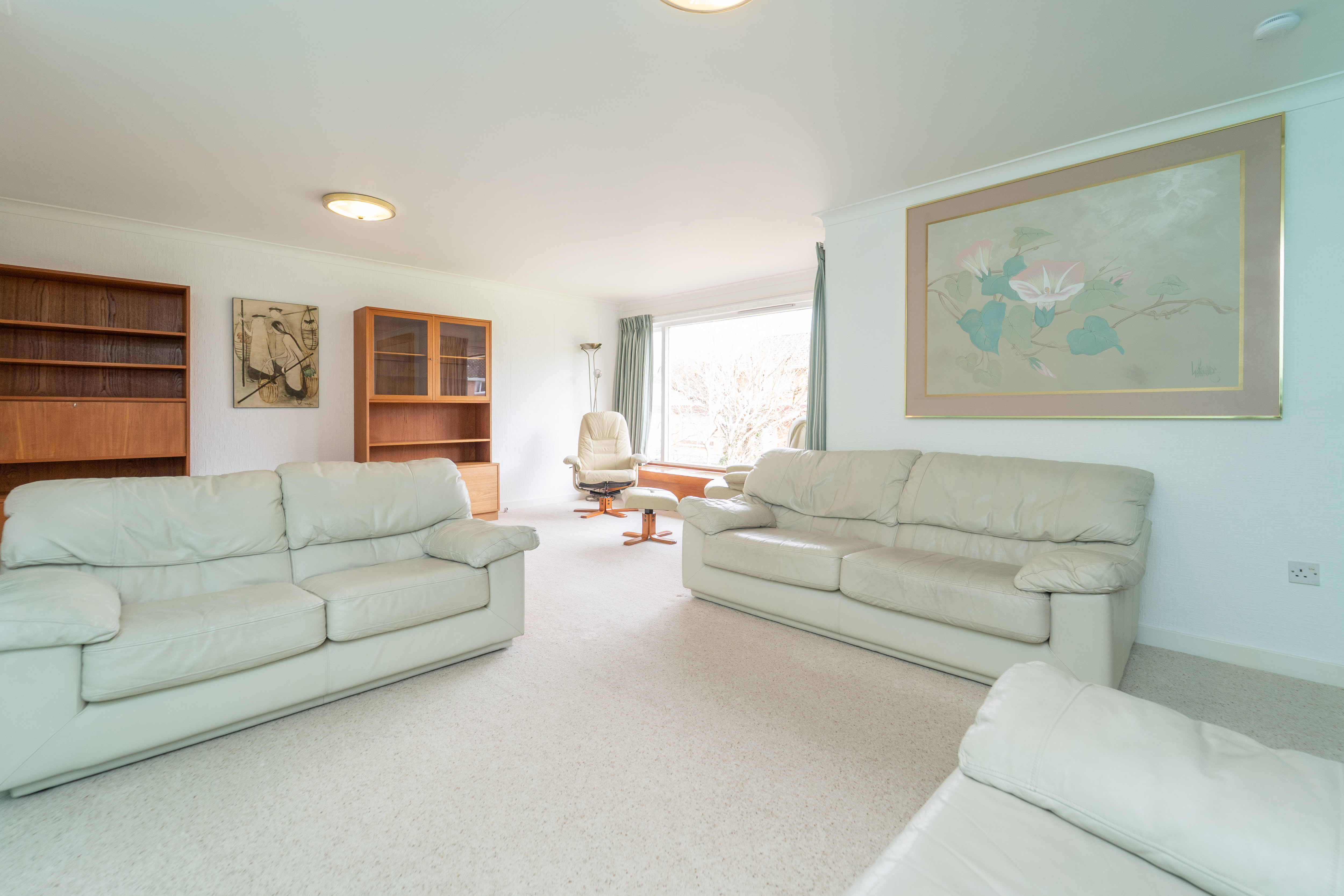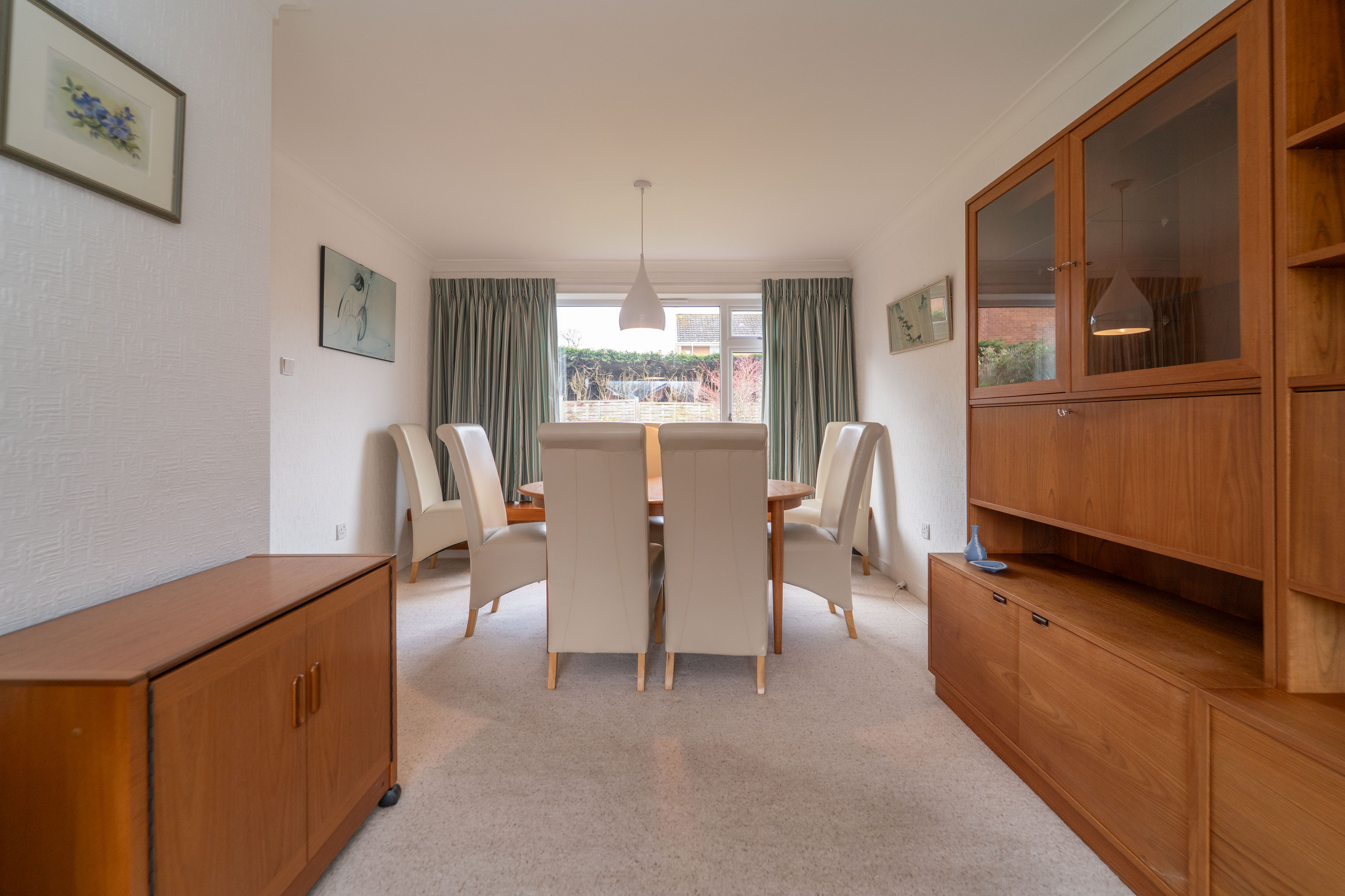 This versatile space flows effortlessly from the lounge, maintaining continuity with carpet flooring and white papered walls for a cohesive and inviting feel. A large rear facing window frames garden views while filling the room with natural light, complemented by a ceiling light for additional illumination. Thoughtfully placed power points and a radiator enhance comfort and functionality, making this space both practical and welcoming.