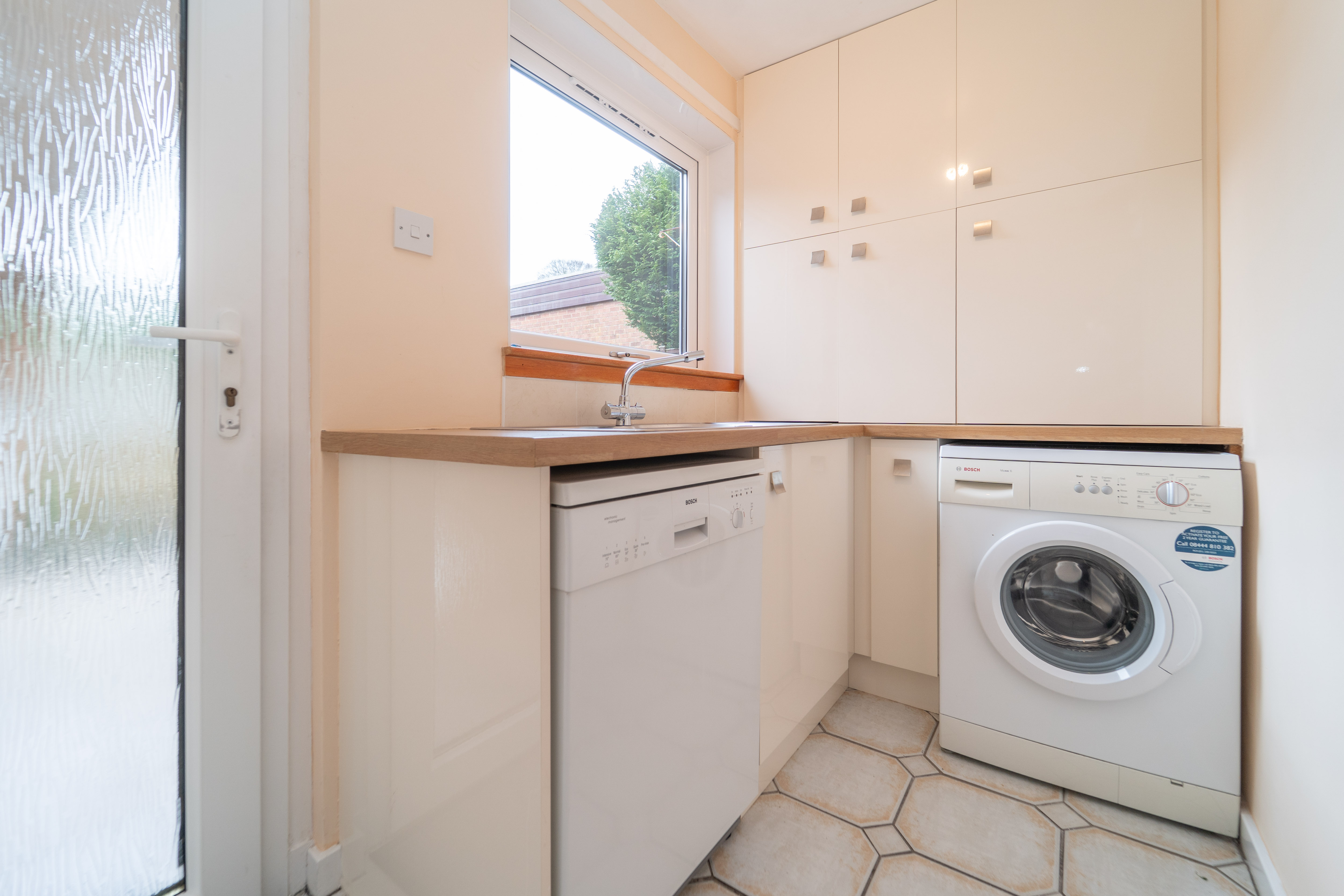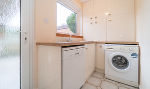 The utility room offers a practical space, featuring magnolia painted walls and tiled flooring. It includes ample storage with both floor and wall units, finished with cream gloss fronts and complemented by a wood effect work surface. The room is equipped with an under-counter washing machine and dishwasher, both of which are included in the sale. A glazed upvc door provides convenient access to the side and allows natural light in, alongside the window. The utility area is completed with a stainless steel sink and drainer, mixer tap, tiled splashback, a radiator, an extractor fan, a ceiling light, and power points, ensuring the room is both functional and well equipped.
