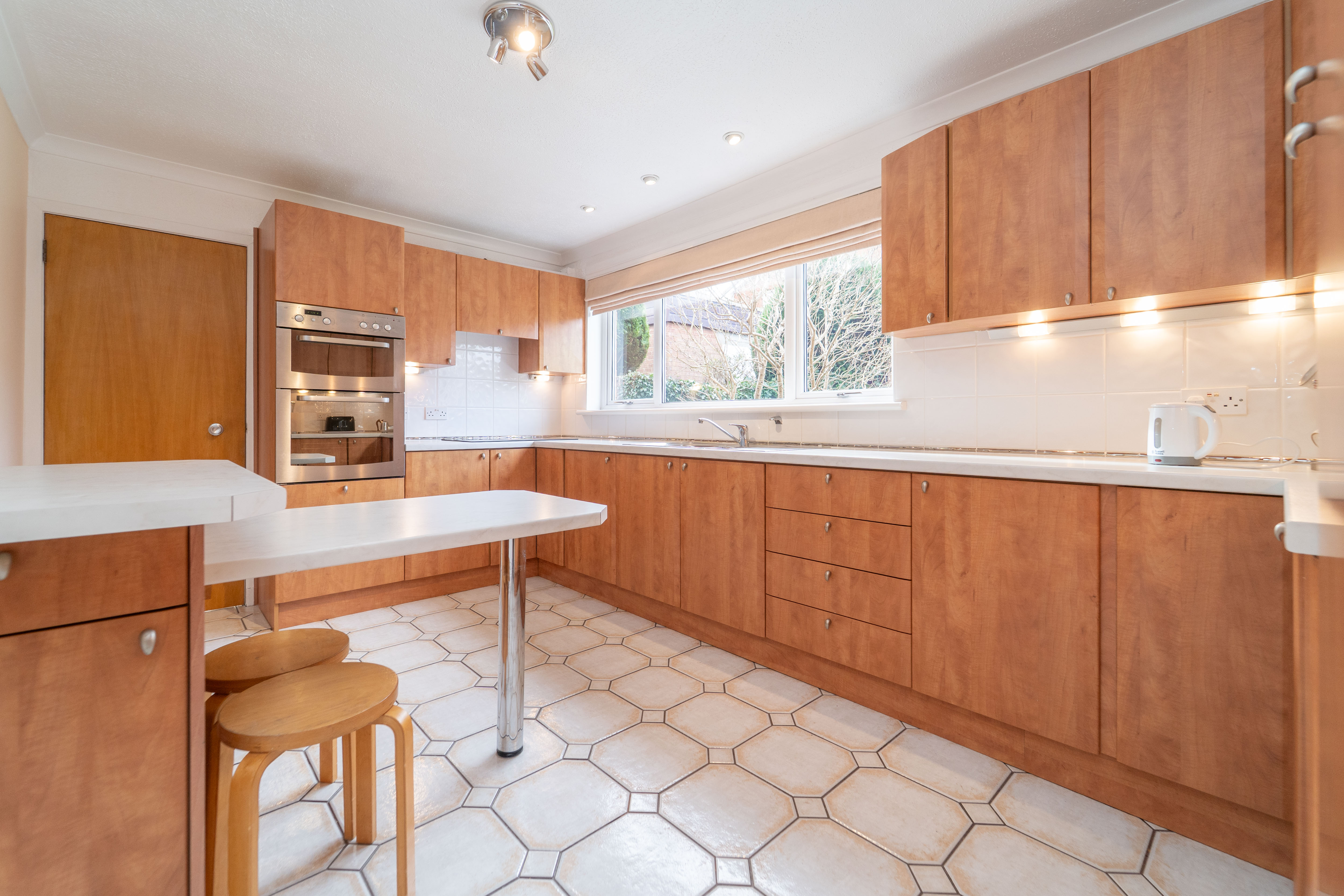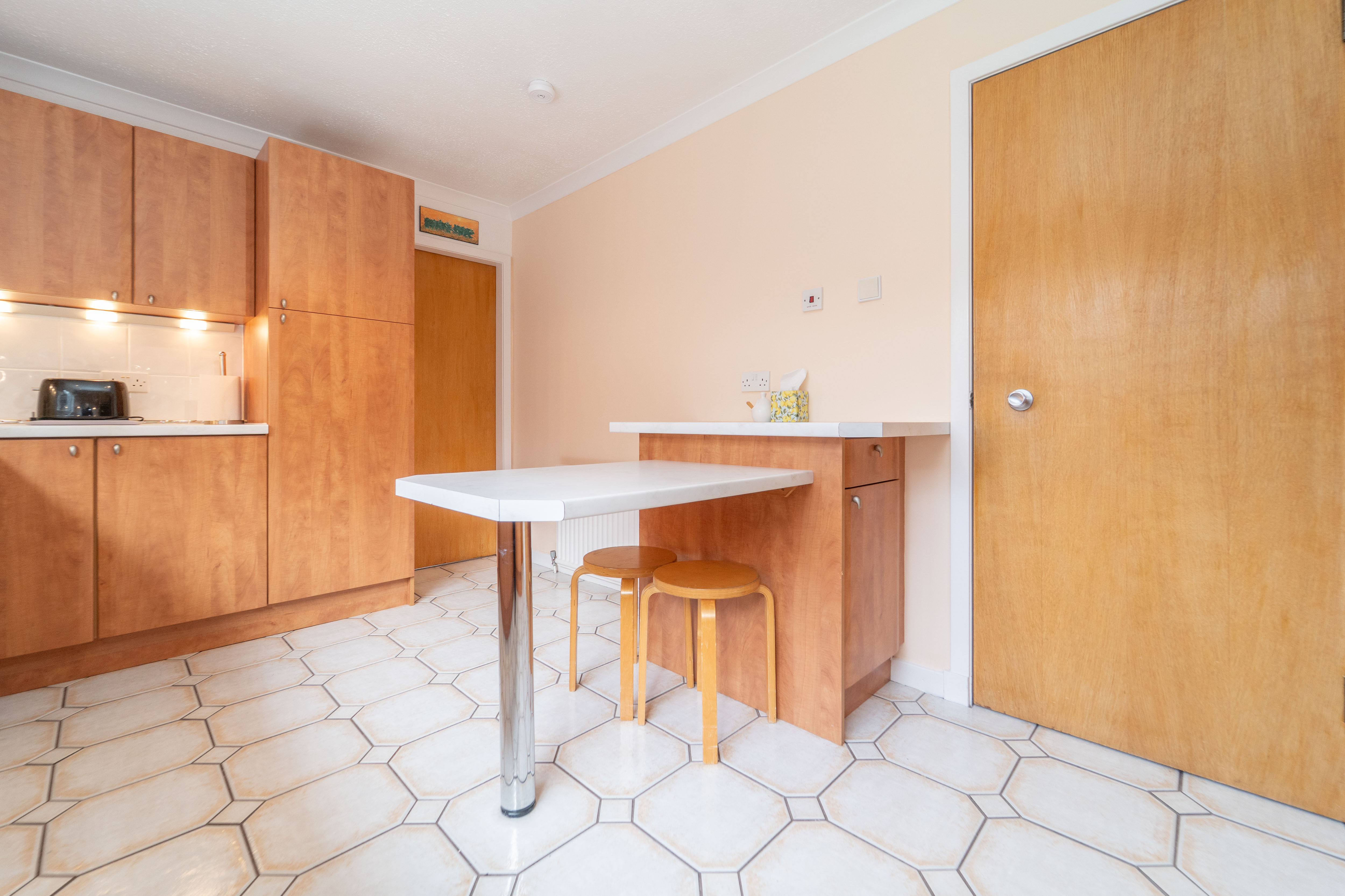 This well designed kitchen features wood cabinetry, paired with white marble effect work surfaces and white tile splashback for a coordinated look. The space is tastefully finished with peach and white walls and tiled flooring, creating a warm and inviting atmosphere. The kitchen is fully equipped with built-in appliances, including an eye-level oven, microwave and grill, a four ring induction hob, an integrated fridge, and a stainless steel extractor fan. The stainless steel sink, complete with a one-and-a-half bowl, drainer, and mixer tap, and waste disposal, adds both functionality and style. Natural light floods the room through the rear facing window. The layout allows for a fitted breakfasting table, perfect for casual dining. Additional features include a ceiling light, downlights, under cabinet lighting, a radiator, a heat detector and ample power points.