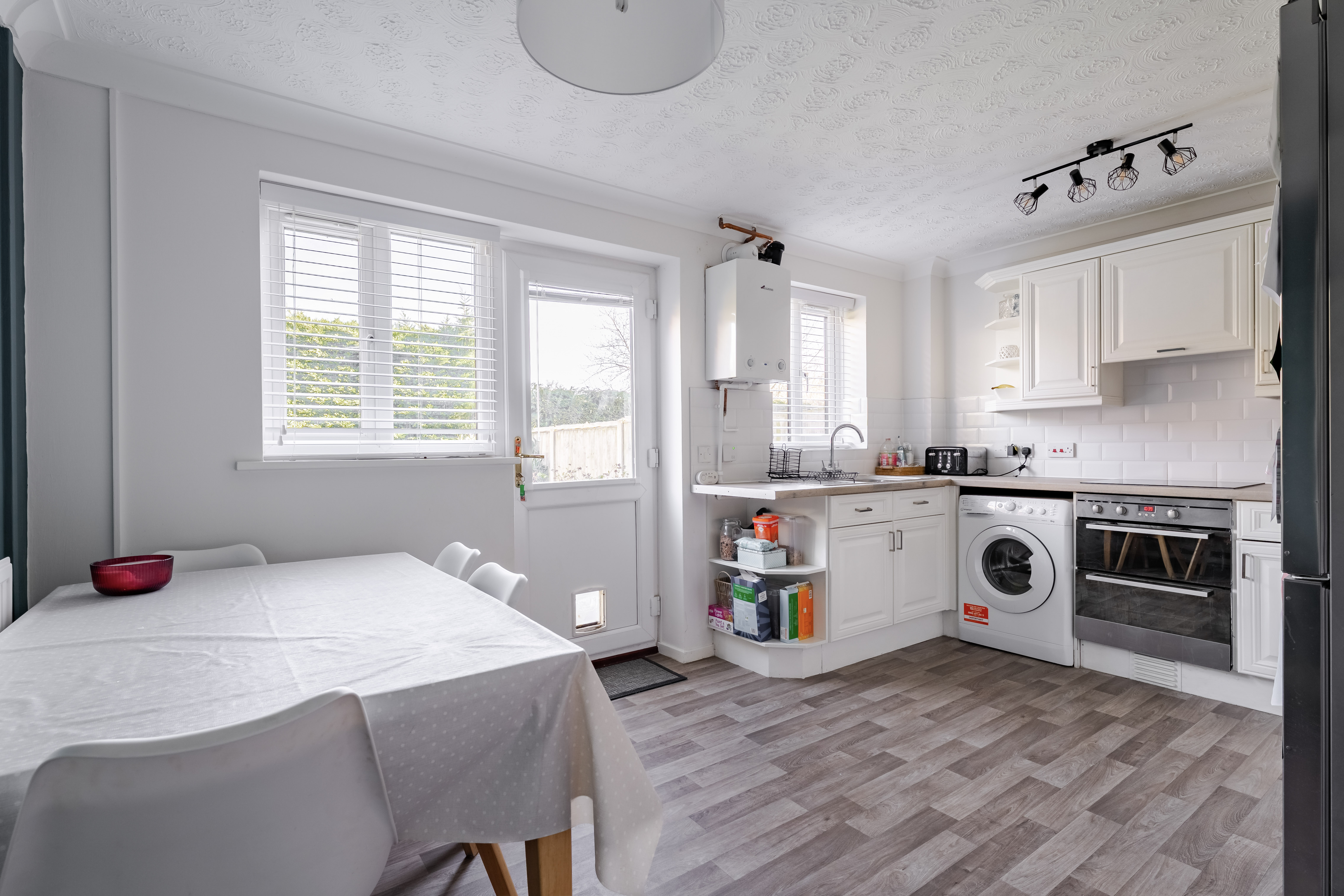 - Kitchen/dining room with fitted units, tiled backsplash and garden access
