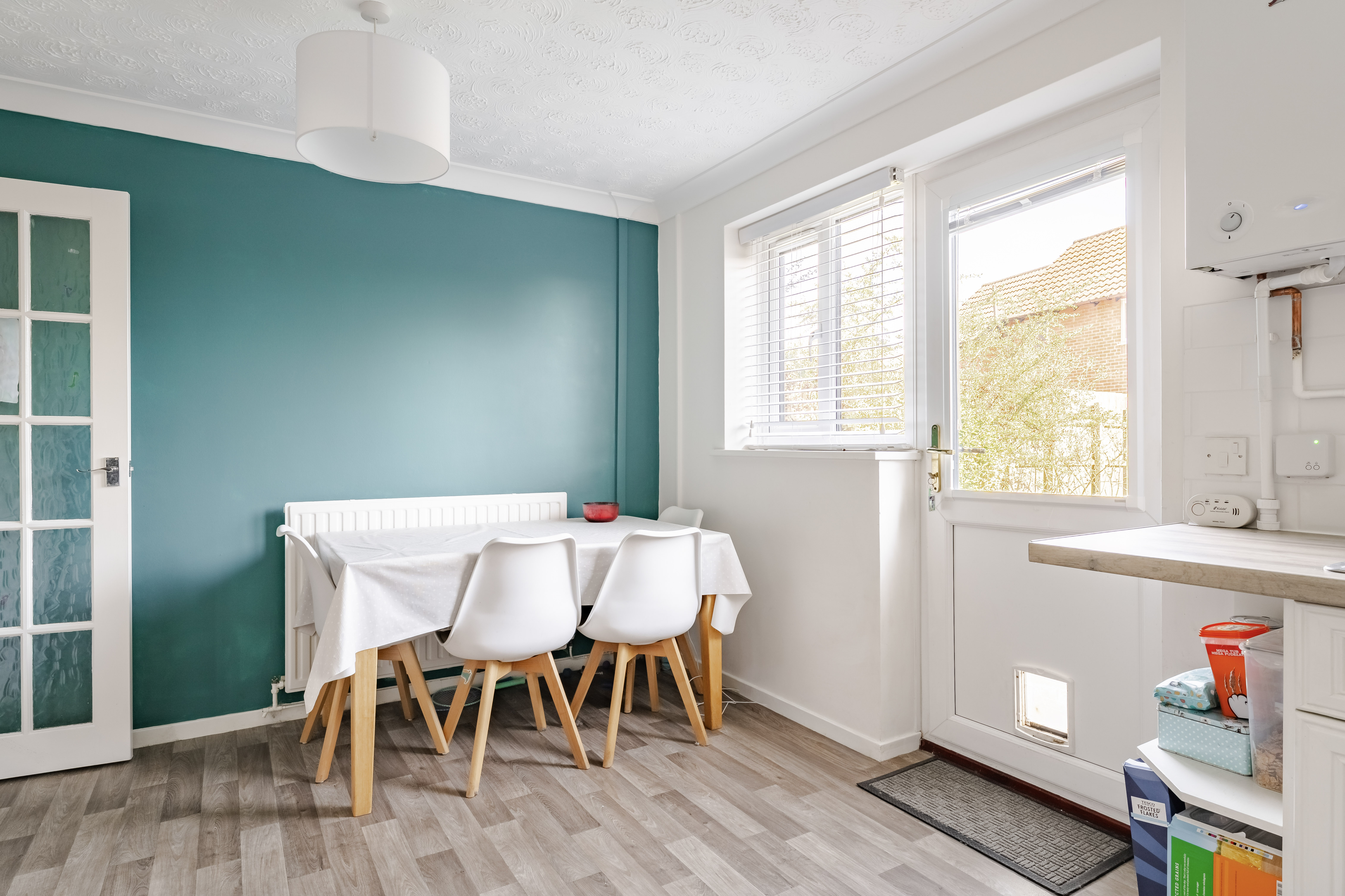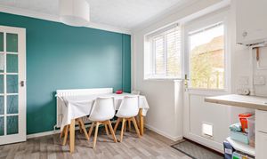 To the rear, the kitchen/dining room provides a sociable and functional hub of the home. The fitted kitchen features a tiled backsplash and offers space for all the important appliances, while the adjacent dining area is enhanced with a backdrop of colour, adding character and warmth to the space. A rear door leads directly out to the garden, making it easy to entertain or simply enjoy indoor-outdoor living during the warmer months.