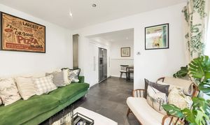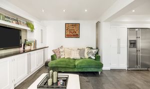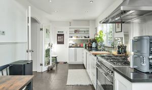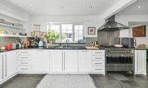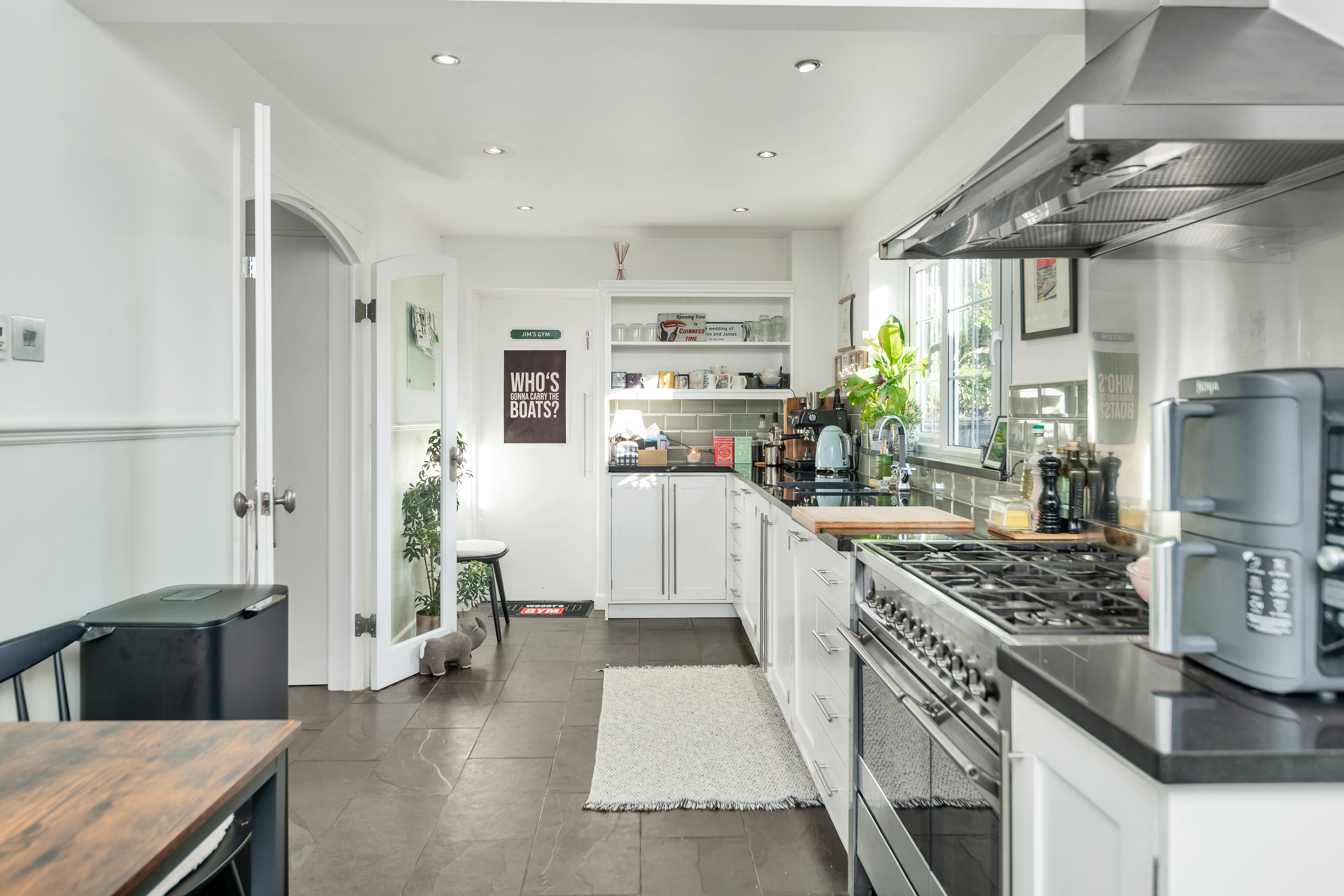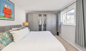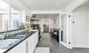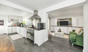 The kitchen/dining room is wonderfully open-plan, enjoying a large window to a garden aspect, a range of modern kitchen units, quartz worktops, tiled flooring and splashbacks, a range cooker, an extractor hood, an integrated dishwasher, and space for an American fridge/freezer, dining setting and other small kitchen appliances.