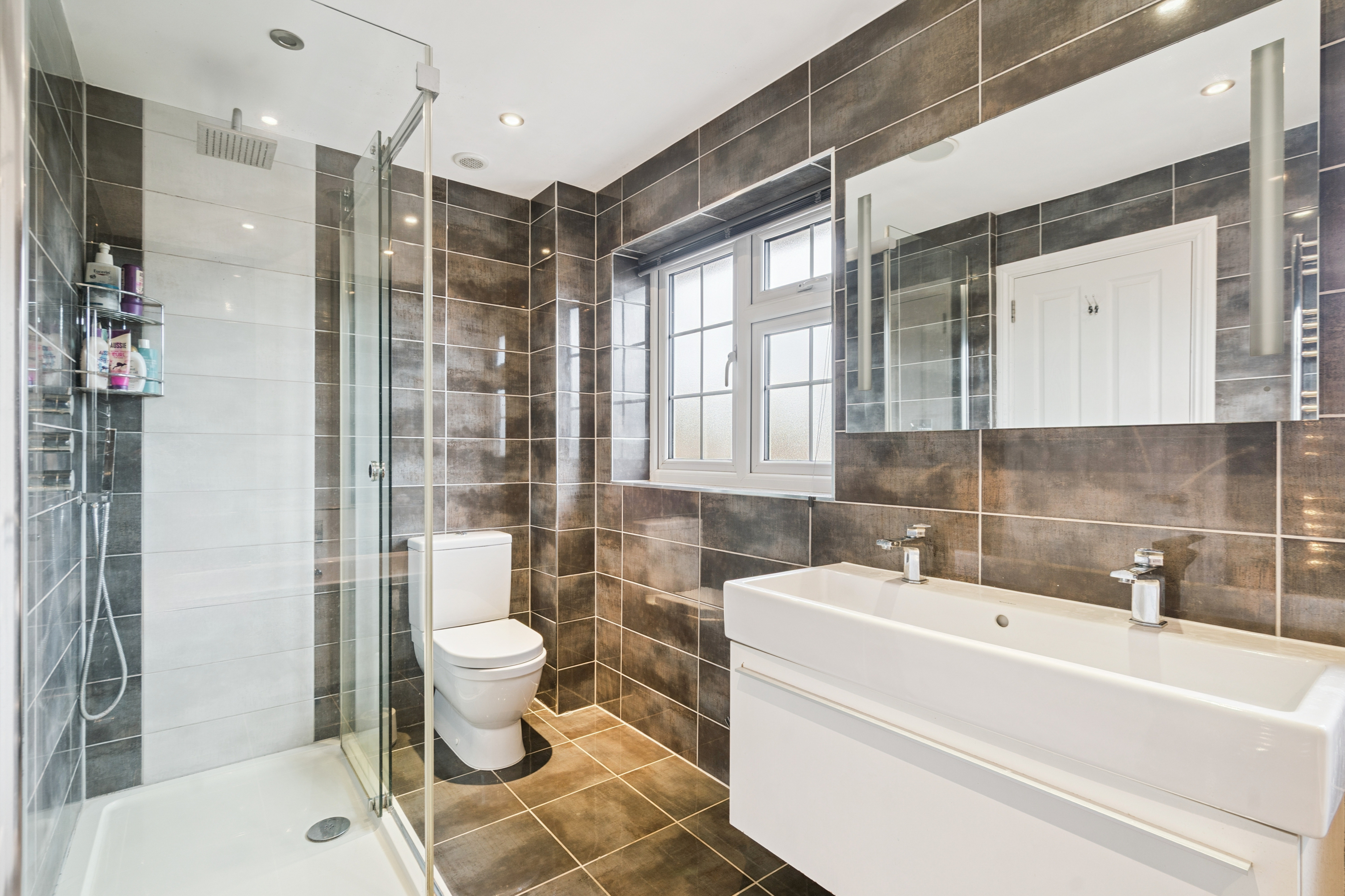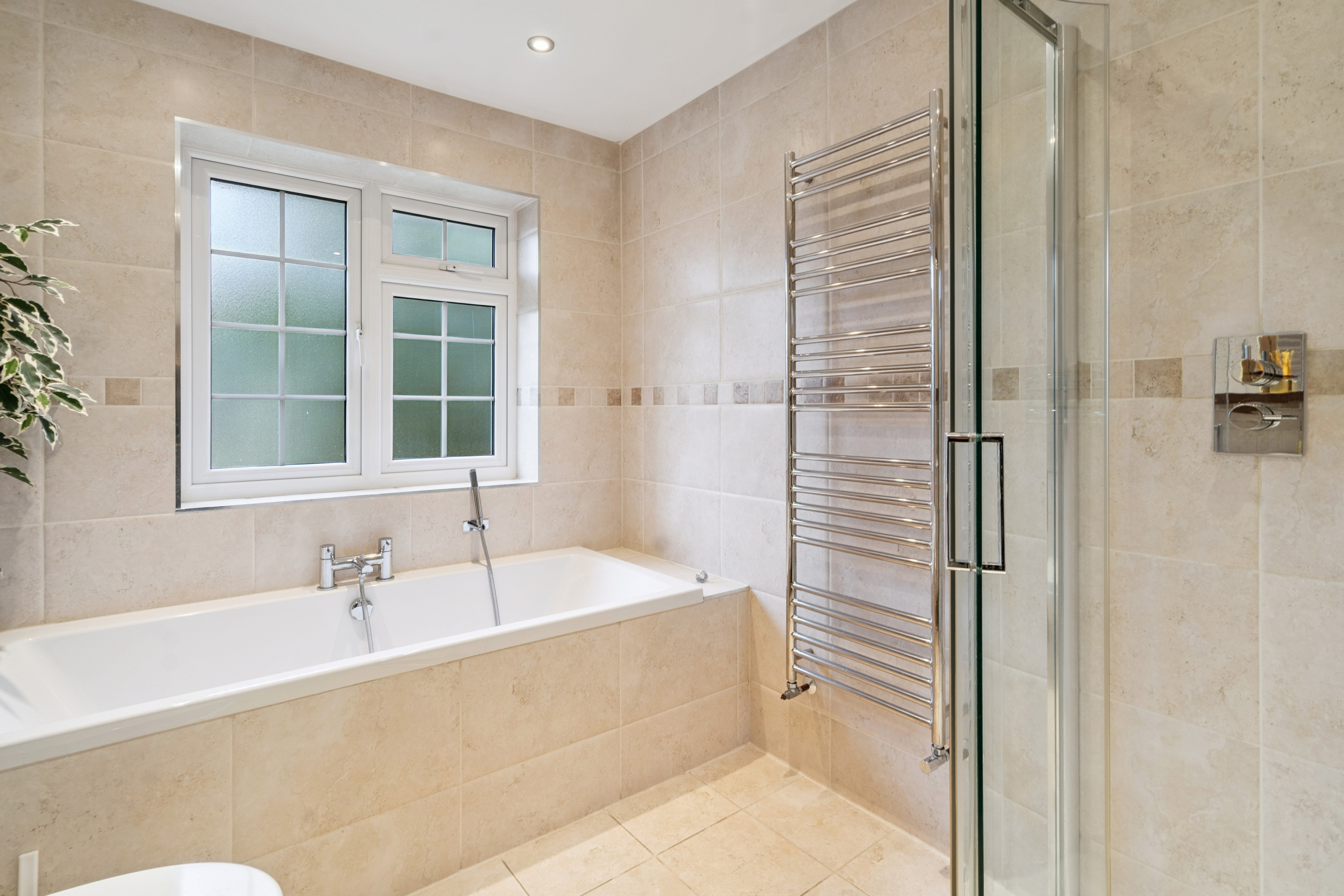 The family bathroom offers a panelled bath, heated towel rail, separate shower cubicle, and a floating ceramic vanity with storage underneath, along with an additional wall-mounted cabinet and mirror.