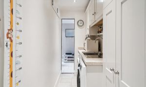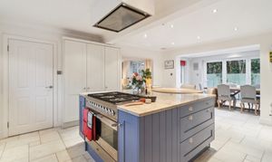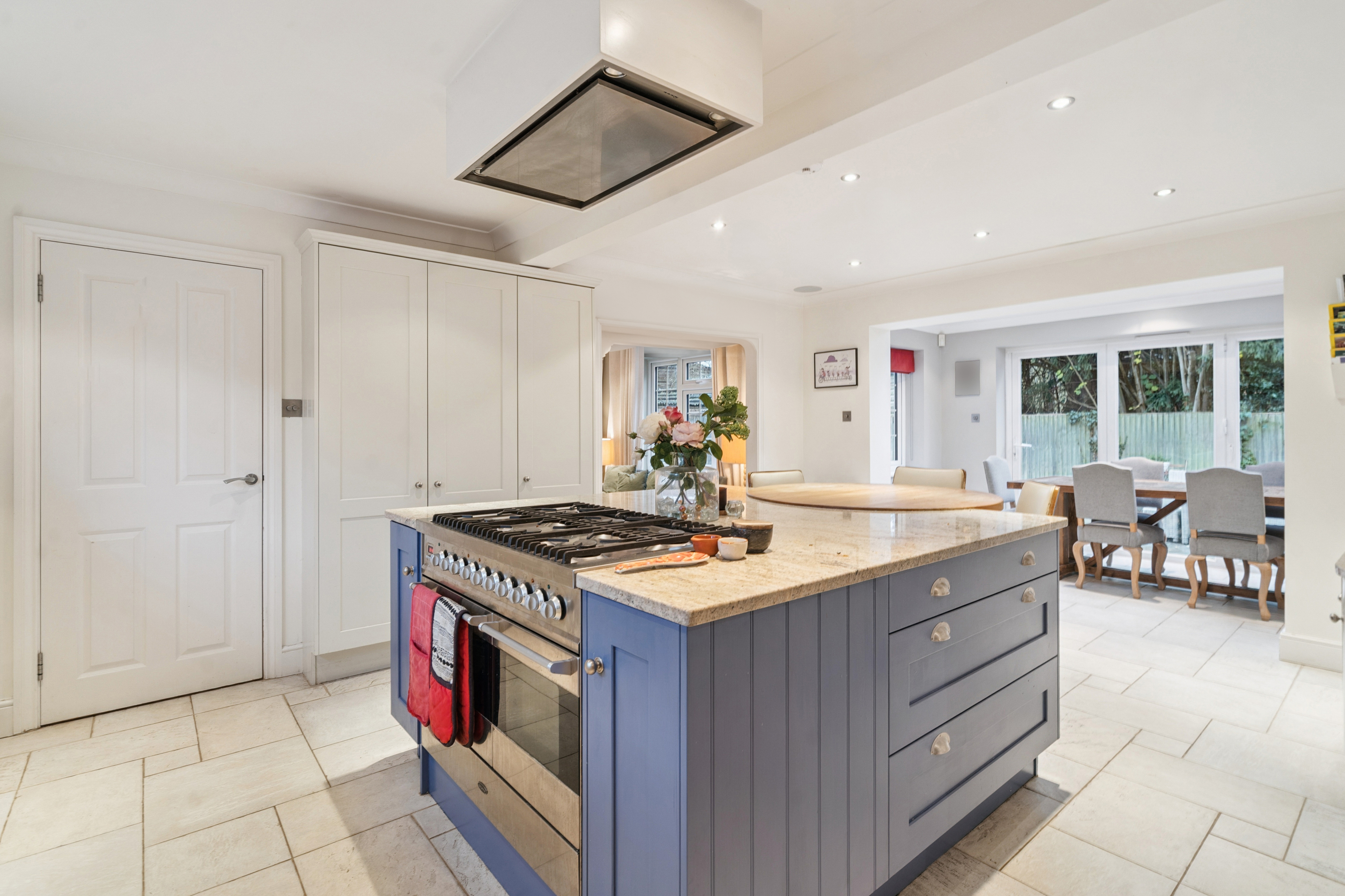 The heart of the home is the impressive open-plan kitchen/dining area, centred around a generous island. The kitchen offers a range of neutral base and wall units and includes integrated appliances such as a double electric oven, six-ring gas hob, and dishwasher, along with an American-style fridge freezer. A separate utility area has further storage cupboards and also provides plumbing and space for a washing machine and dryer.