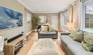 Inside, the entrance hall features engineered wood flooring that continues through the hallway and into the living room. To the front of the home is a bright, dual-aspect reception room, and a downstairs WC is located off the hallway.