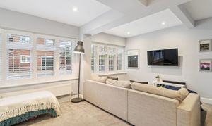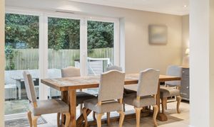 The dining area comfortably accommodates a large table and chairs and enjoys bi-fold doors opening onto the rear terrace. A large skylight floods the room with natural light, and electric underfloor heating runs throughout the kitchen and dining space. Sonos speakers are installed in the kitchen and the adjacent living room for integrated audio.