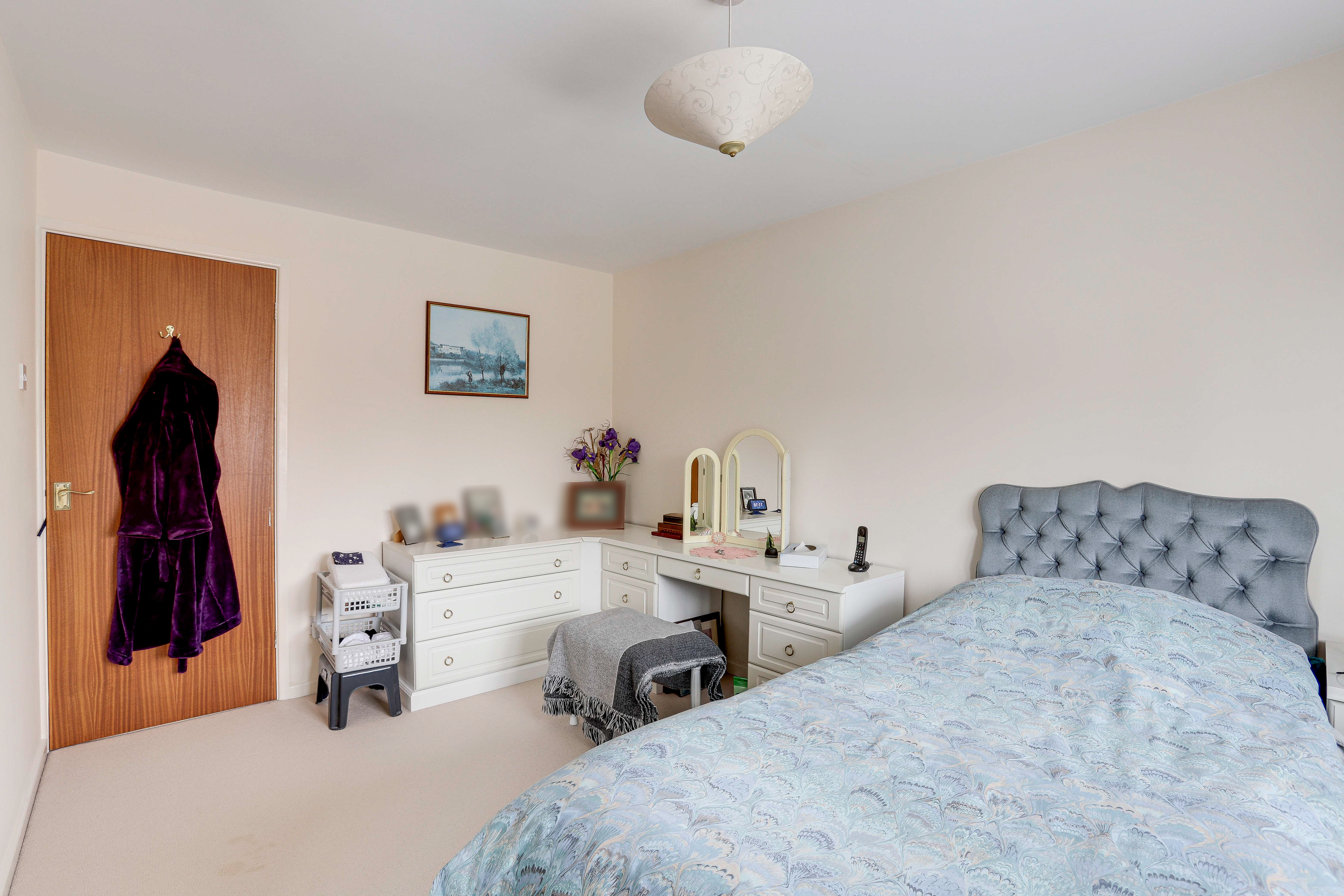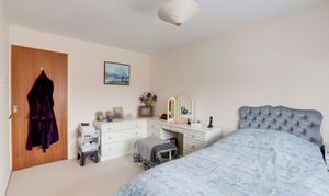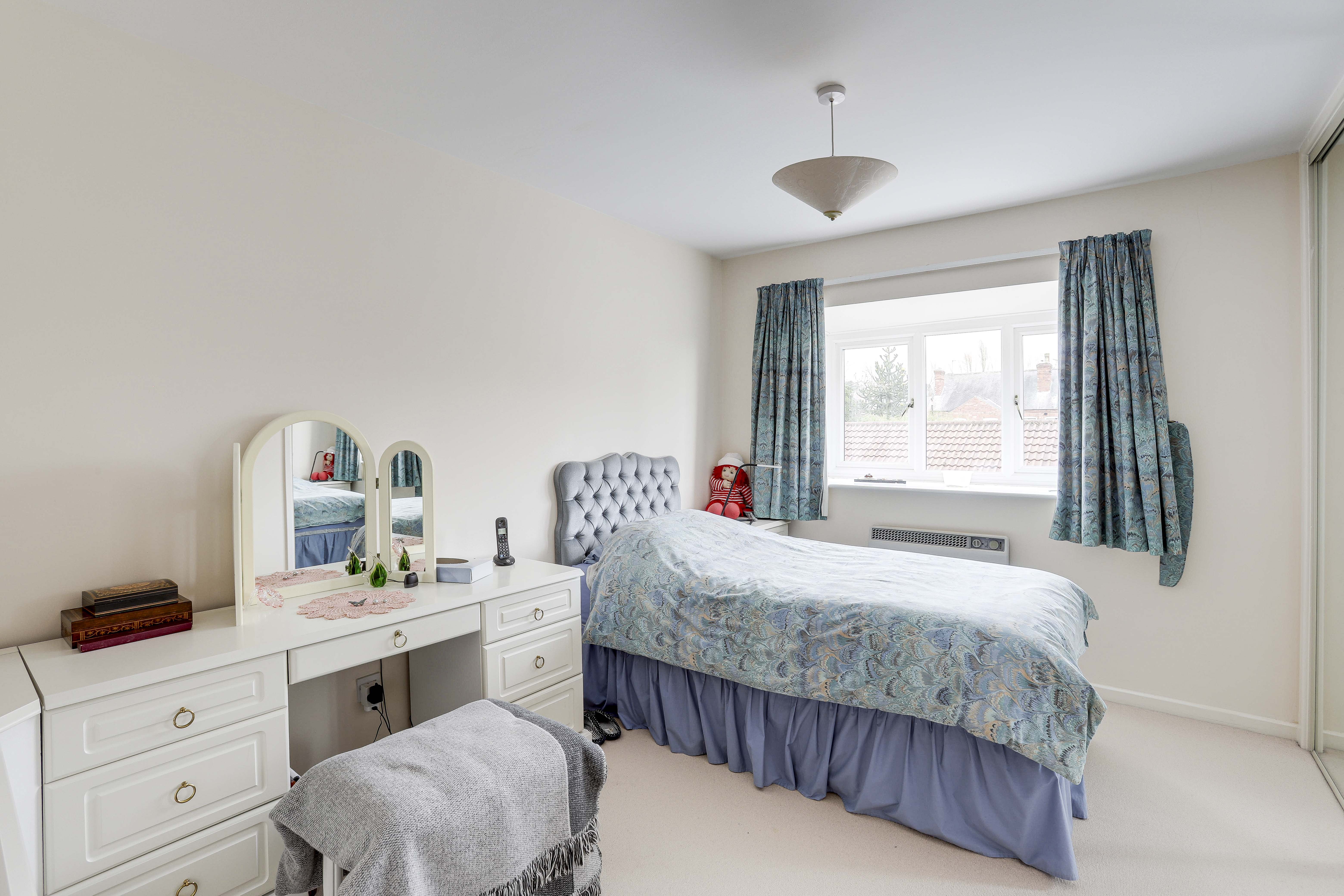 The main bedroom has a UPVC double-glazed window to the front elevation, carpeted flooring, an electric room heater and a built-in mirrored wardrobe.