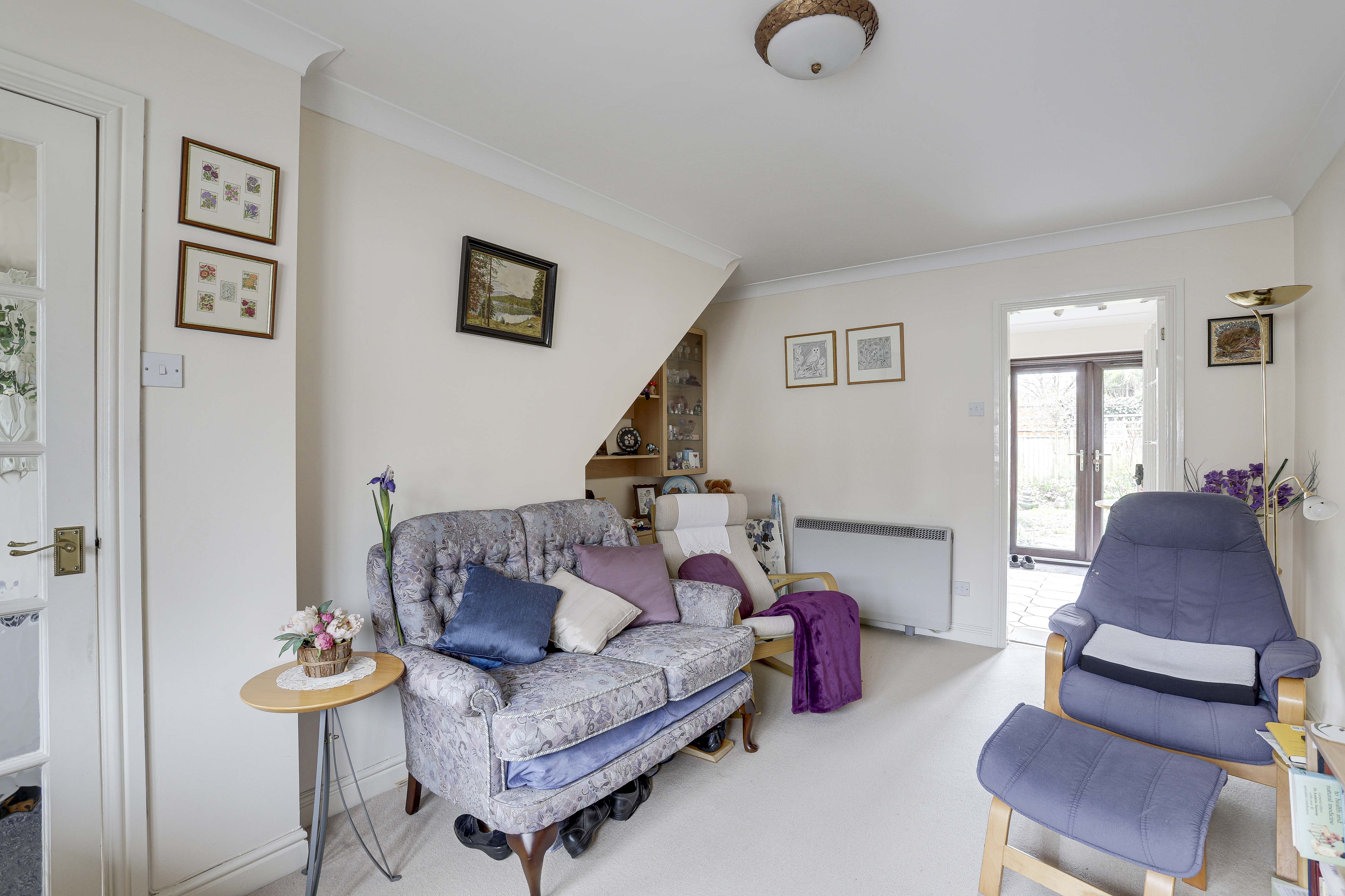 The living room has a UPVC double-glazed window to the front elevation, carpeted flooring, an electric room heater and coving.