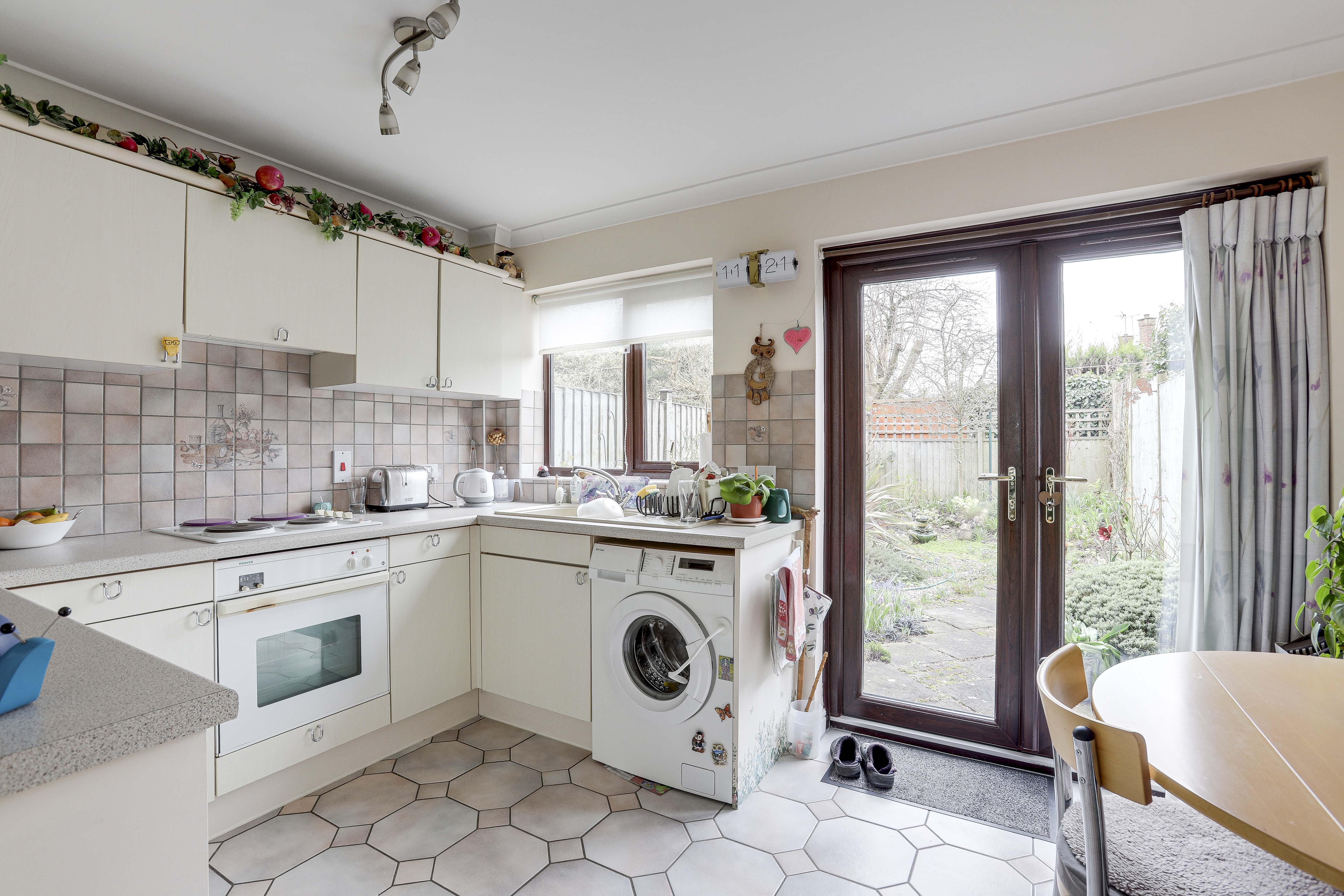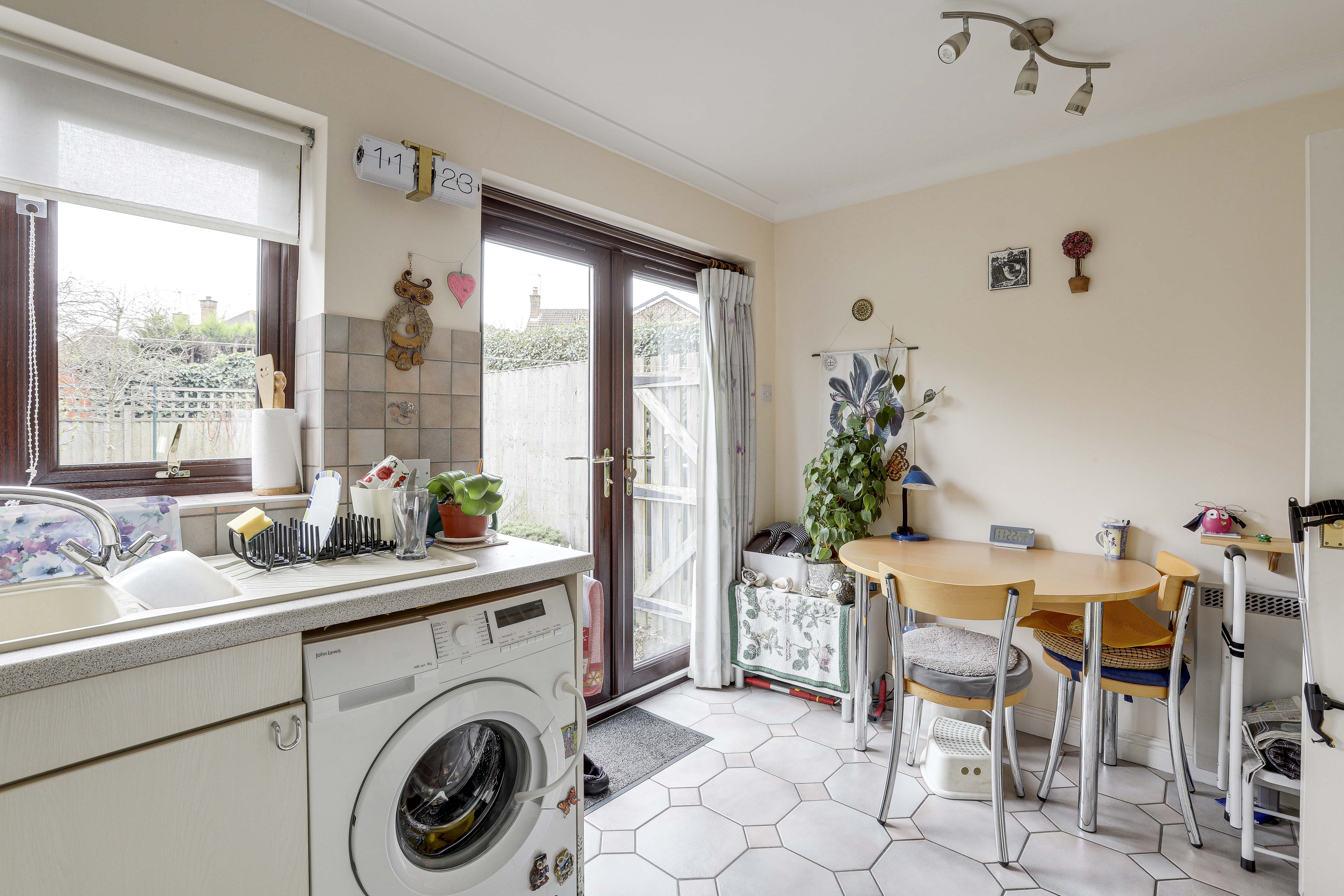 The kitchen-diner has a range of fitted base and wall units with worktops and a tiled splashback, an integrated oven and fridge, a gas hob with an extractor hood, a sink and a half with a drainer, a washing machine, tiled flooring, an electric room heater, coving, a UPVC double-glazed window to the rear elevation and UPVC double French doors providing access out to the garden.