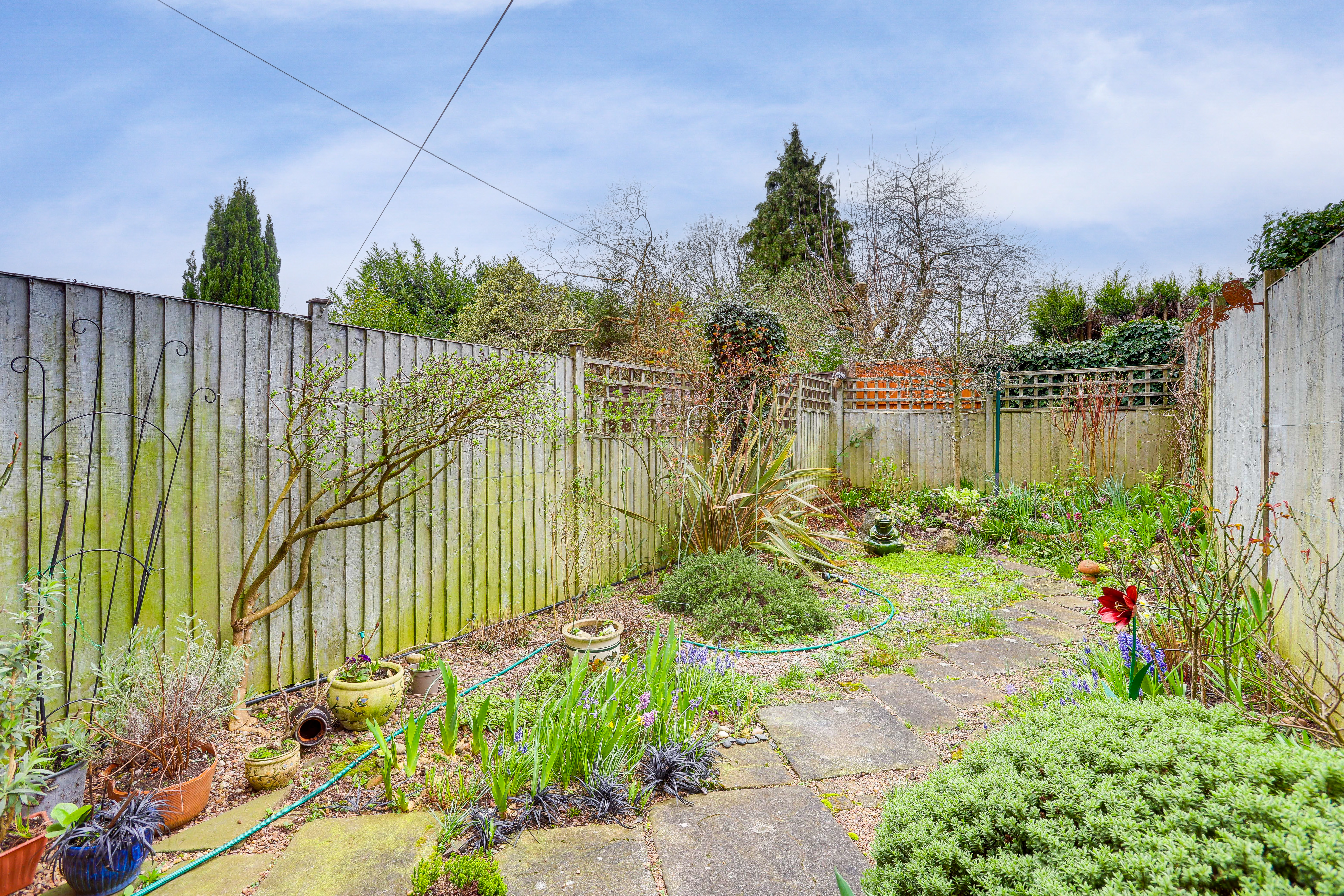 To the rear is a private garden with a paved patio, various plants, a water feature, a single gate and fence-panelled boundaries.