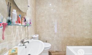 The spacious layout includes two double bedrooms and one single bedroom, ensuring comfort and versatility for residents. This well appointed three piece bathroom suite offers a clean, functional design with a timeless appeal. The suite includes a full size bathtub, a modern pedestal basin, and a close coupled toilet, all finished in classic white for a fresh, neutral look. Subtle fixtures and fittings provide a contemporary touch, while tiled walls and flooring ensure easy maintenance and durability. High ceilings throughout the property enhance the sense of grandeur and openness, creating a bright and welcoming atmosphere in every room.