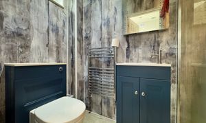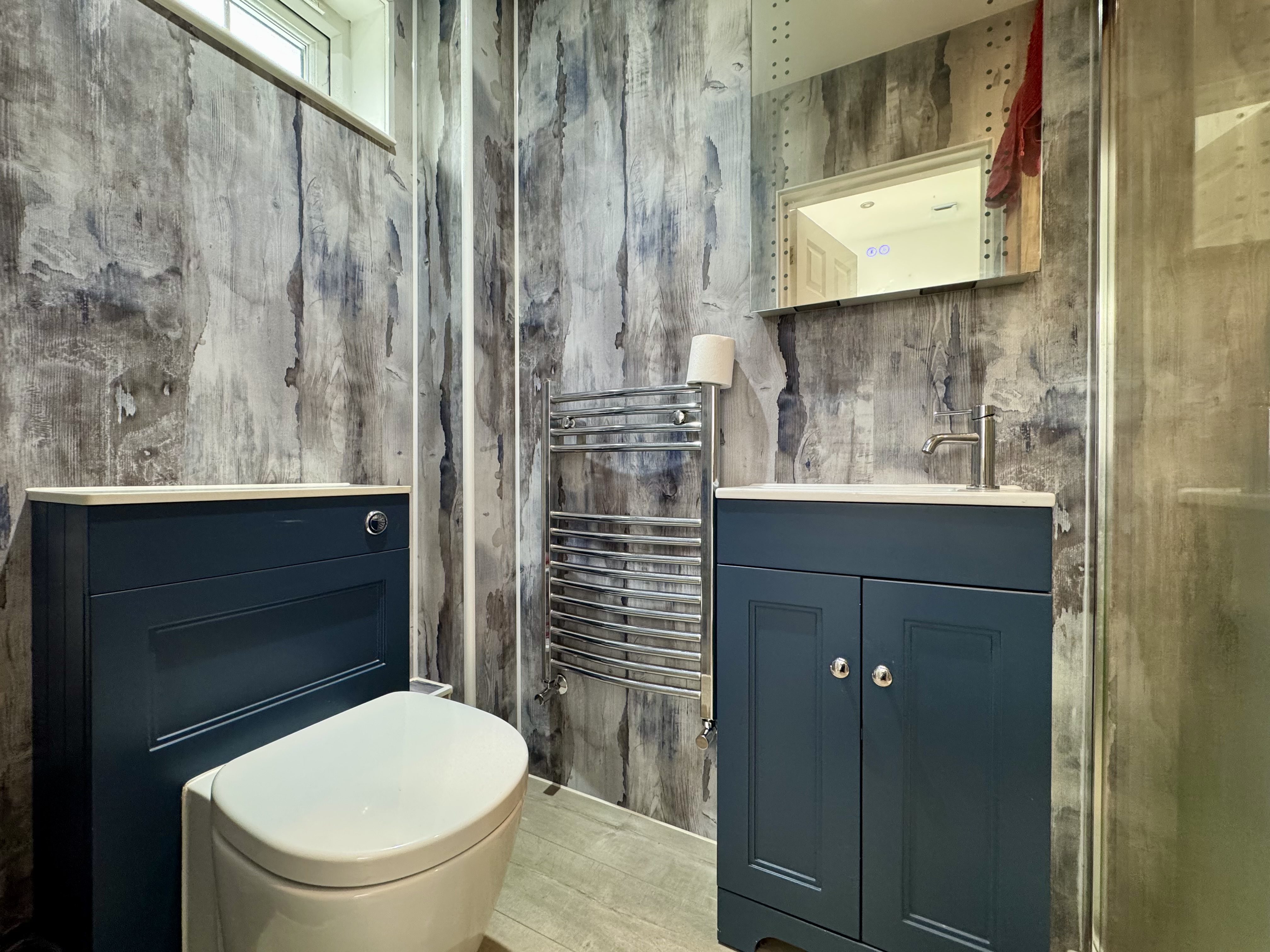 Upstairs, there are two double bedrooms and one single bedroom, suitable as a study or office. The main bathroom includes both a bath and a shower.
