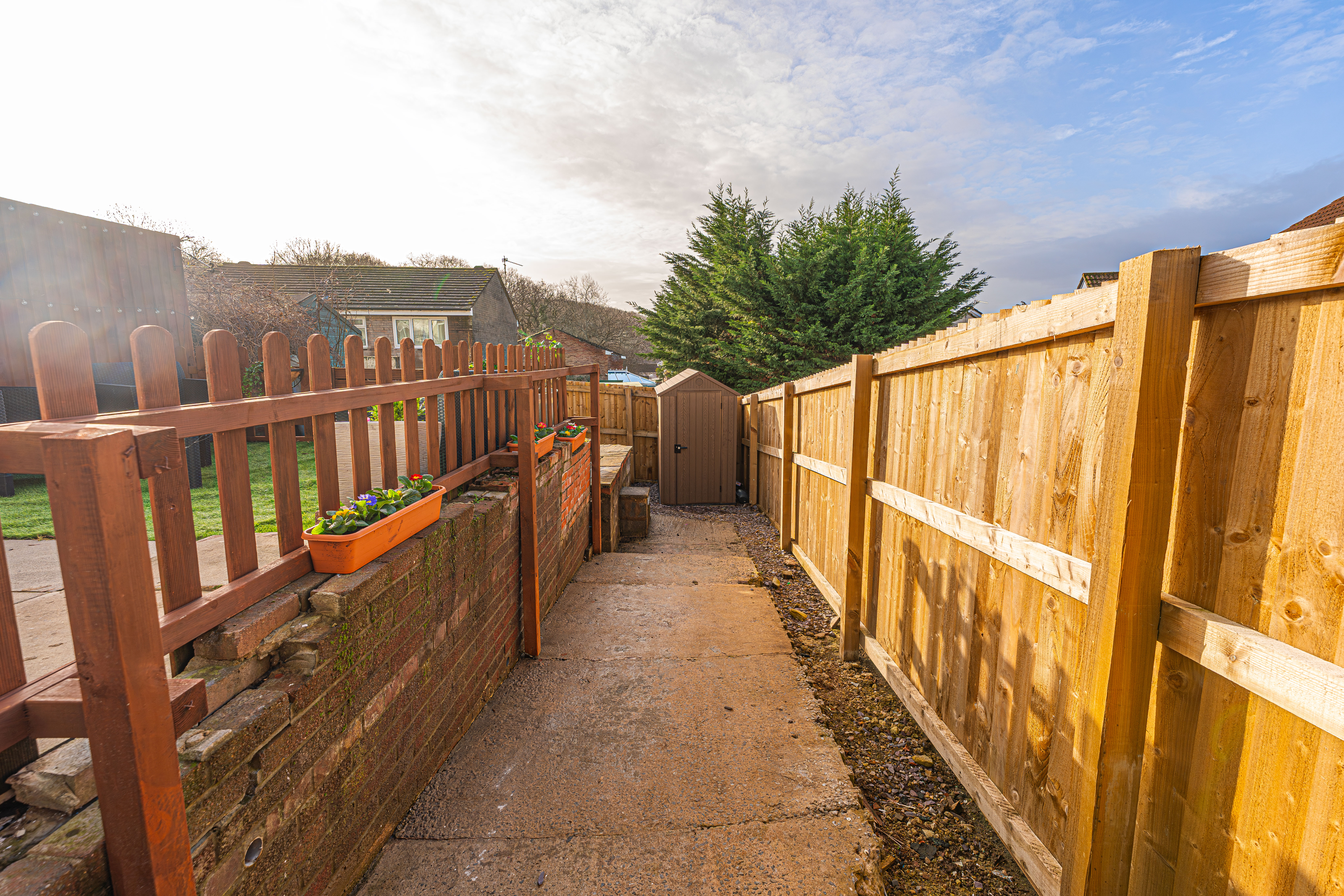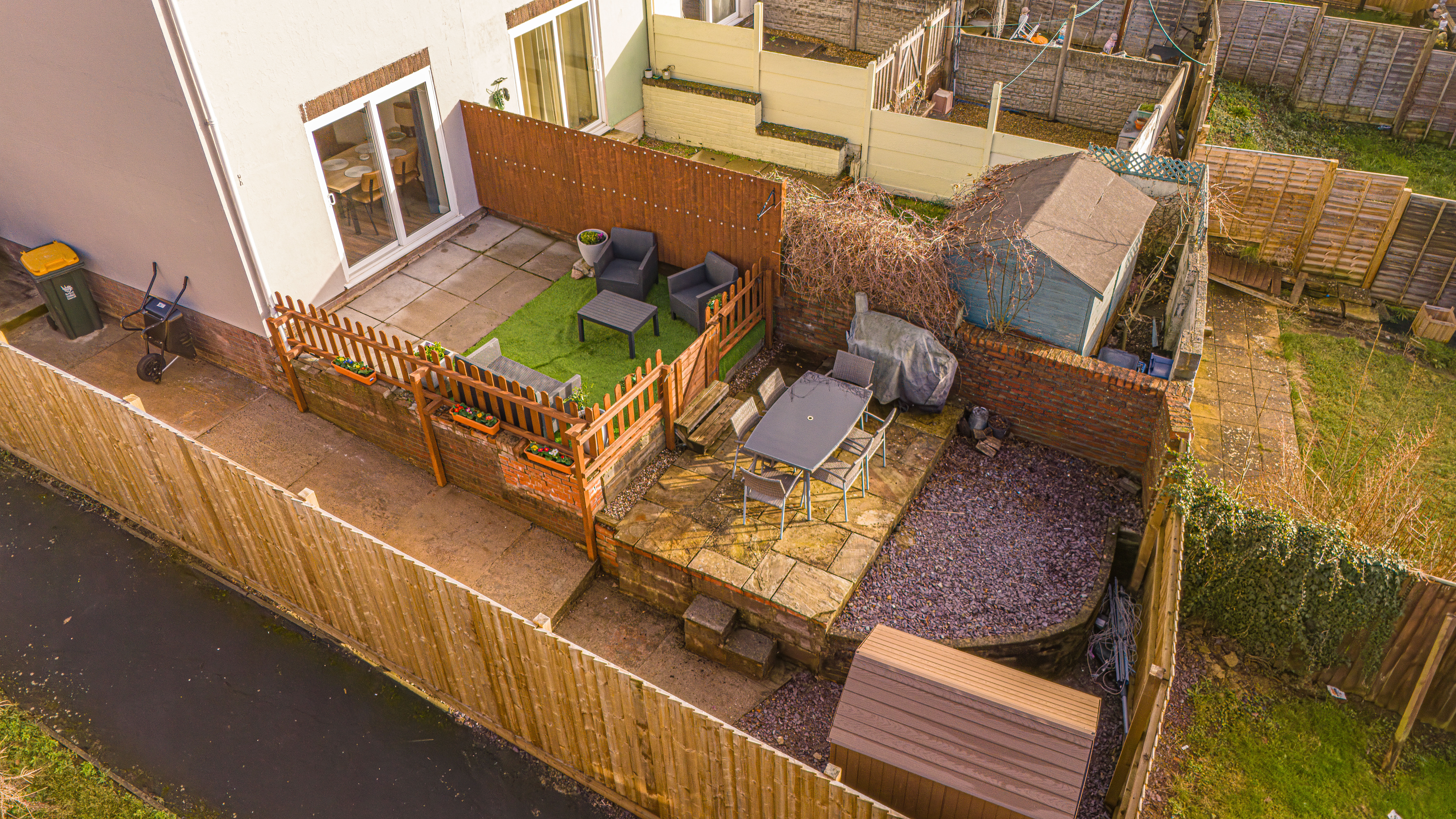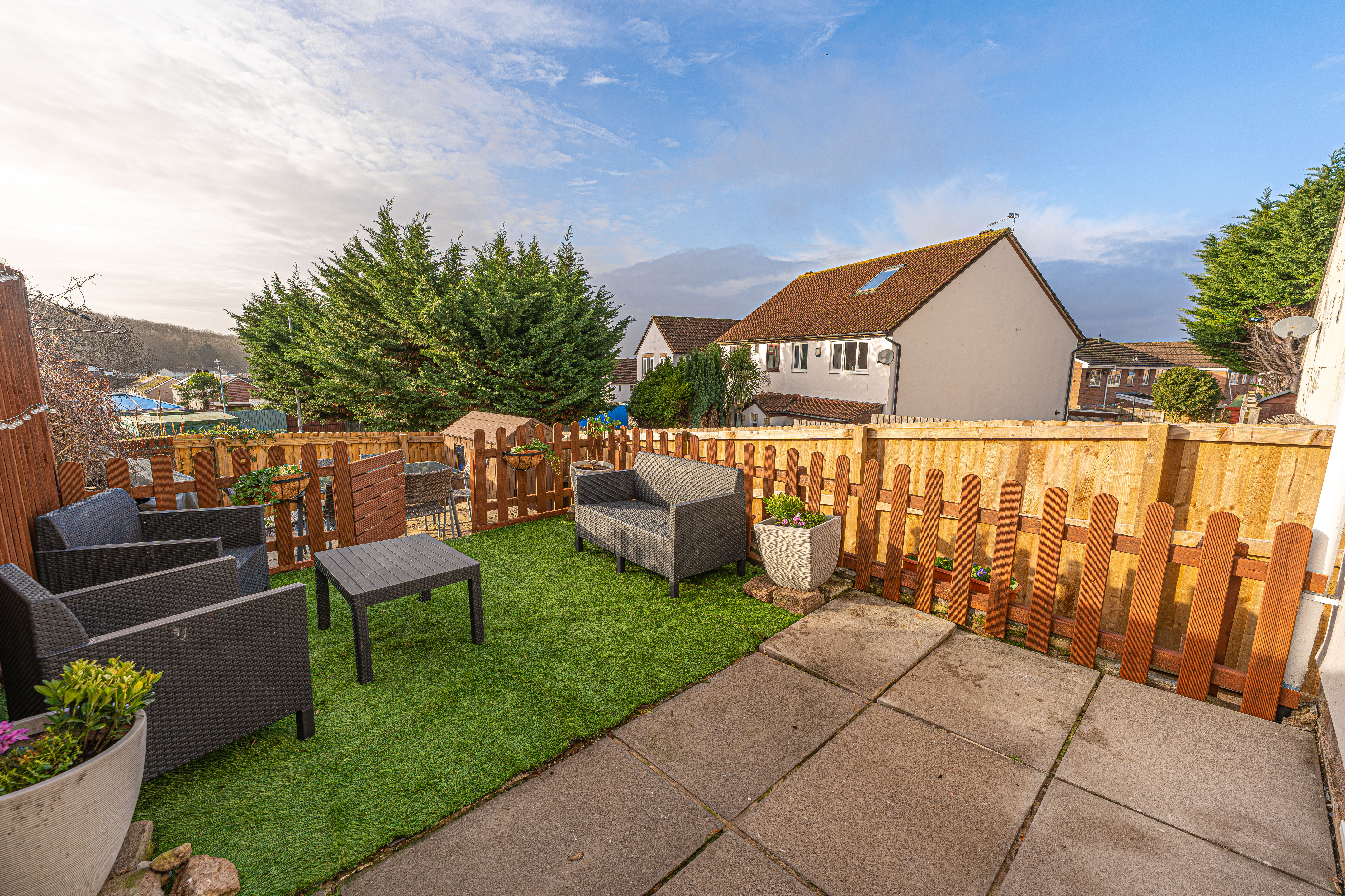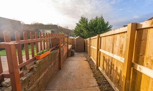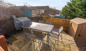 The enclosed south-facing rear garden offers low-maintenance artificial lawn, patio seating area and storage shed, ideal for outdoor entertaining. Side access provides practical storage space for bikes or motorcycles.