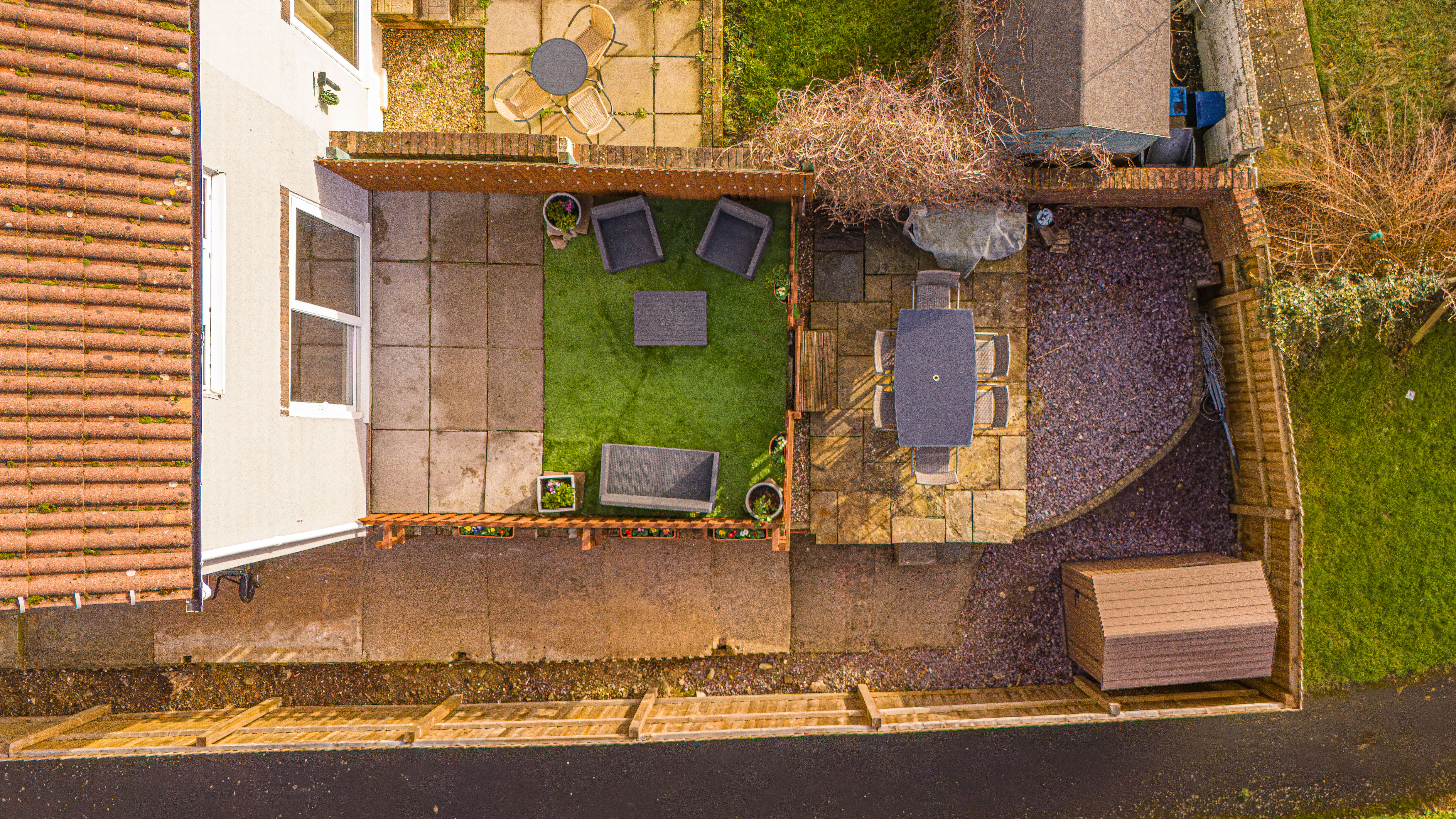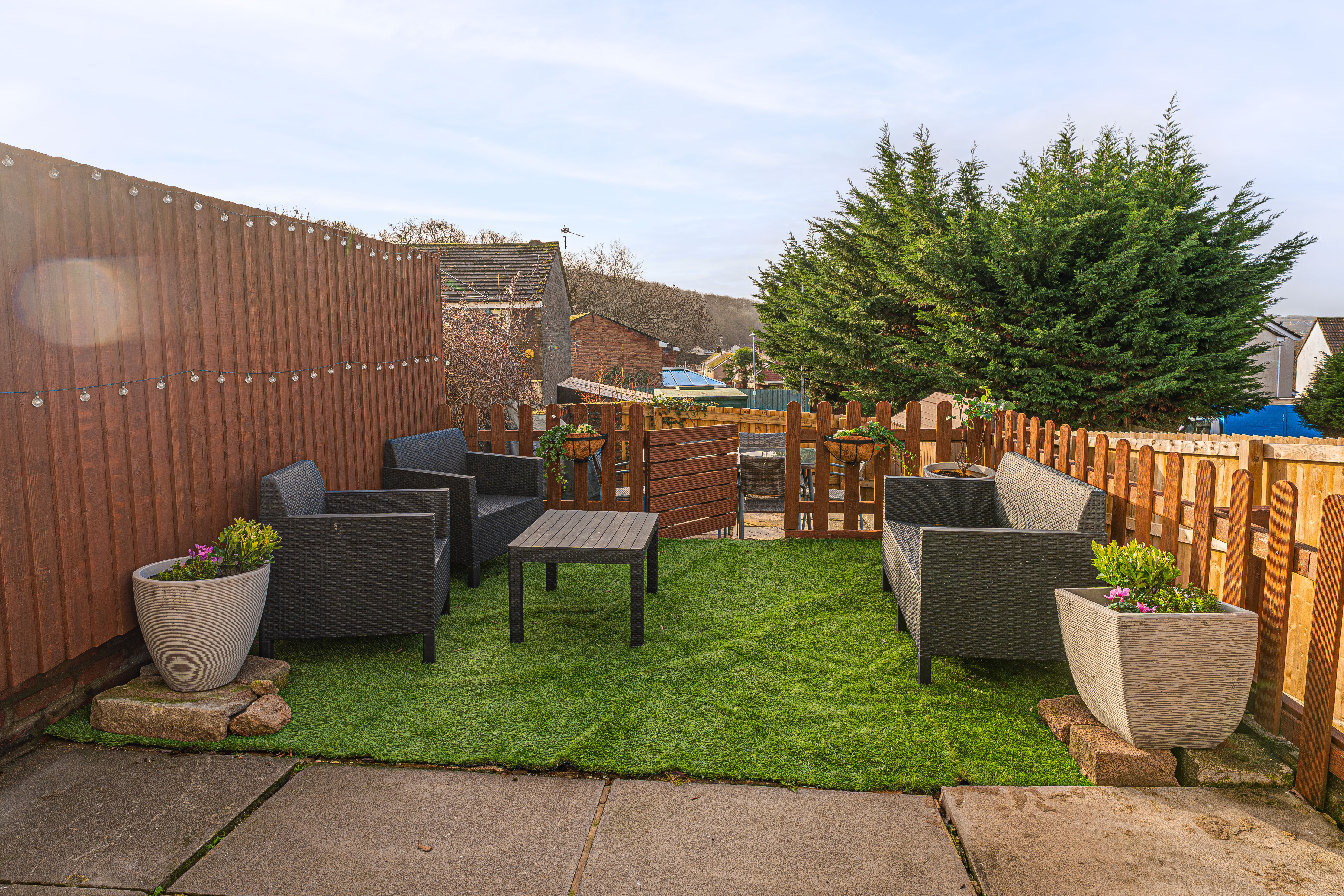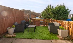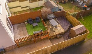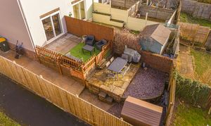 The enclosed south-facing rear garden offers low-maintenance artificial lawn, patio seating area and storage shed, ideal for outdoor entertaining. Side access provides practical storage space for bikes or motorcycles.