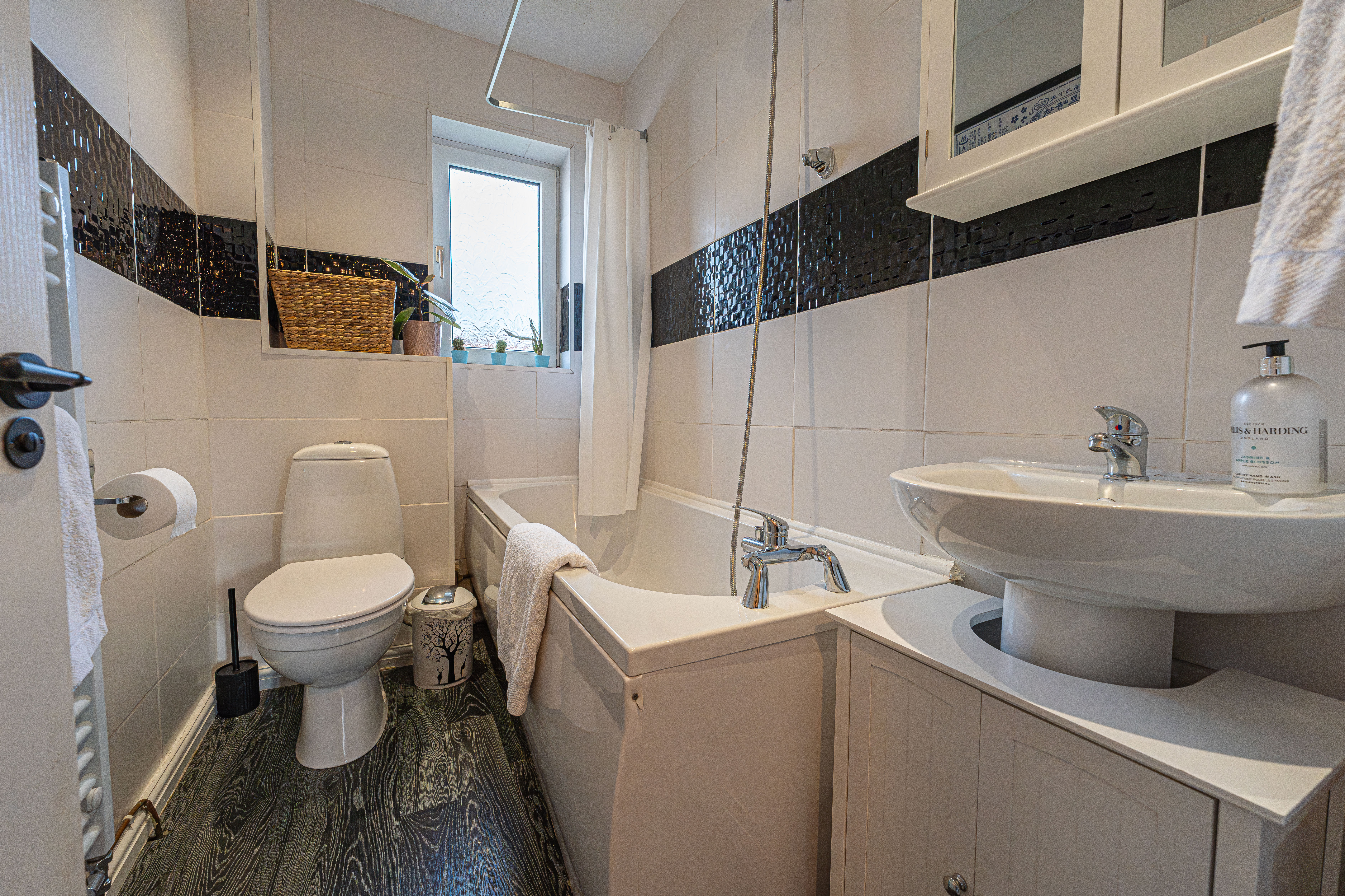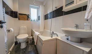 Family bathroom with bath and overhead shower
