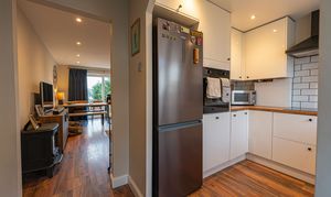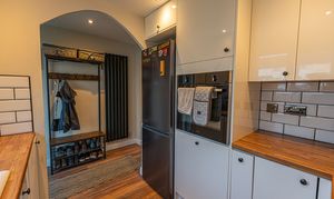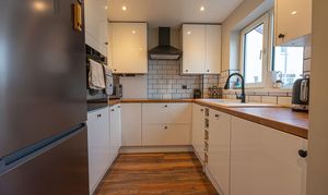The modern fitted kitchen has been recently installed and includes an integrated oven, hob, dishwasher and washing machine, along with ample high-gloss storage units.
