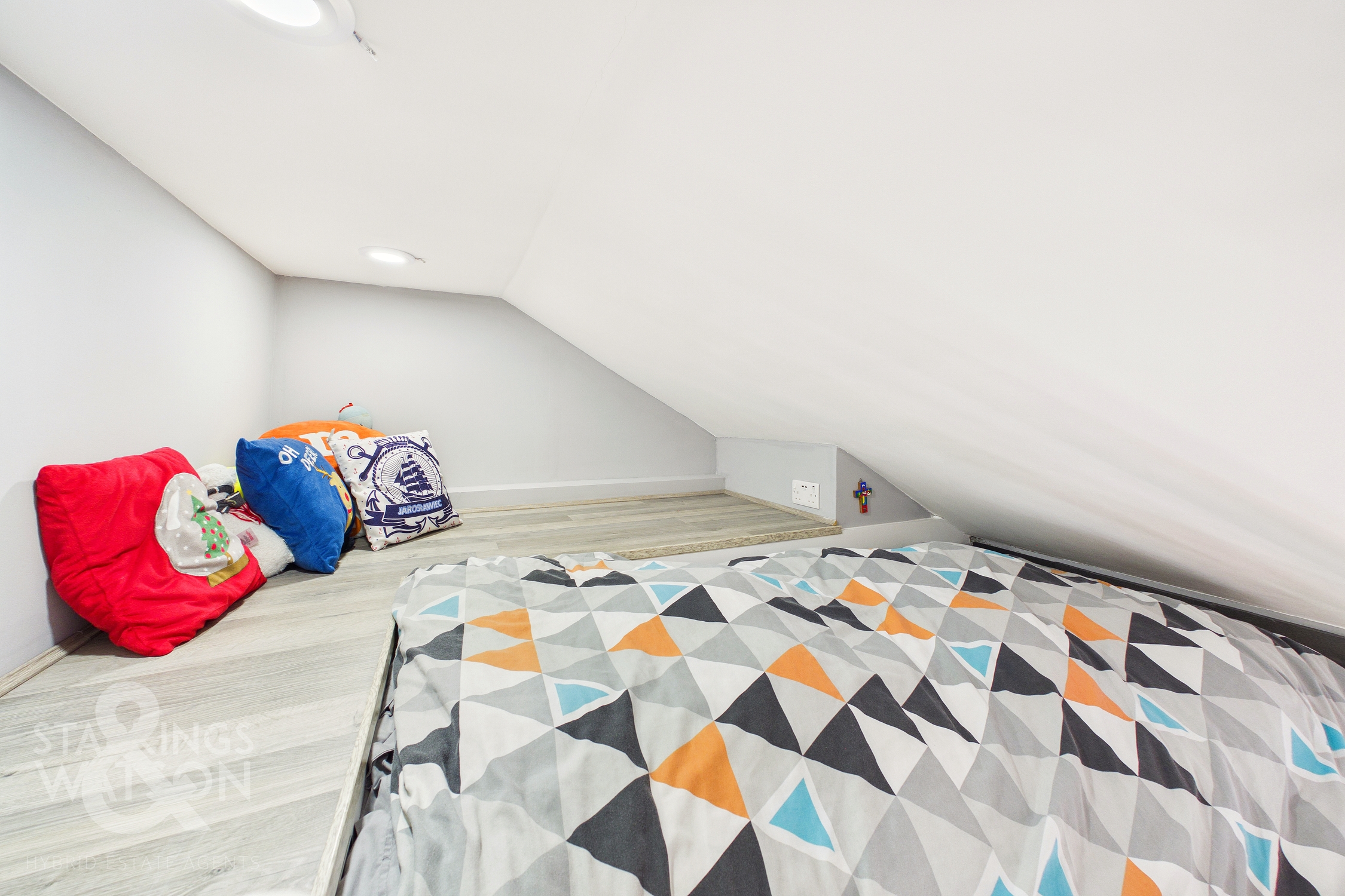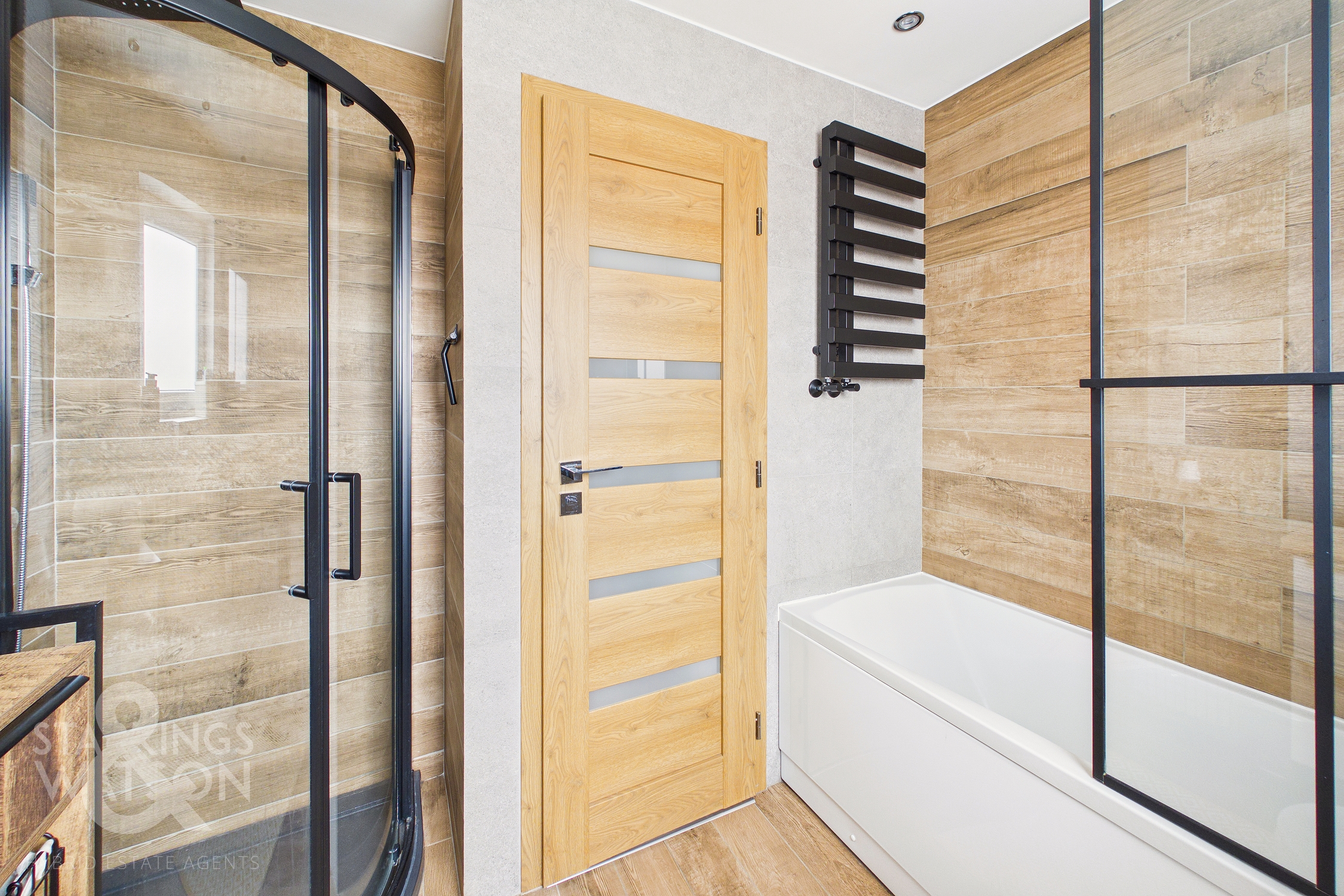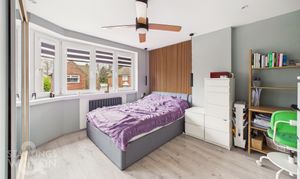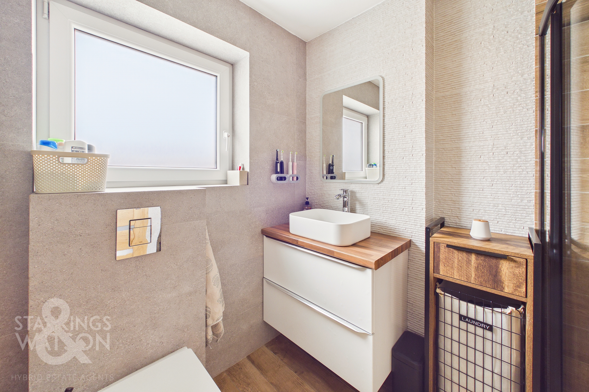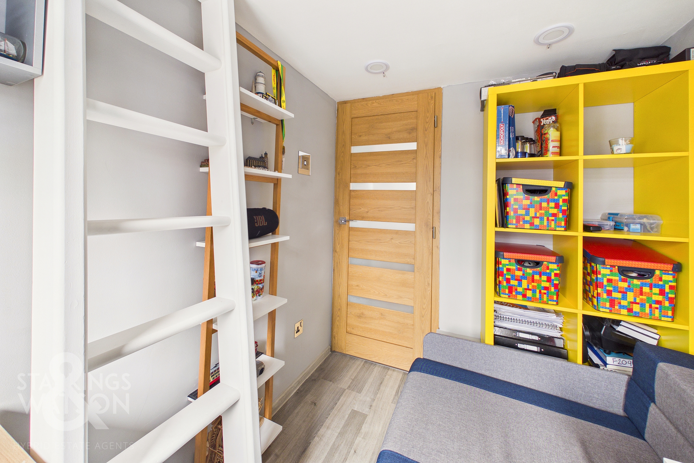 Ascending to the first floor landing, loft access can be found overhead while newly replaced internal doors open to three bedrooms. The main bedroom enjoys wood effect flooring with a continued bay window to the front, featuring skimmed ceilings and a ceiling mounted fan, with plenty of space for a large bed and storage furniture. The second bedroom is of a similar size, currently used for a double bed with further space utilised for a large wardrobe and a desk, enjoying a rear facing aspect overlooking the garden. The quirky third bedroom has been well optimised and adapted to include a fully plastered mezzanine floor providing useful storage space and room for a single bed with power sockets. Completing the accommodation, the four piece family bathroom has been remodelled to include a bath with a movable shower head and glass splashback, a wall mounted heated towel rail, a glass enclosed shower cubicle and vanity storage below the sink, perfect for family living.