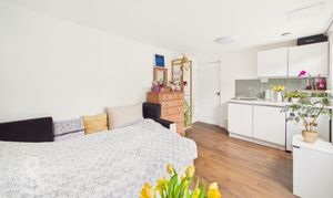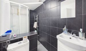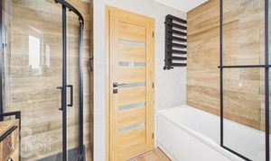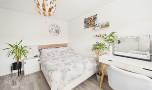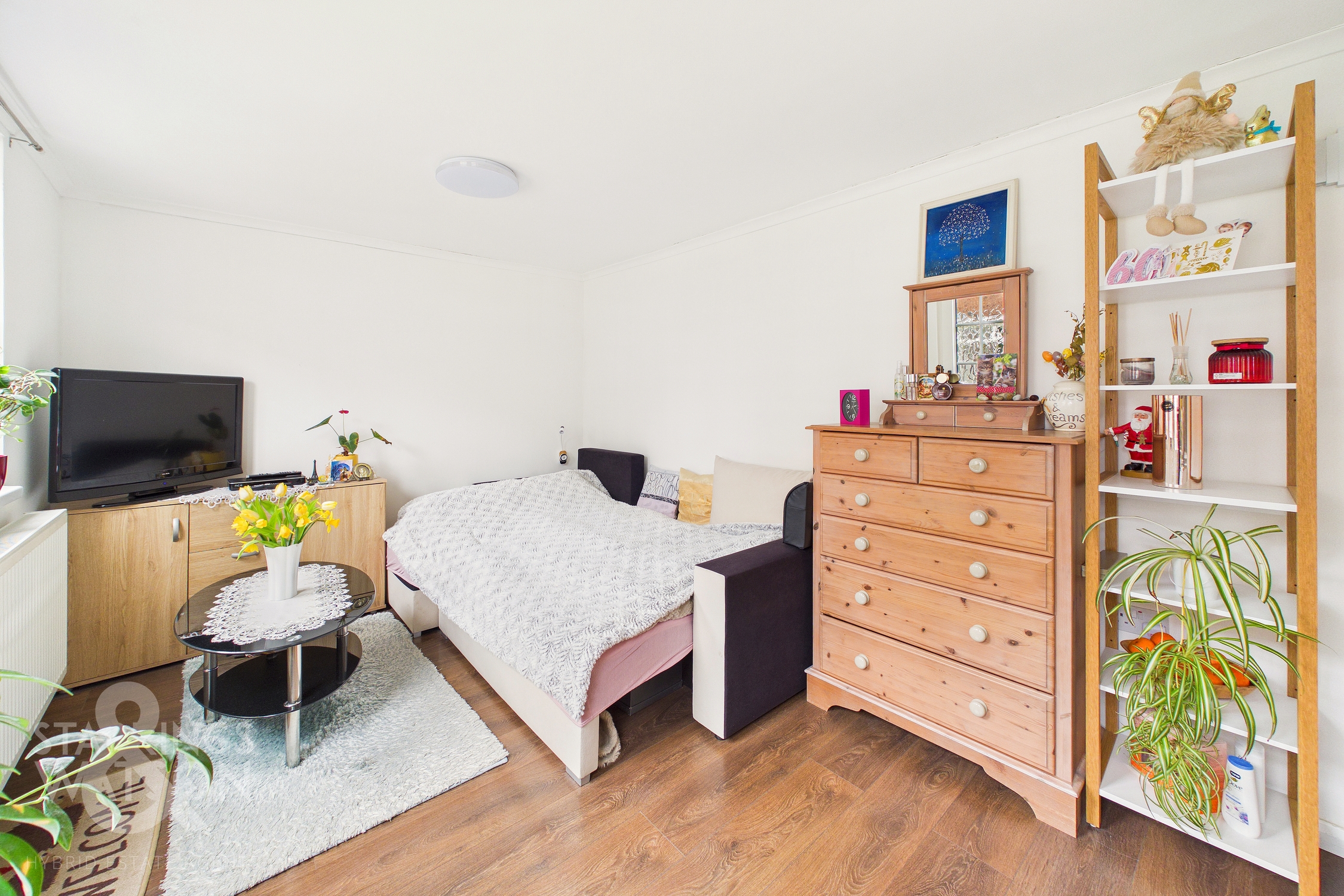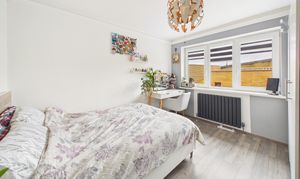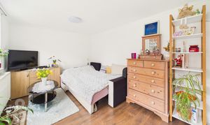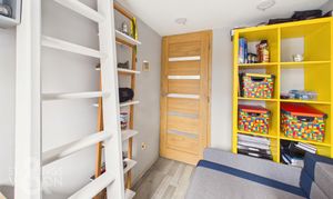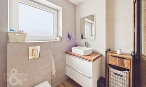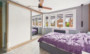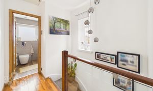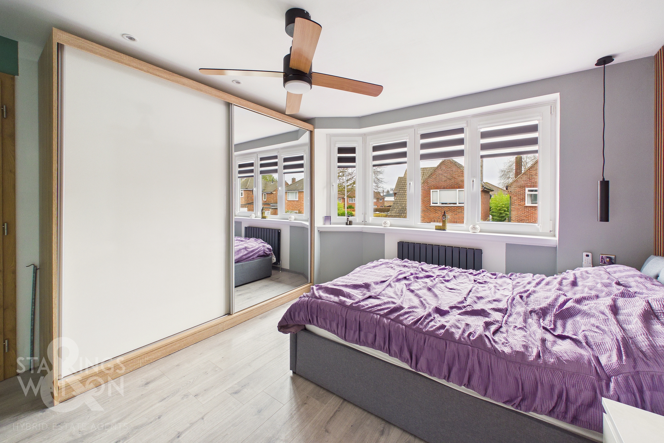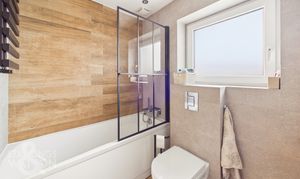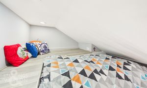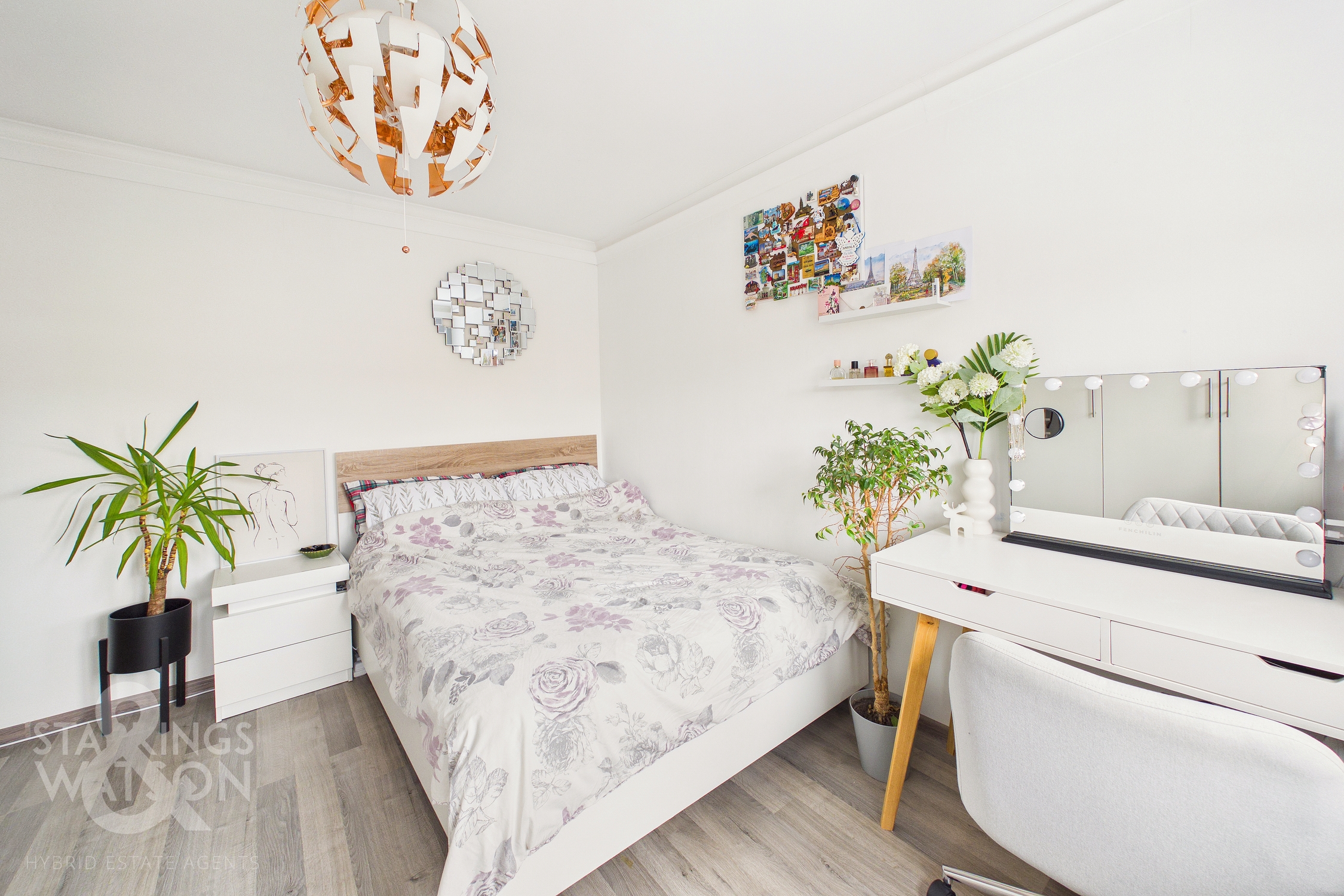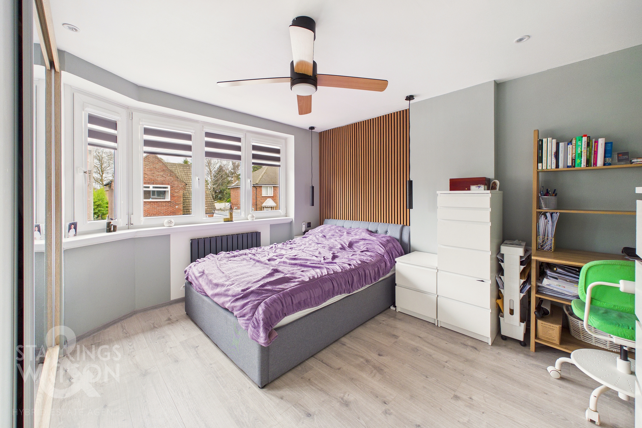Ascending to the first floor landing, loft access can be found overhead while newly replaced internal doors open to three bedrooms. The main bedroom enjoys wood effect flooring with a continued bay window to the front, featuring skimmed ceilings and a ceiling mounted fan, with plenty of space for a large bed and storage furniture. The second bedroom is of a similar size, currently used for a double bed with further space utilised for a large wardrobe and a desk, enjoying a rear facing aspect overlooking the garden. The quirky third bedroom has been well optimised and adapted to include a fully plastered mezzanine floor providing useful storage space and room for a single bed with power sockets. Completing the accommodation, the four piece family bathroom has been remodelled to include a bath with a movable shower head and glass splashback, a wall mounted heated towel rail, a glass enclosed shower cubicle and vanity storage below the sink, perfect for family living.