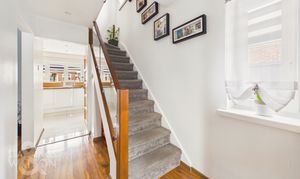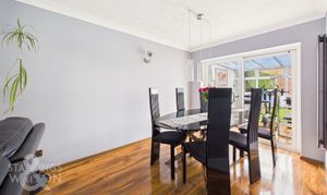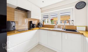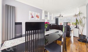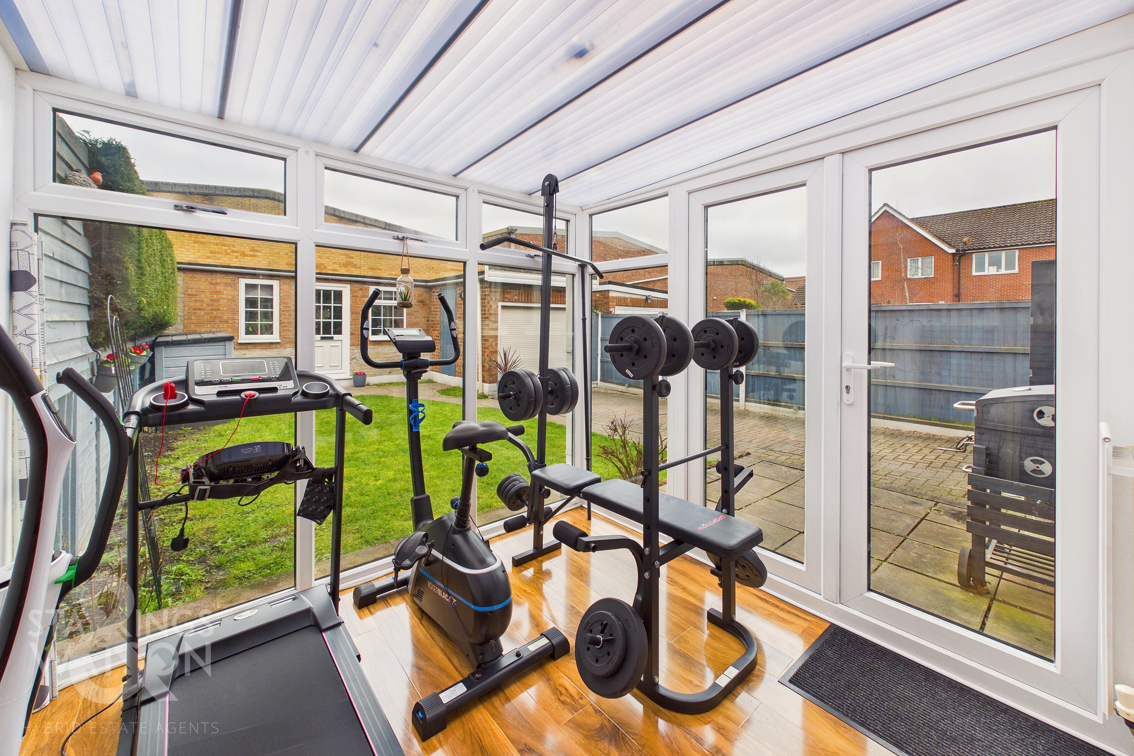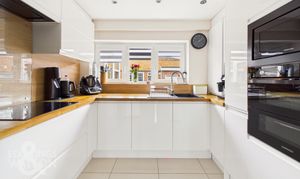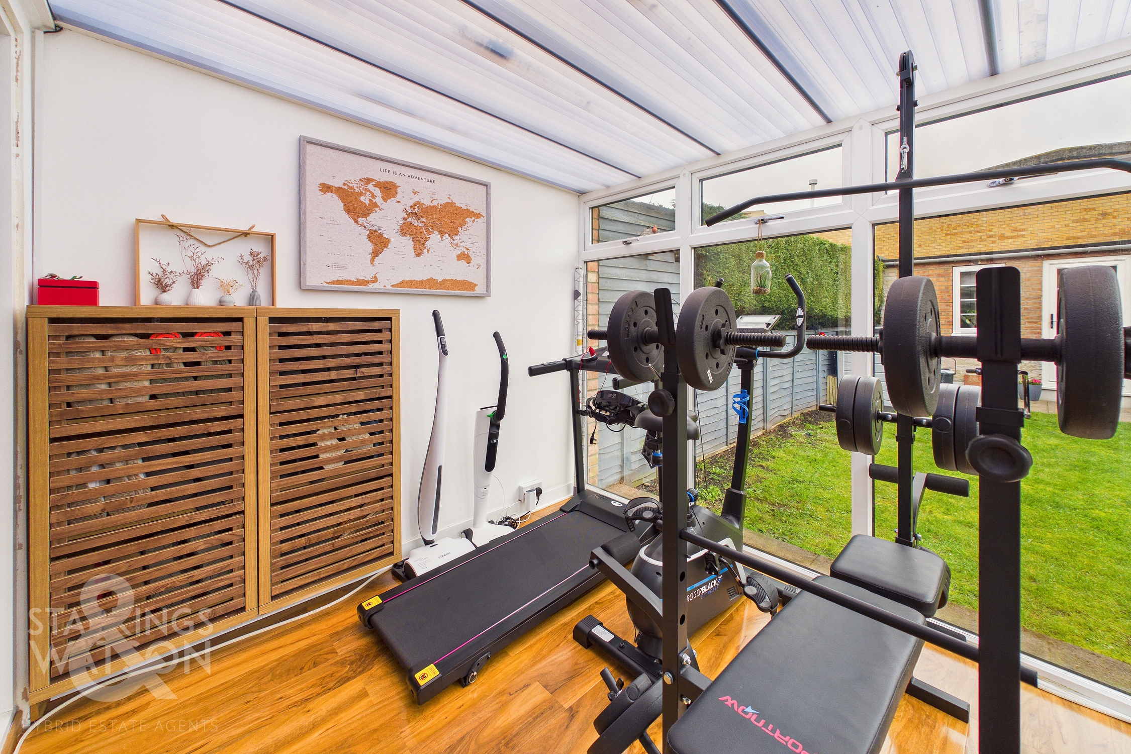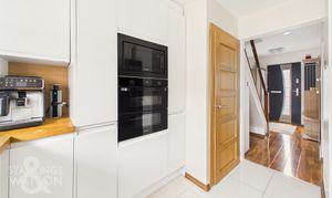Stepping inside, the light and bright hallway entrance offers stairs rising to the first floor with useful storage beneath ideal for storing coats and shoes. Ceilings throughout the property have been skimmed and LED spotlights installed, ensuring the home is flooded with light. High gloss wood flooring runs underfoot and continues into the heart of the home, the 23’ open plan sitting and dining room. The sitting room space enjoys a bay window to the front aspect for a bright feel, featuring a designer wall radiator and ample space for various soft furnishing layouts. Moving through the room, plenty of space is available for a formal dining table, beyond, sliding French doors open to the fully uPVC double glazed conservatory. This room features continued high gloss wood flooring and panoramic garden views, currently utilised as a home gym but also making a perfect space for additional soft furnishings or as a home office. At the end of the hall, the walkway leads to the refitted modern kitchen. This space includes a range of wall and base storage units, a useful pantry cupboard with plumbing for a washing machine, and integrated appliances including a dishwasher, double oven and microwave. Worktops wrap around providing plenty of space for food preparation with additional room for a freestanding ‘American’ style fridge/ freezer and tiled flooring runs for ease of maintenance.
