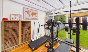 THE GREAT OUTDOORS Stepping outside, the private rear garden is fully enclosed by timber panel fencing and initially opens to a flagstone patio, ideal for outdoor furniture and alfresco dining during the summer months. The brick weave driveway continues to the right, leading to the garage which features an electrically operated roller door and a pedestrian side door. The remainder of the garden is predominantly laid to a well maintained lawn, with patio walkways leading to the side of the garage and a separate outbuilding. This versatile outbuilding has been fully insulated and benefits from heating and electrics, offering space for a double bed and soft furnishings. It also features a kitchenette with undercounter space for a fridge, wall and base units, and a sink. A door at the end of the room leads to a separate three piece shower room, complete with a glass enclosed shower cubicle, a wall mounted heated towel rail, and vanity storage below the sink.