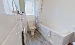 Fitted with dual flush WC, pedestal wash hand basin and bath with electric shower over. Opaque glazed window with venetian blind. Tiled to ceiling height around bath and wash hand basin and to dado height on other wall. Vinyl floorcovering, radiator.