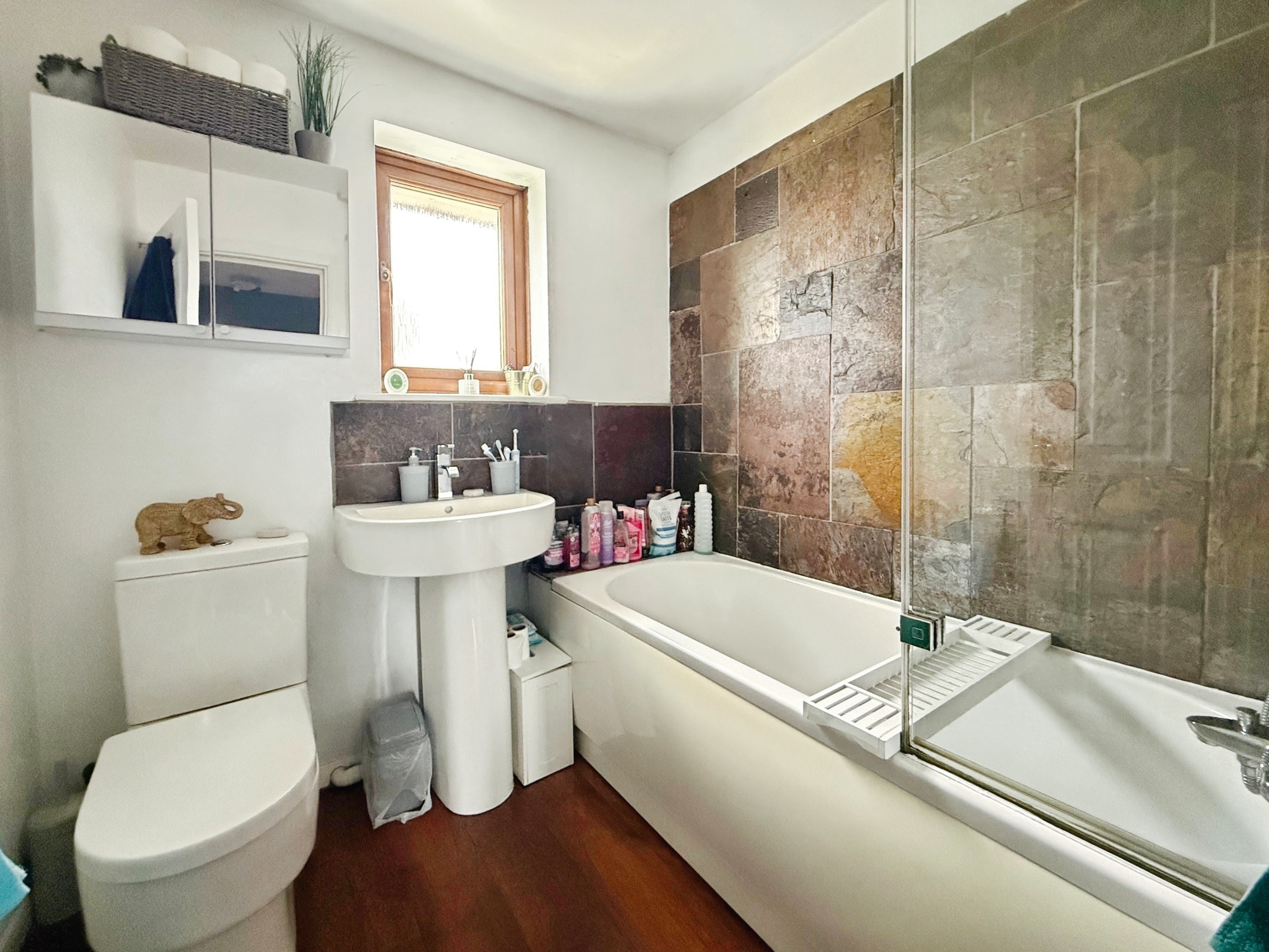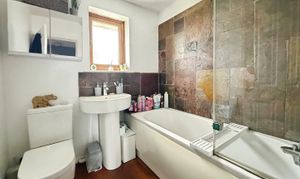 Laminate flooring, bath with shower over, low level WC, wash hand basin, double glazed window to rear with obscured glass, heated towel rail.