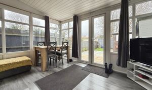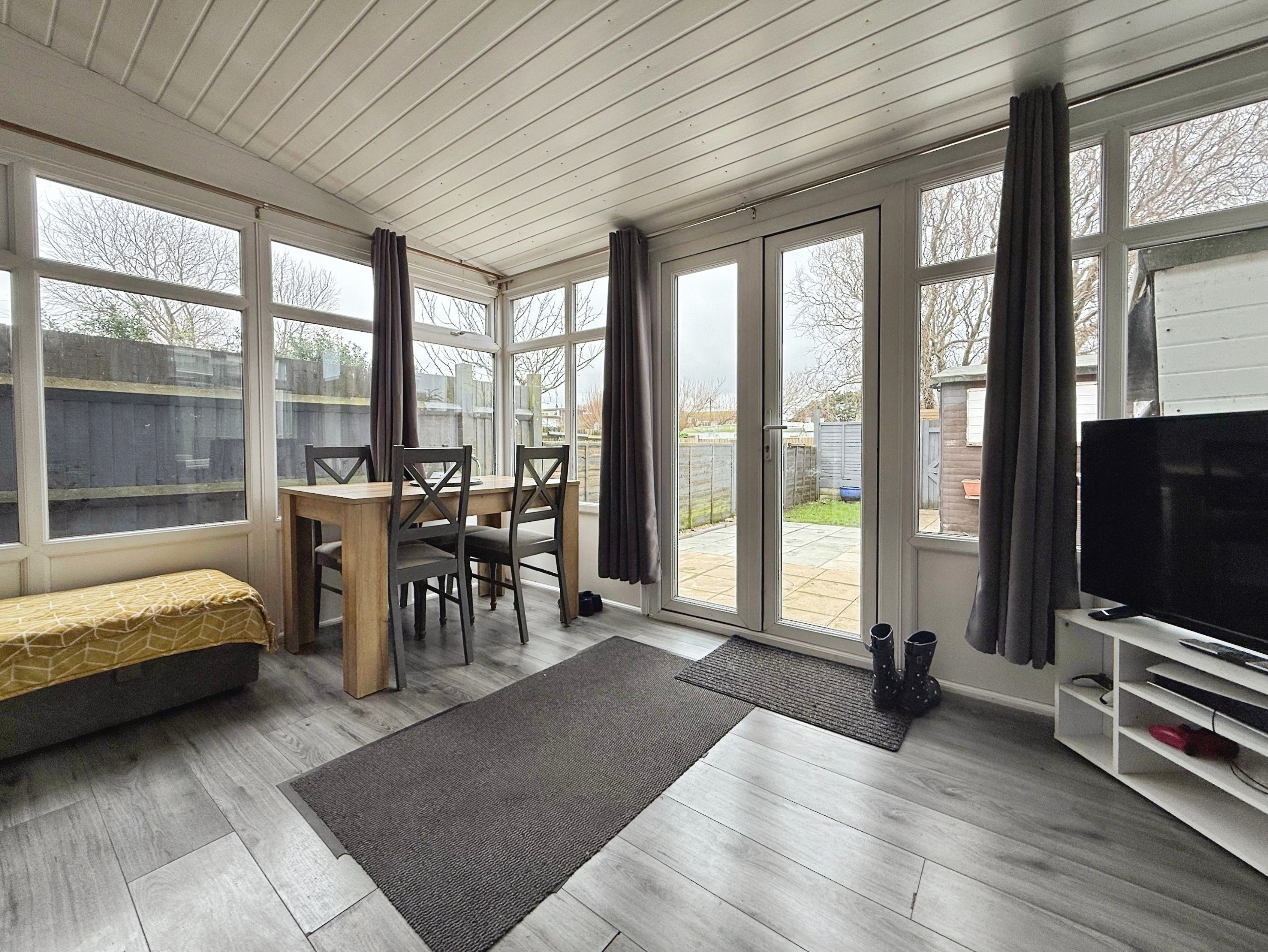 Laminate flooring, double glazed to three sides, double glazed patio doors leading to the garden.